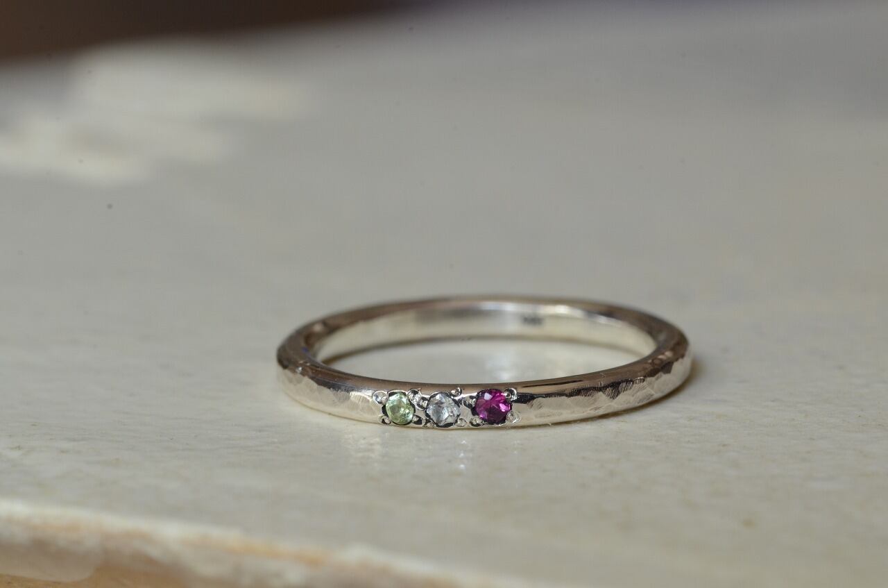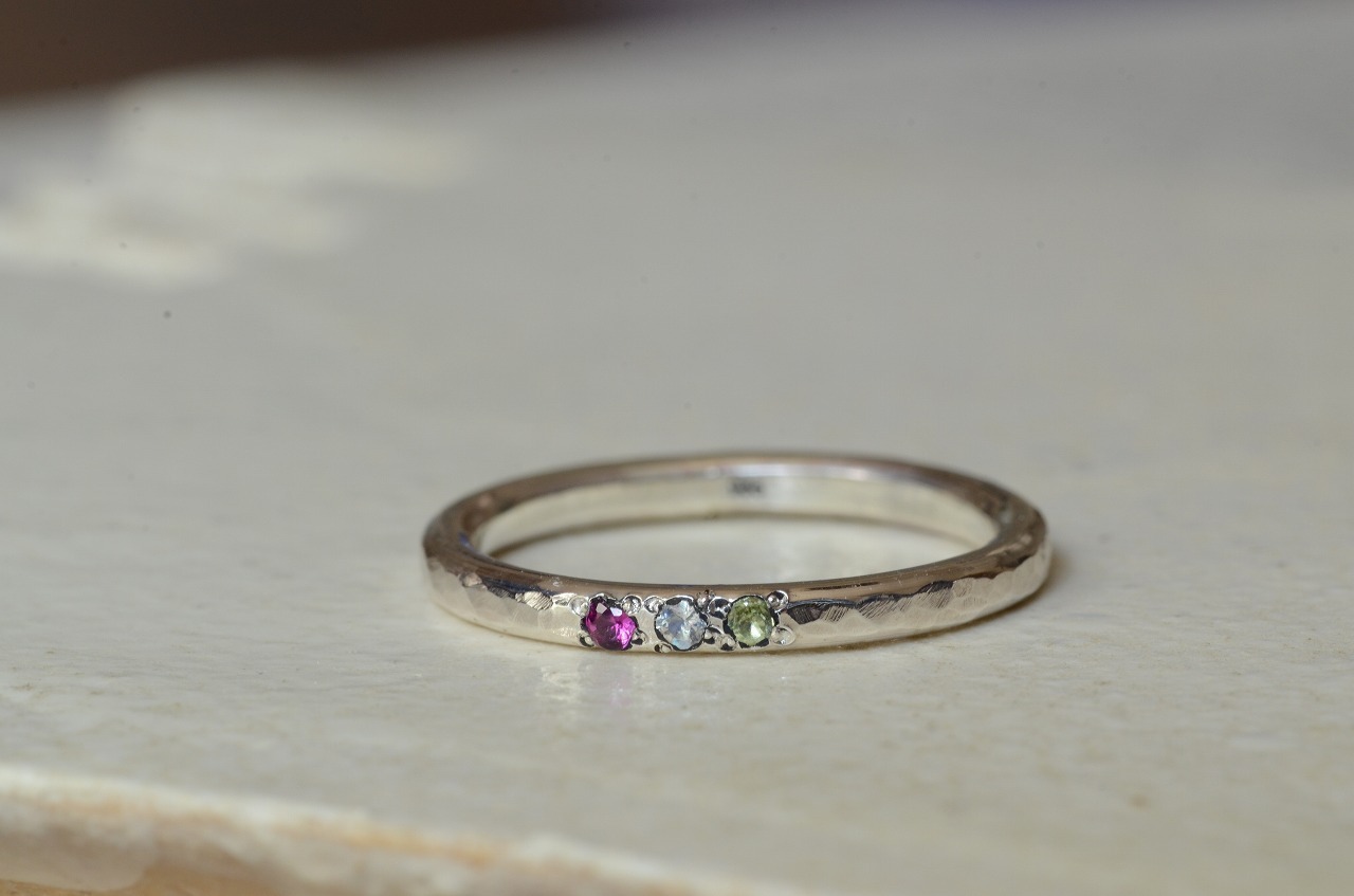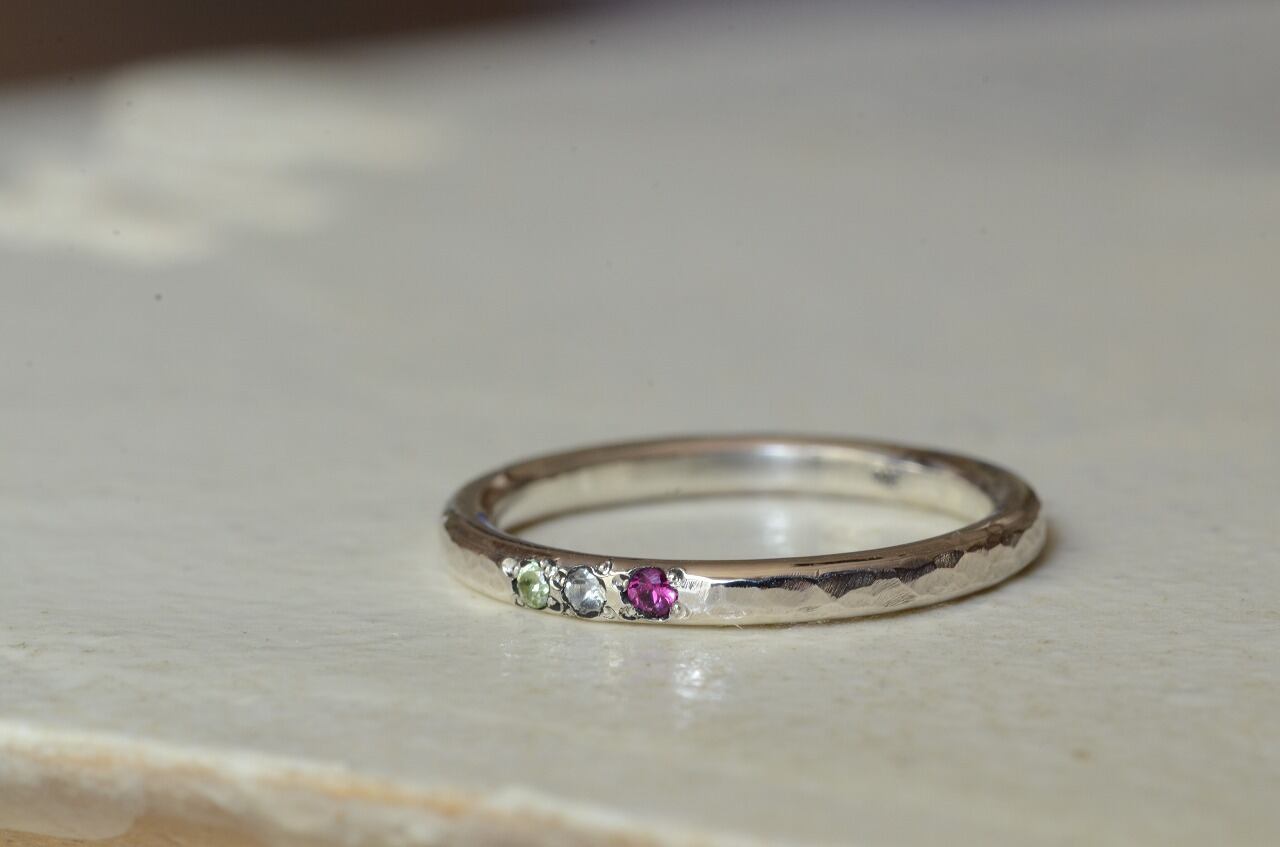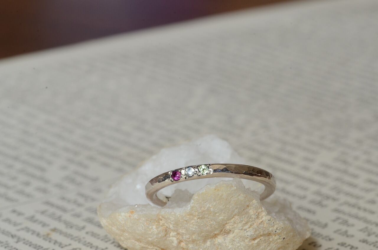赤いルビー、白いブルームーンストーン、黄緑色のペリドット、6,7,8月の誕生石を並べてさらりと身に着けられる特別感を皆様に感じてもらえたら幸いです