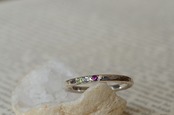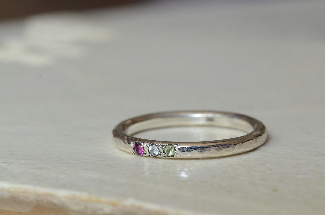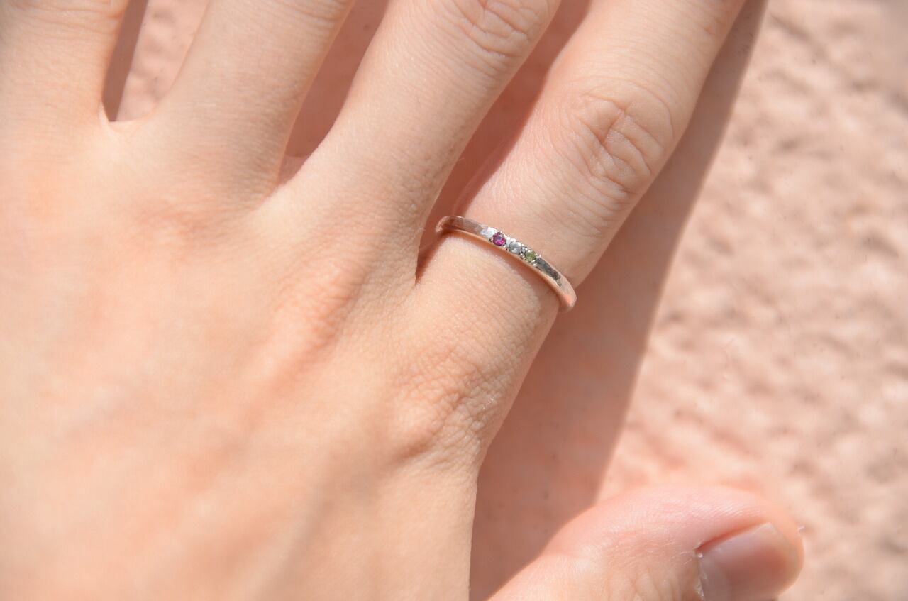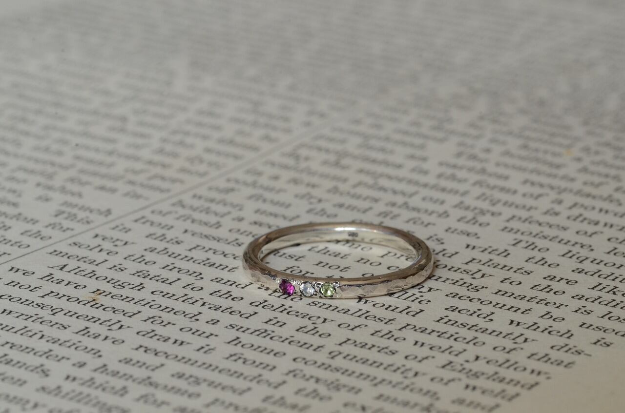 赤いルビー、白いブルームーンストーン、黄緑色のペリドット、6,7,8月の誕生石を並べてさらりと身に着けられる特別感を皆様に感じてもらえたら幸いです