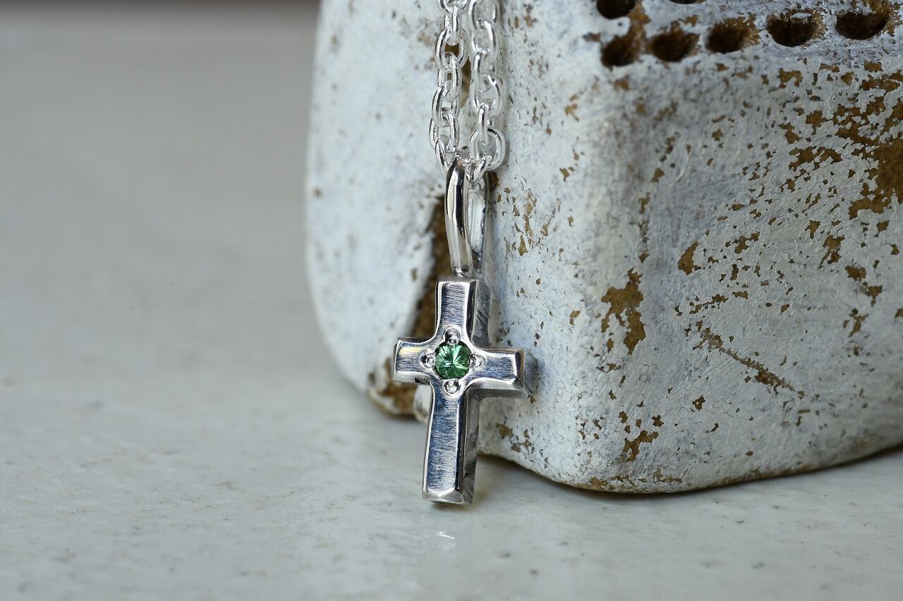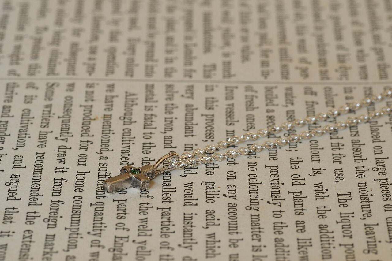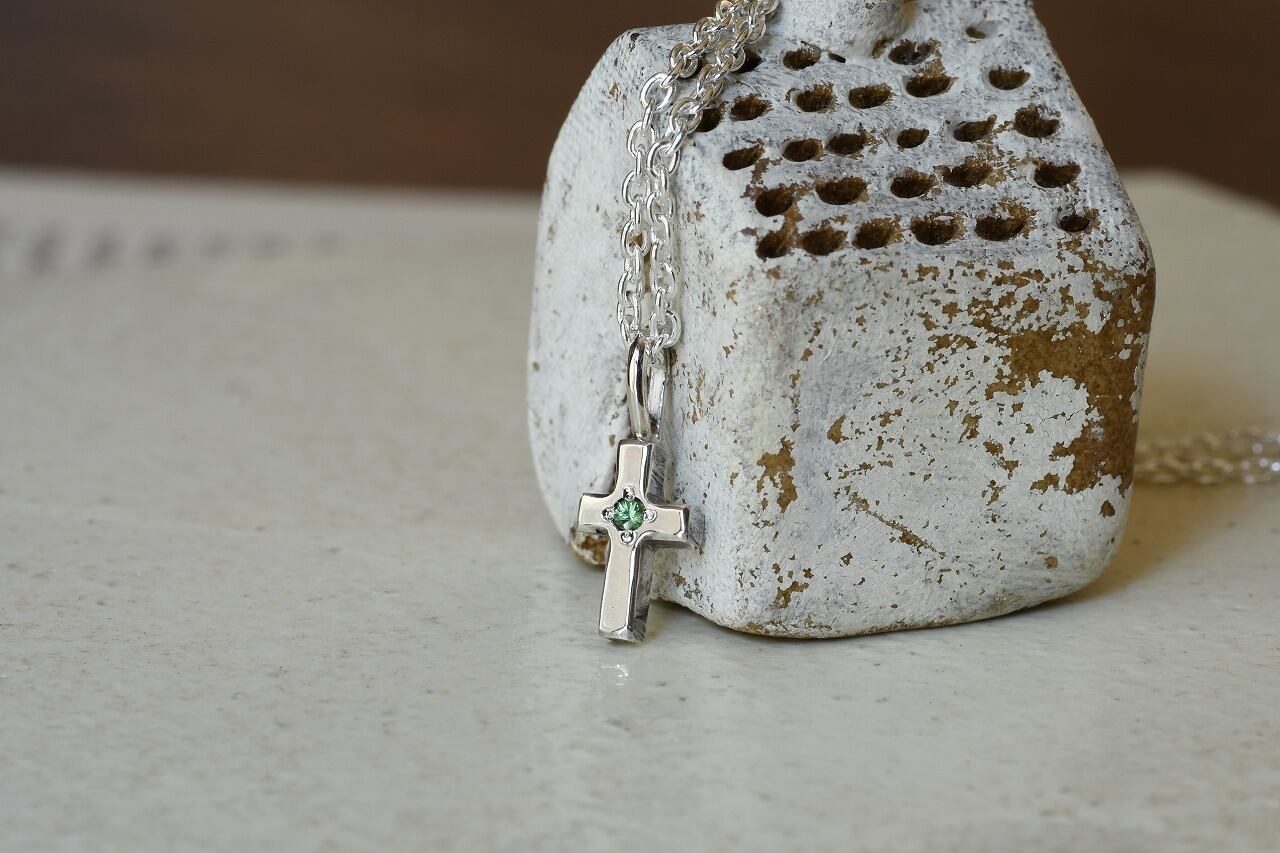 そこに一粒グリーンガーネットを留めて制作を行ったシンプルなペンダント作品になります。