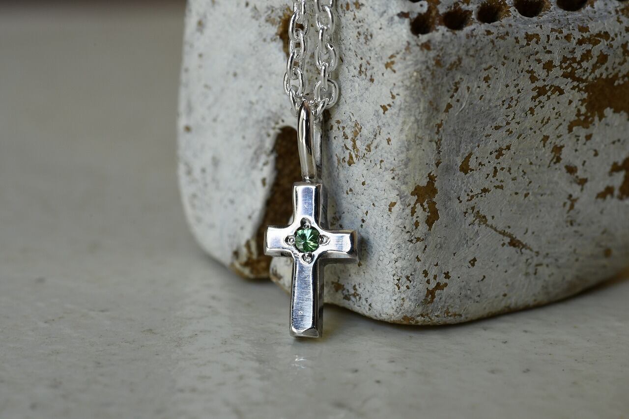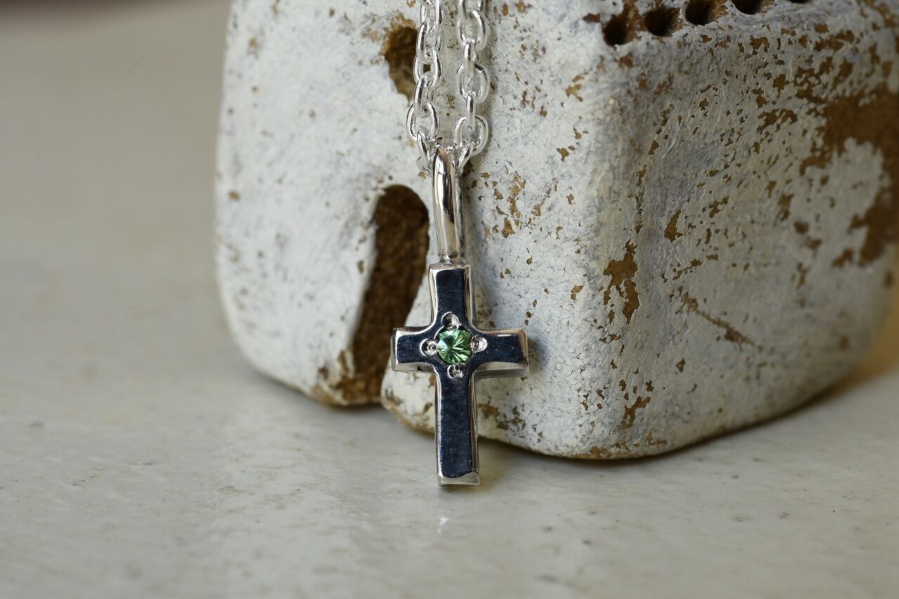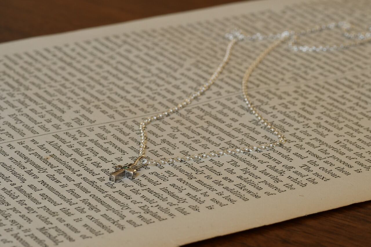 そこに一粒グリーンガーネットを留めて制作を行ったシンプルなペンダント作品になります。
