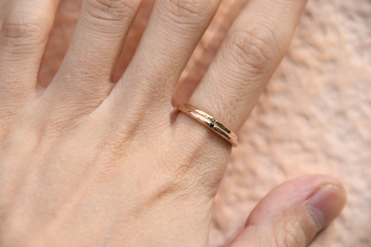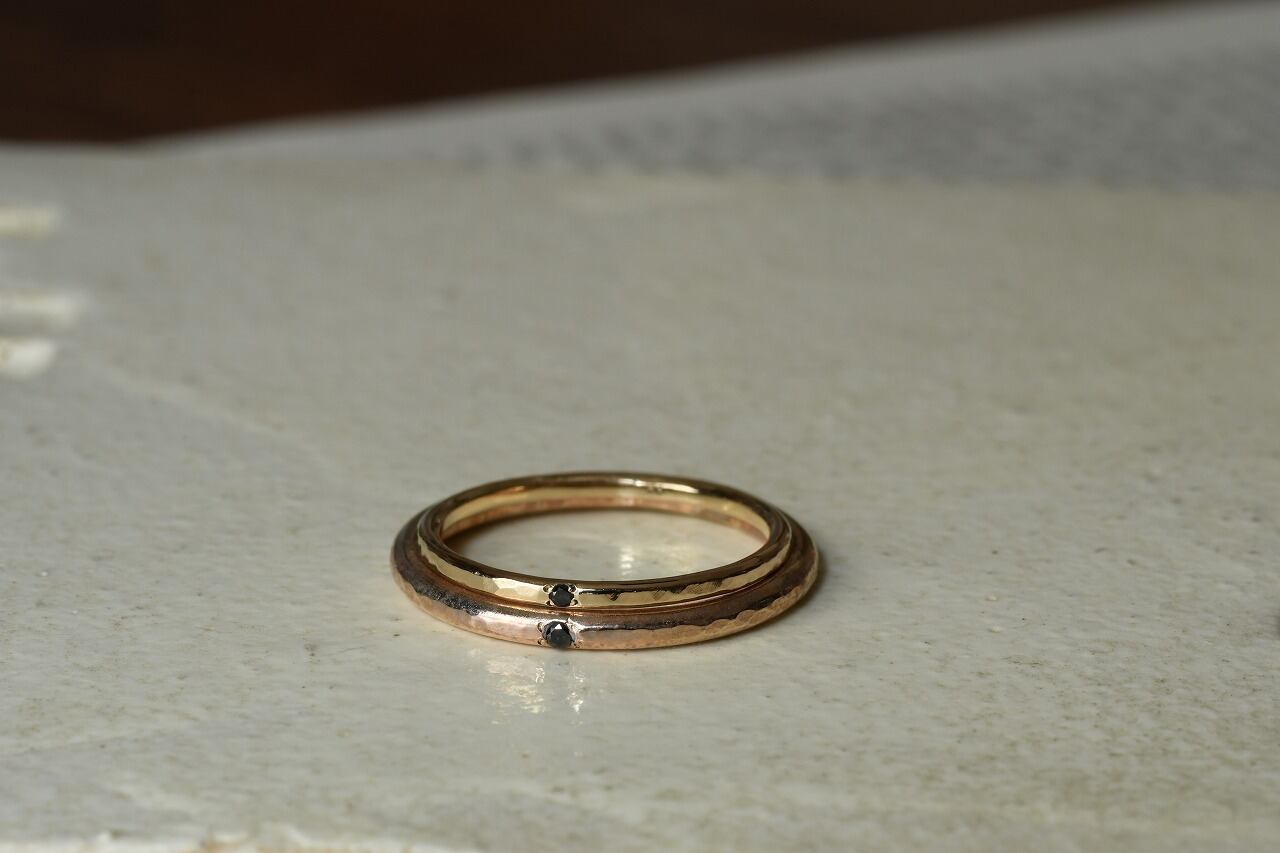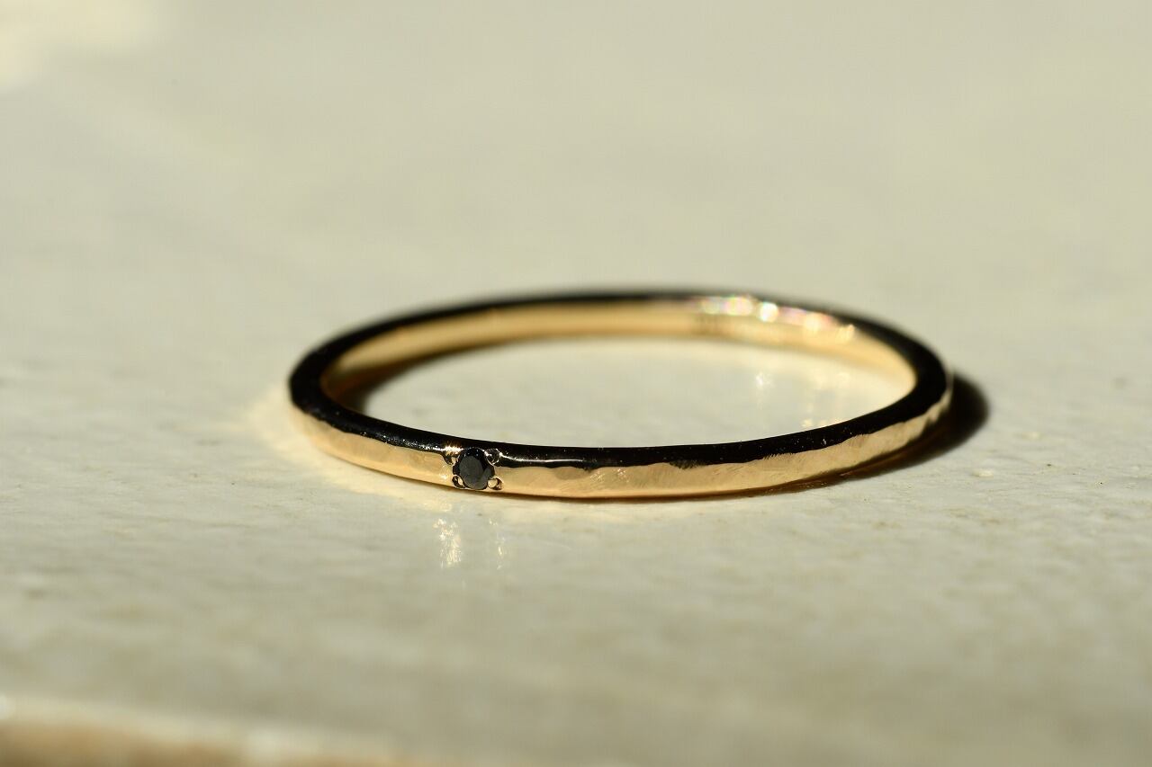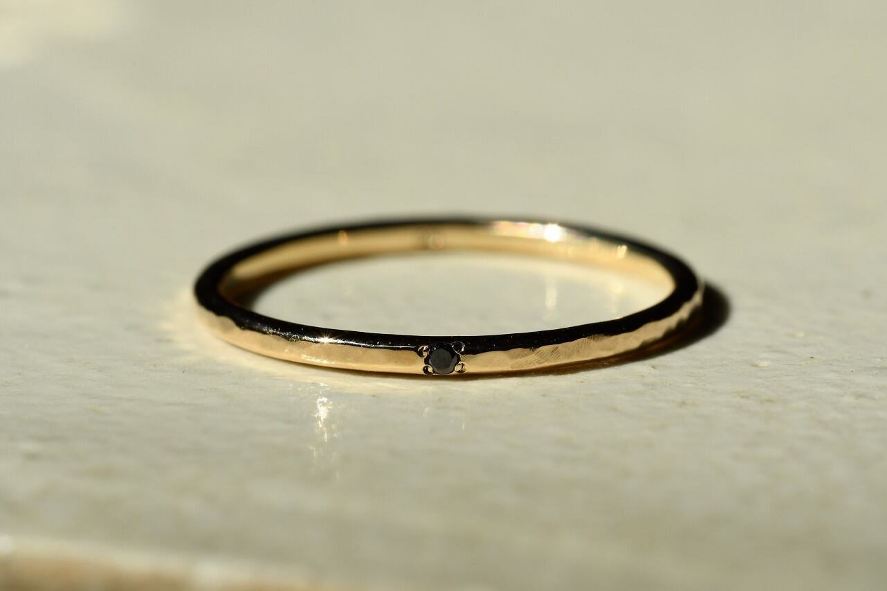 10金の明るい輝きと強さを感じるブラックダイヤモンドの輝きの二つが合わさりさりげなく身に着けつつも上品さを楽しめる作品に仕上げることができたと思っております。