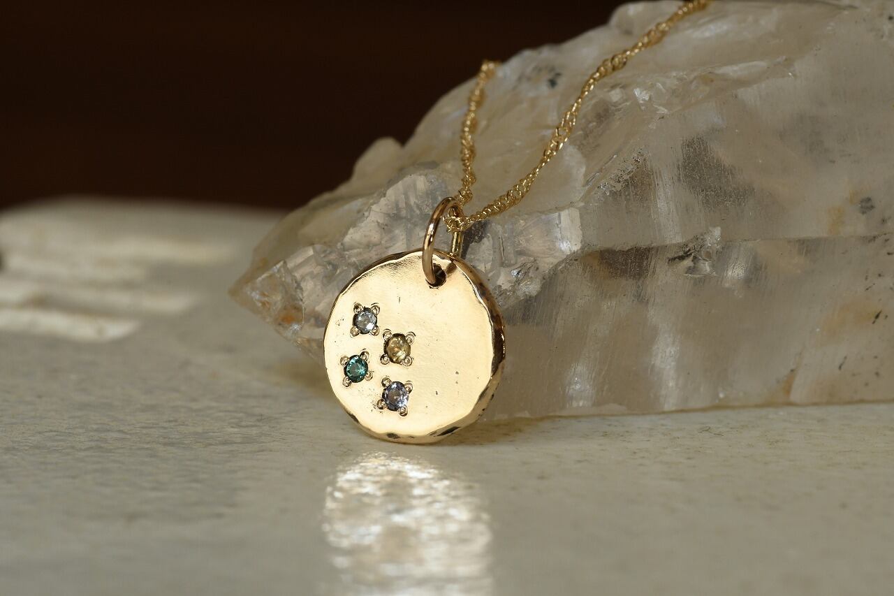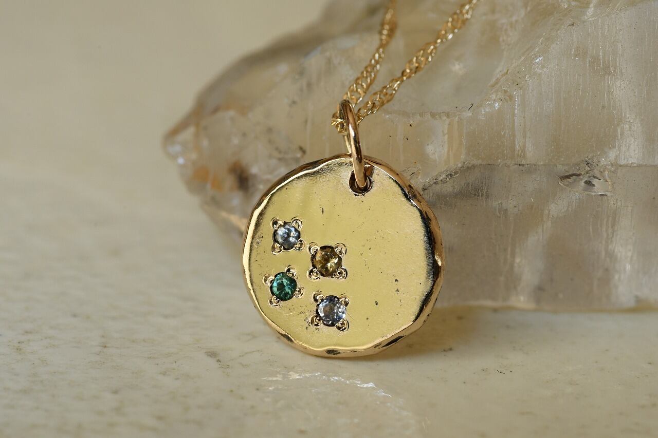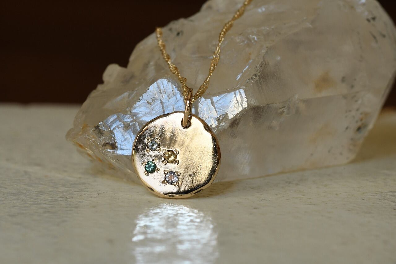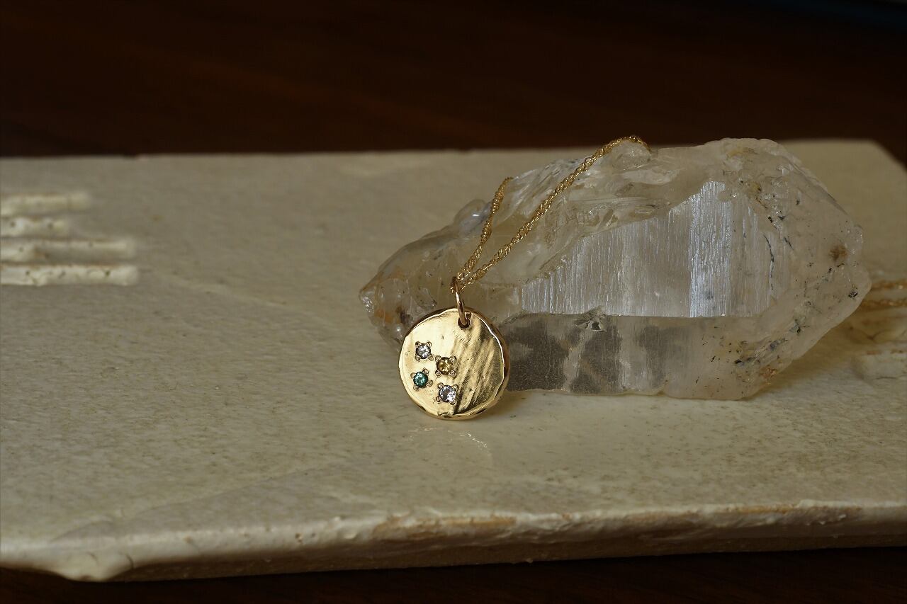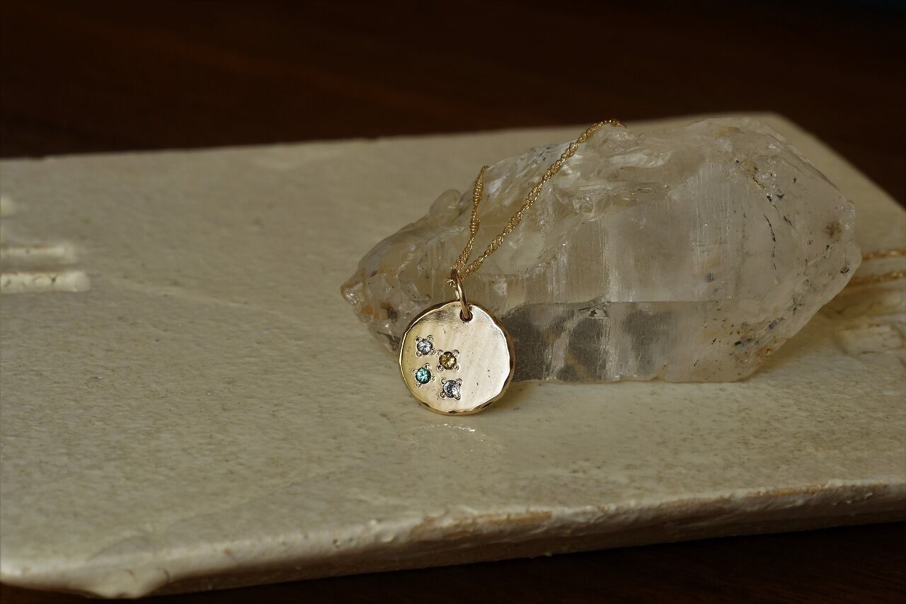 10金を溶かして叩いて丸い板にしてご依頼者様のご家族の誕生石を一粒ずつ留めて制作を行いました。
