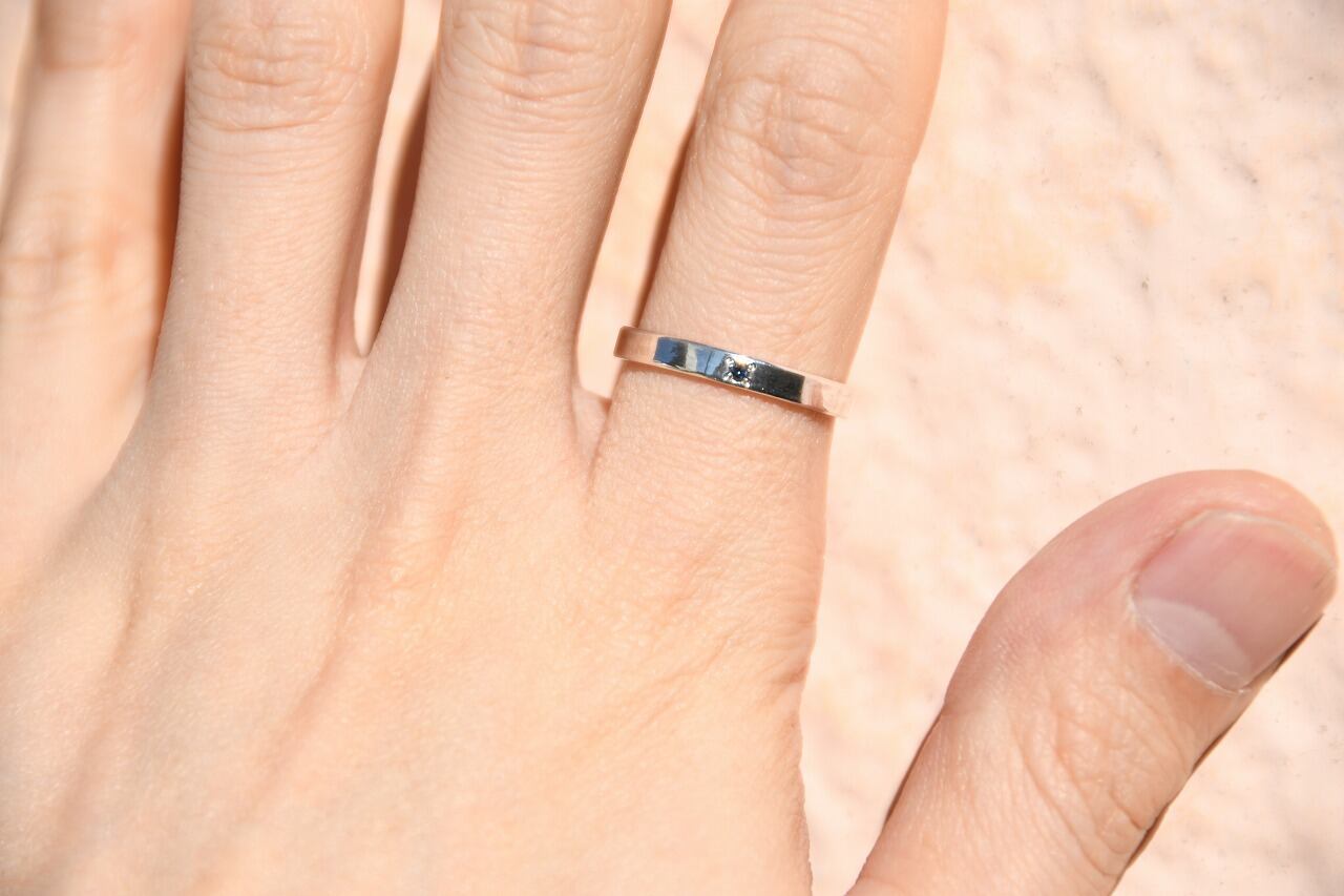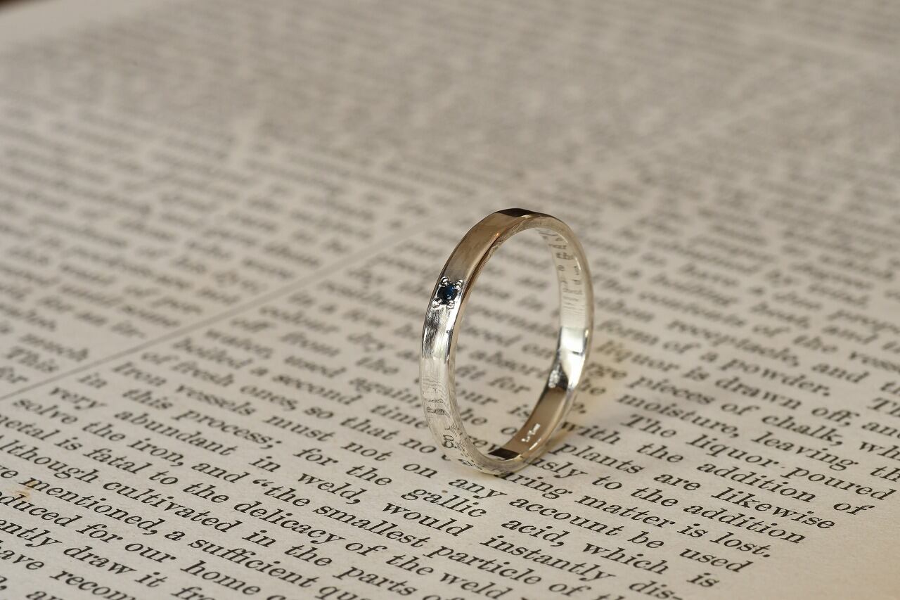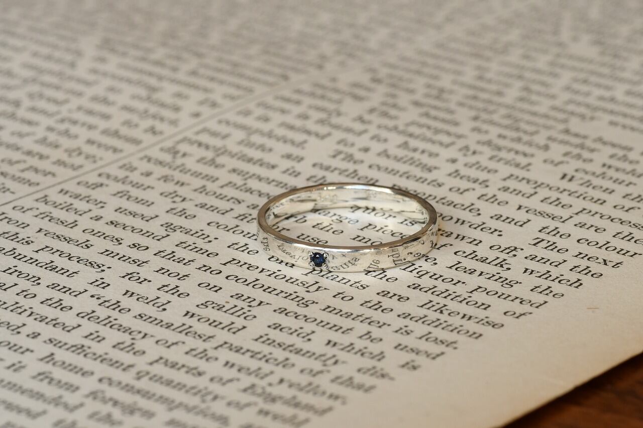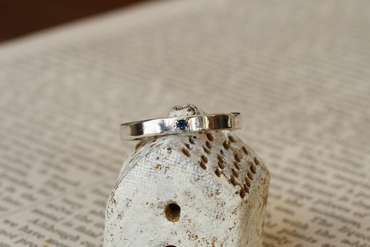 シンプルな平打ちリングに美しいサファイアを一粒留めて