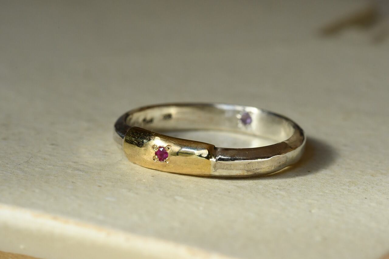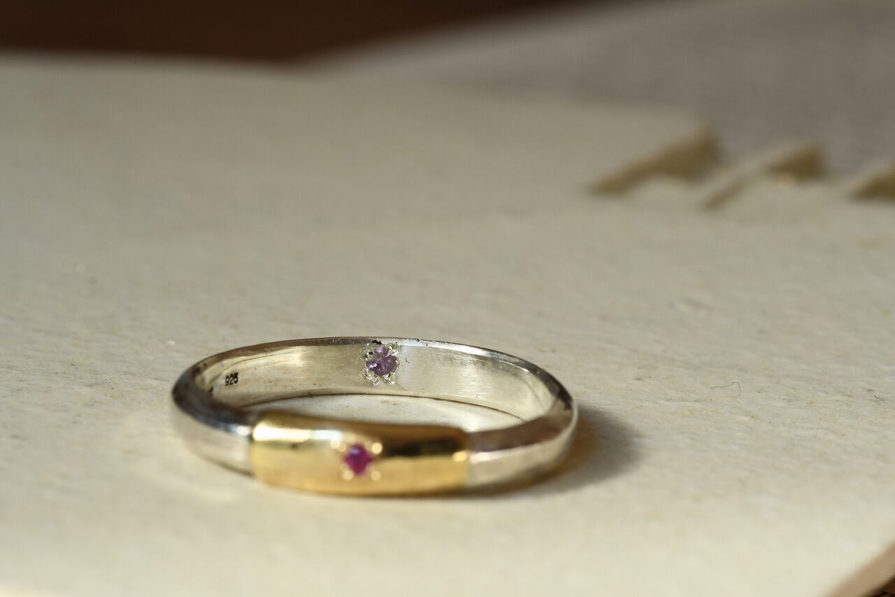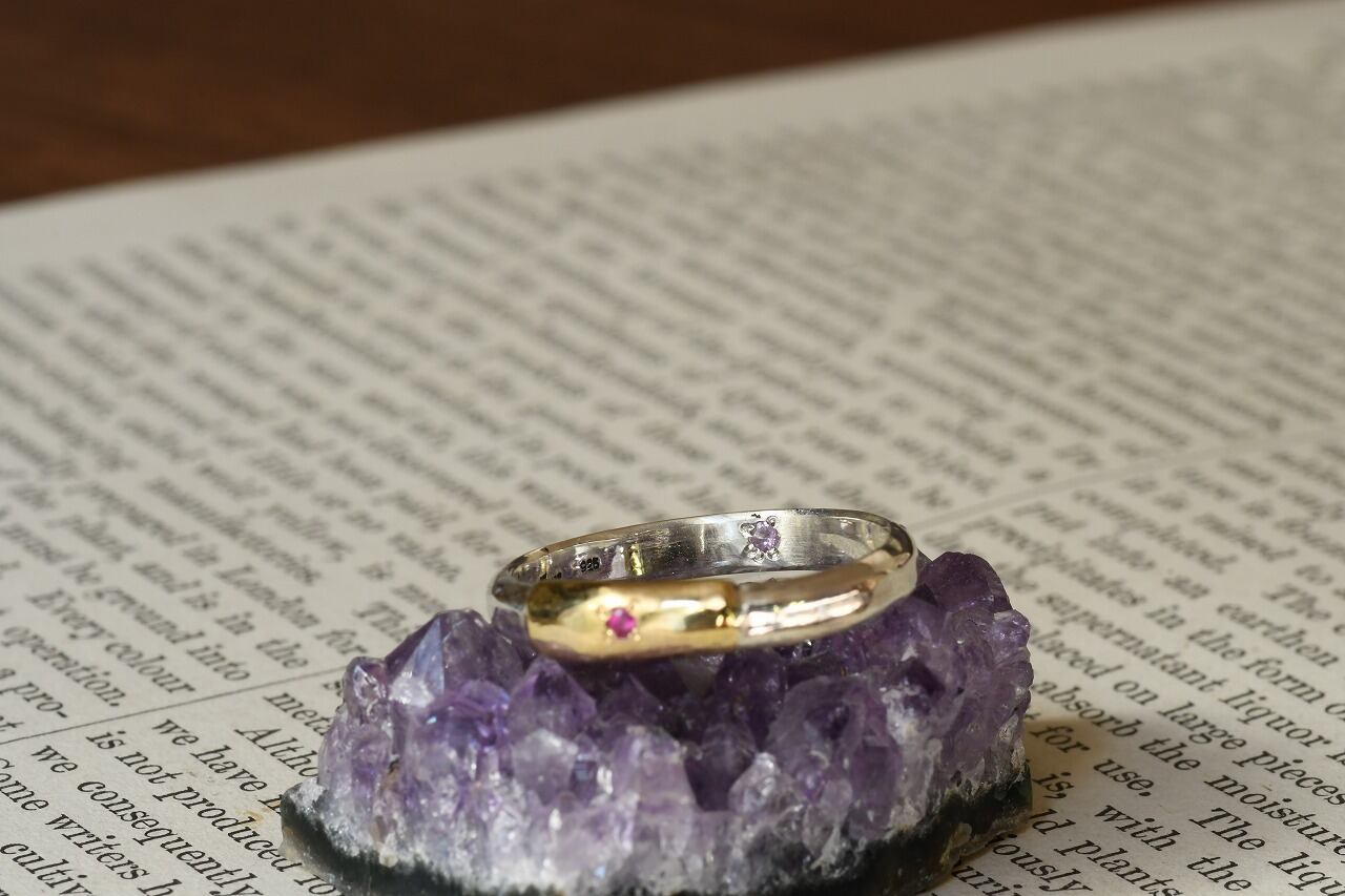 前作を制作してからお問い合わせをいただき今回は表面にルビー、裏面にアメジストを留めて制作を行いました。作品のデザインや雰囲気など他にはない作品であり、それぞれの天然石の美しい輝きもじっくり楽しめるようにしてみました。