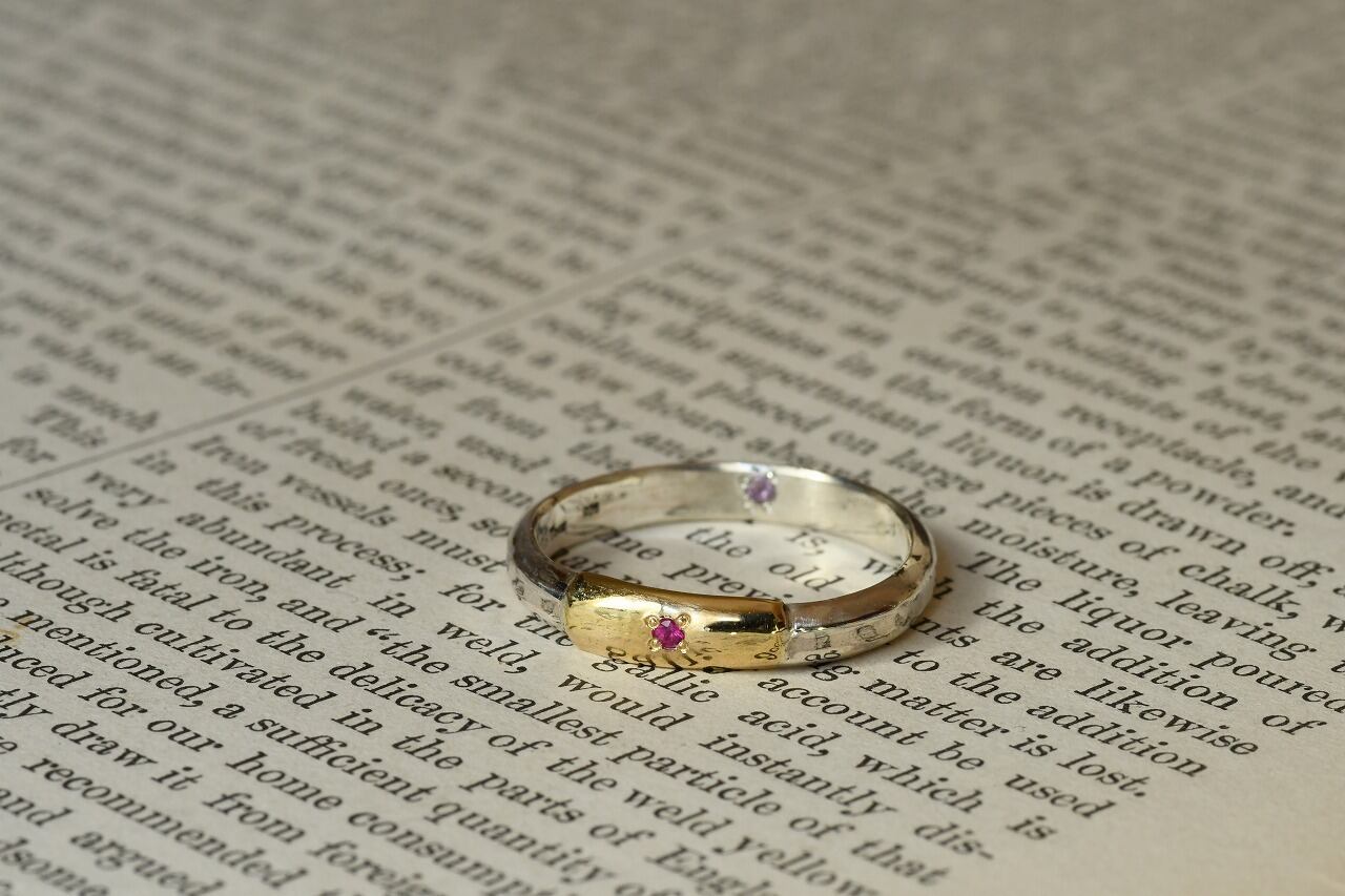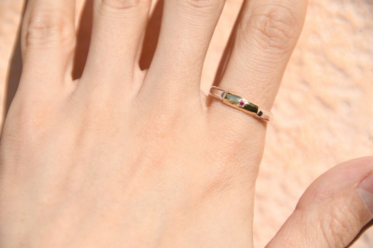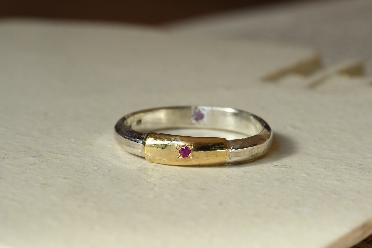 前作を制作してからお問い合わせをいただき今回は表面にルビー、裏面にアメジストを留めて制作を行いました。作品のデザインや雰囲気など他にはない作品であり、それぞれの天然石の美しい輝きもじっくり楽しめるようにしてみました。