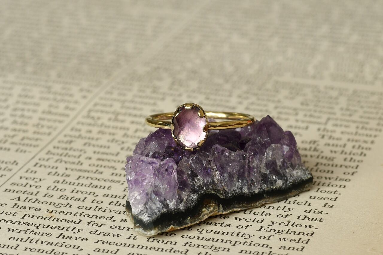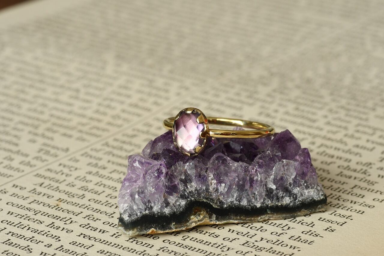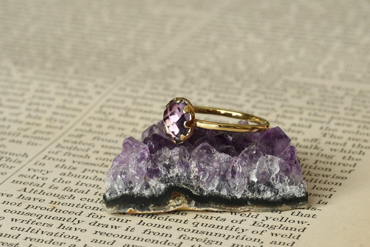 2月の誕生石であるアメジストはその透明な紫色の輝きが最大の特徴で、古来、エジプトやユダヤ教、キリスト教世界などで装飾品などに使われ、特にキリスト教世界では司教の石といわれ全員がこの指輪をはめていたといわれています。石の効力は調和と調整と統合の力がつよく、人の精神状態を安定の方向へ導き自分自身の内面的調和と統合だけでなく他人との調和をとるのにも大きな効力を発揮します。古くから「酔わない」と伝えれれていますが、酒に酔わないというよりも、感情の乱れに流されないという側面が強いような気がします。