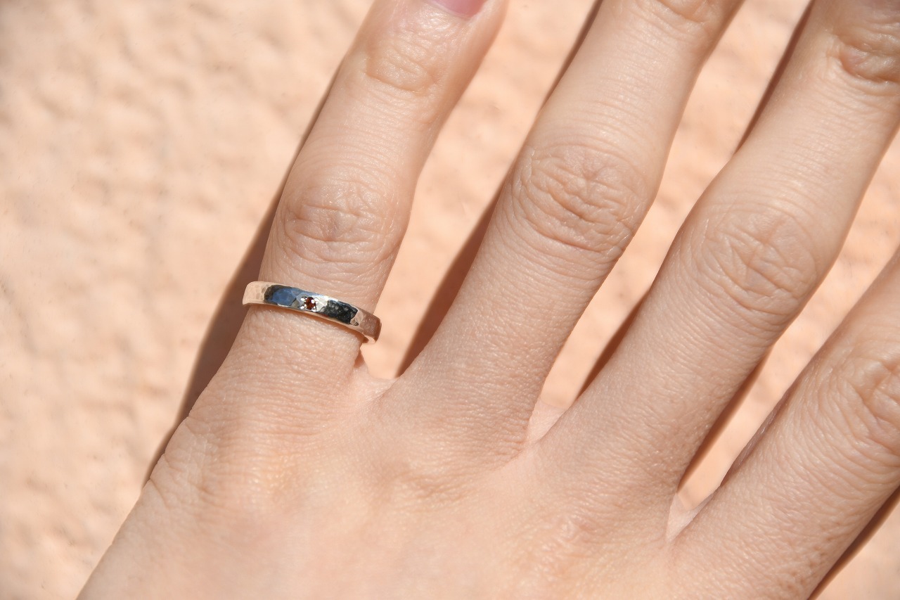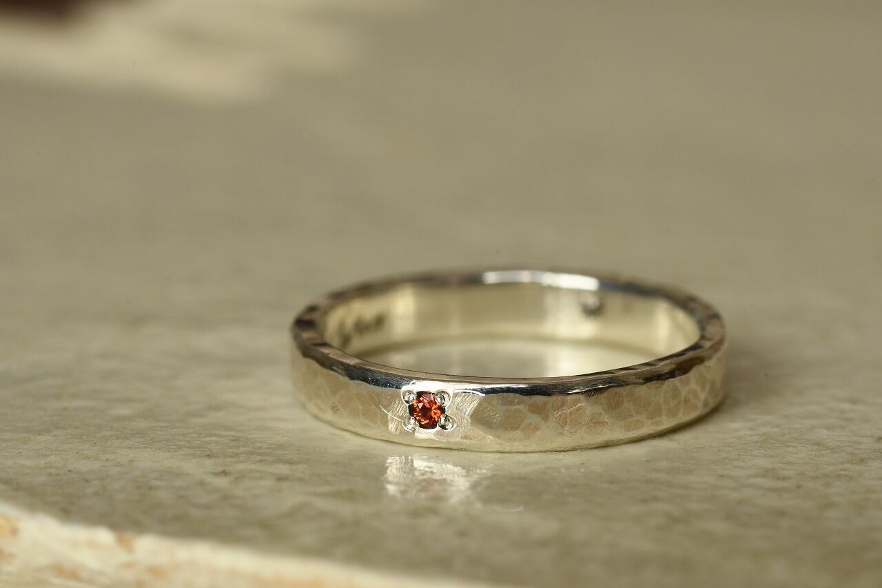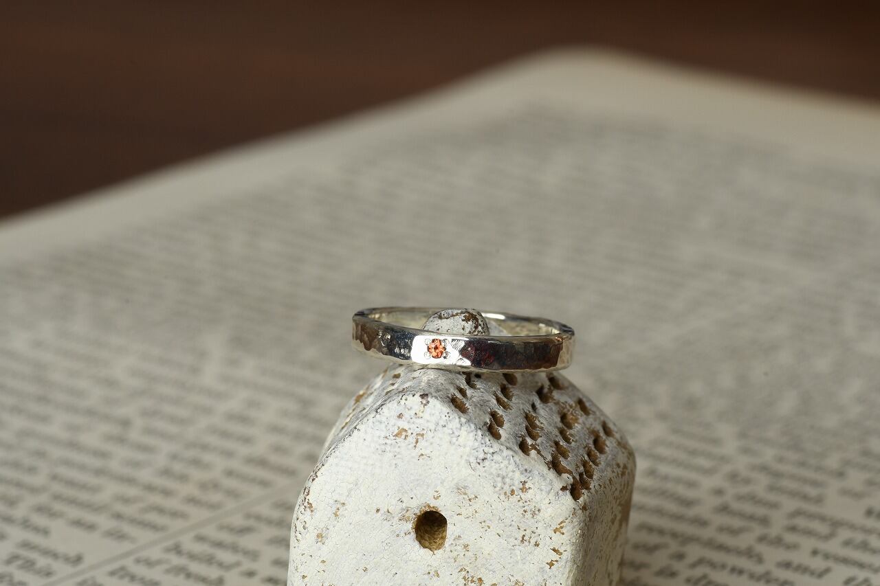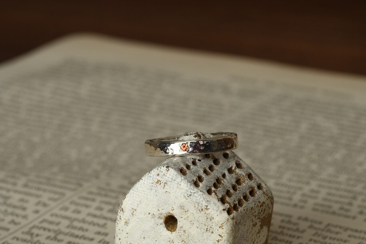 シンプルな平打ちの槌目リングに美しいオレンジサファイアを一粒留めて