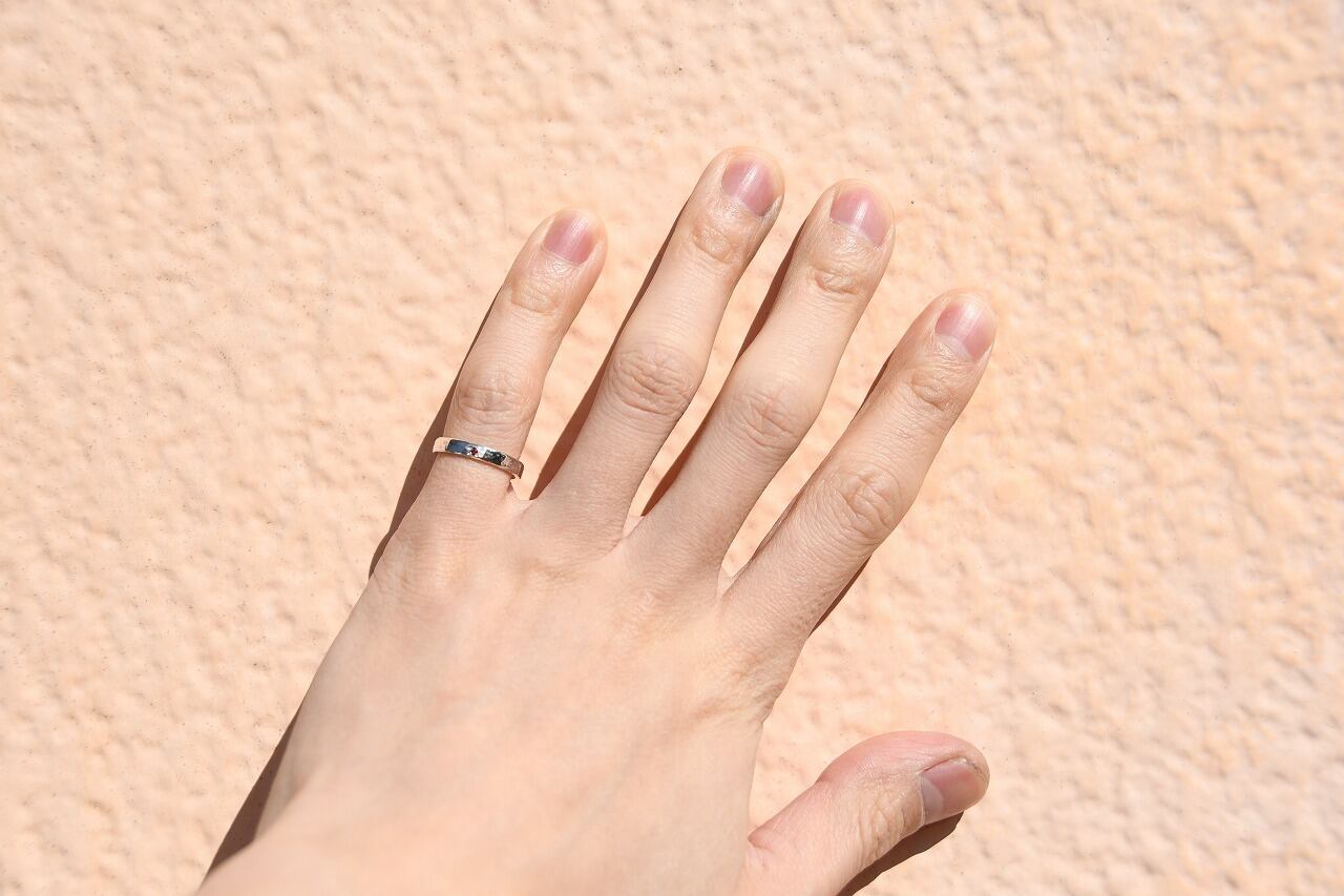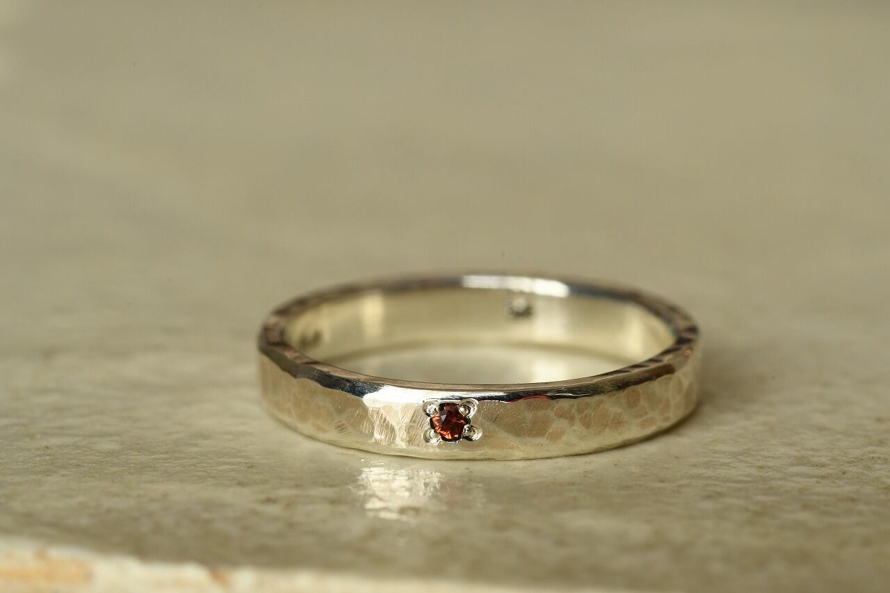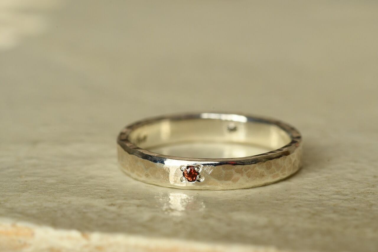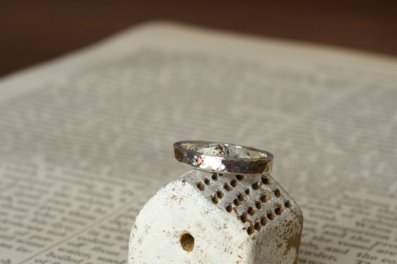 シンプルな平打ちの槌目リングに美しいオレンジサファイアを一粒留めて
