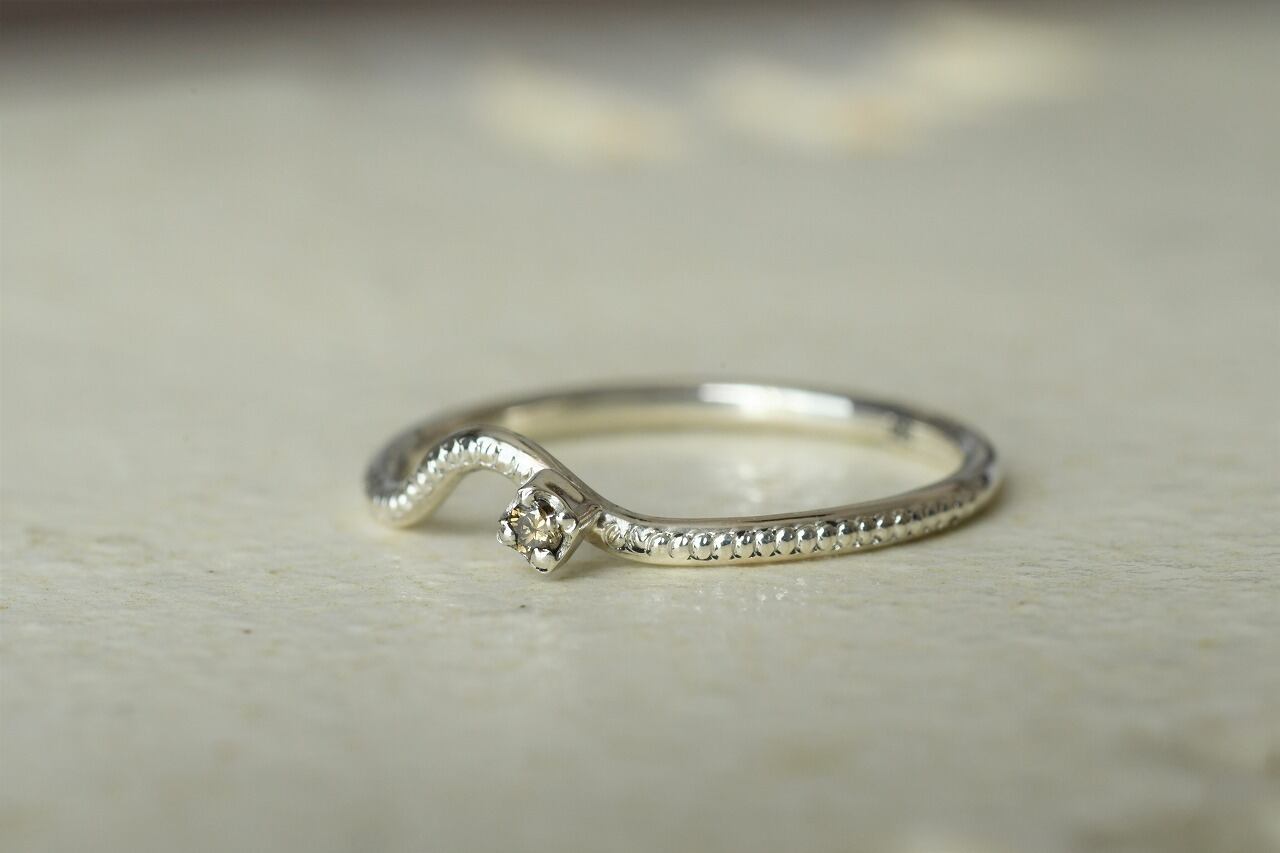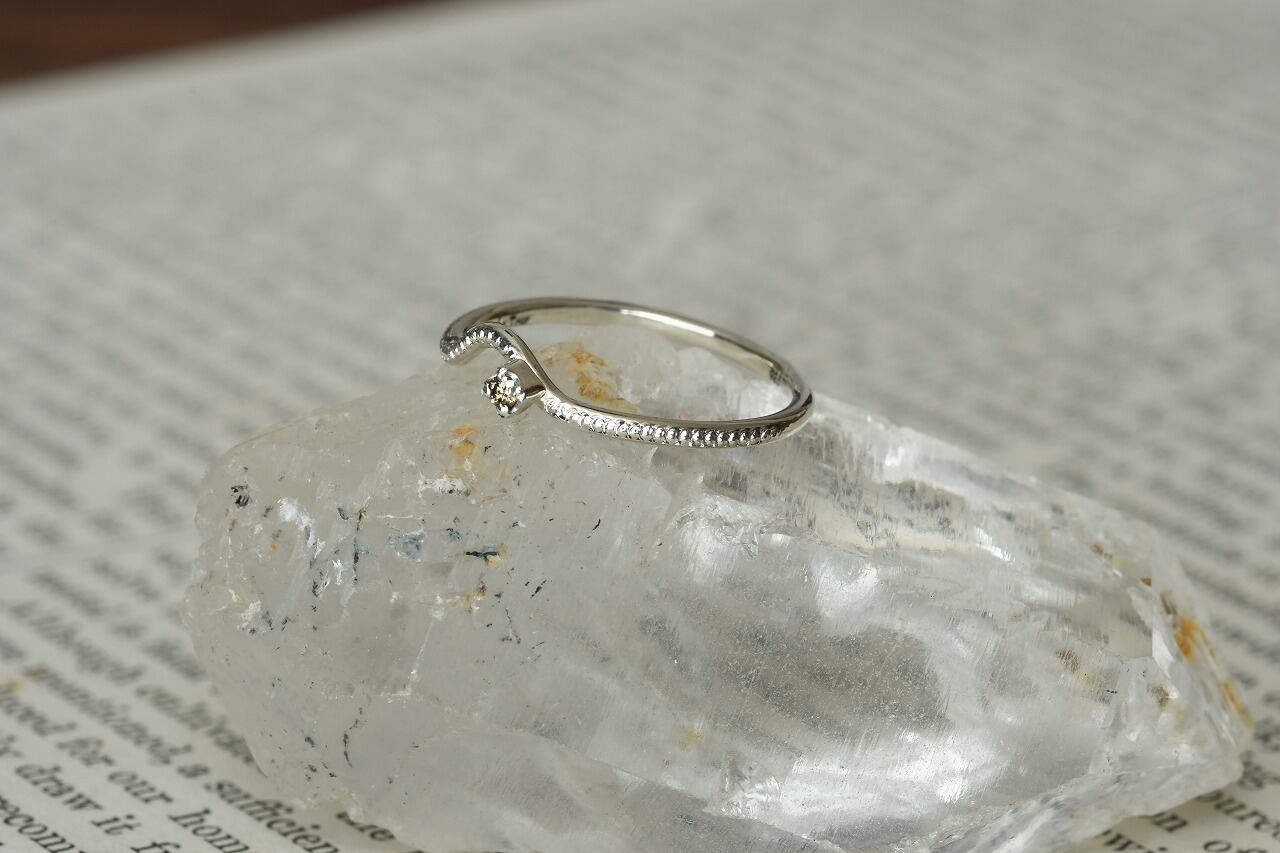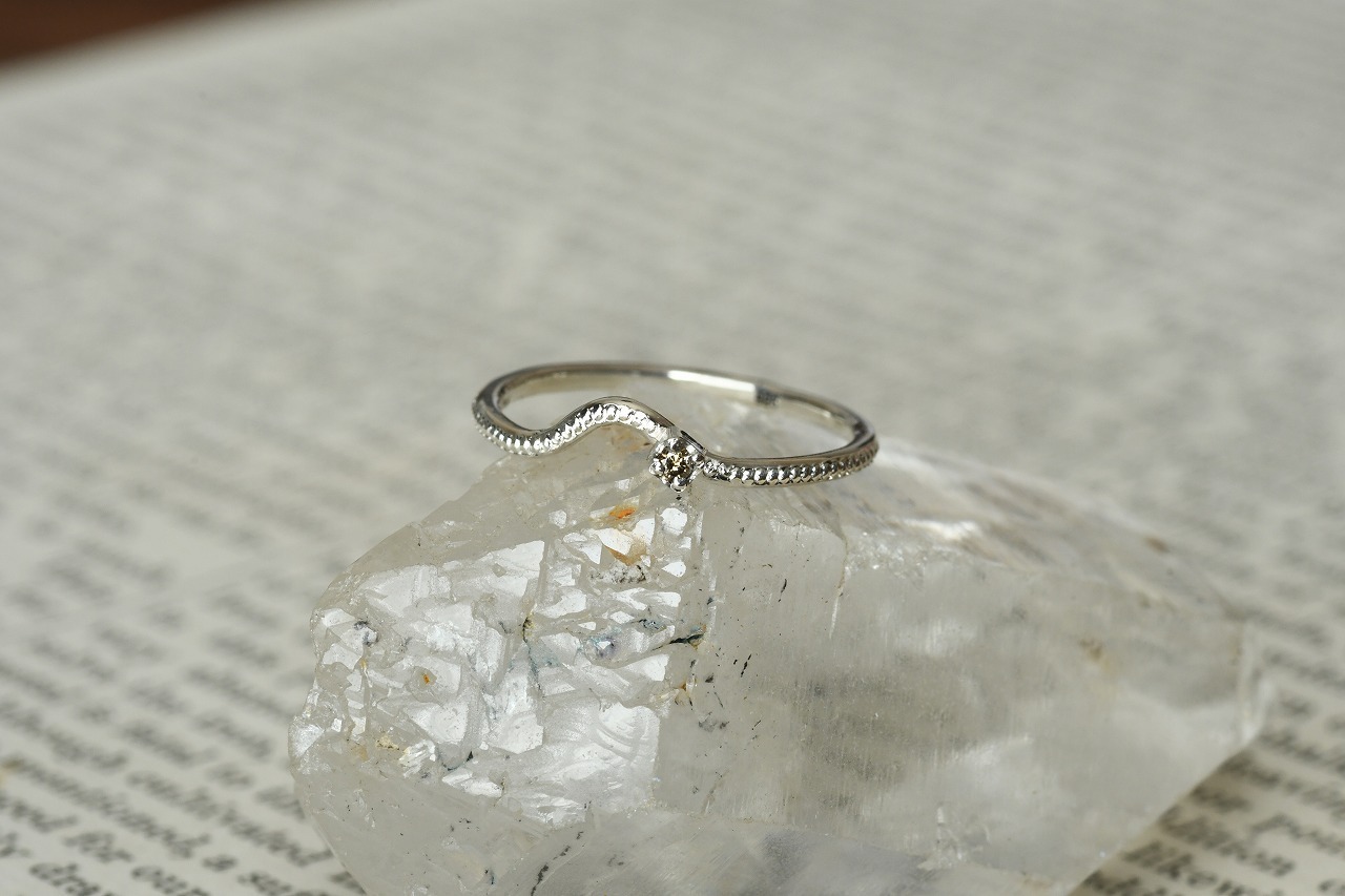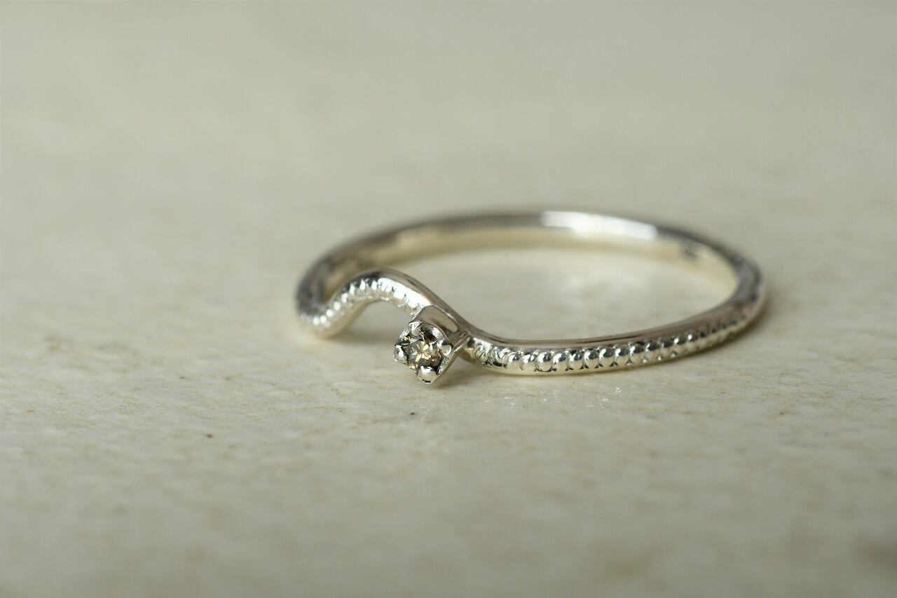 曲げを行ったリングにミルを打ってそこに一粒石を留めた作品になります。