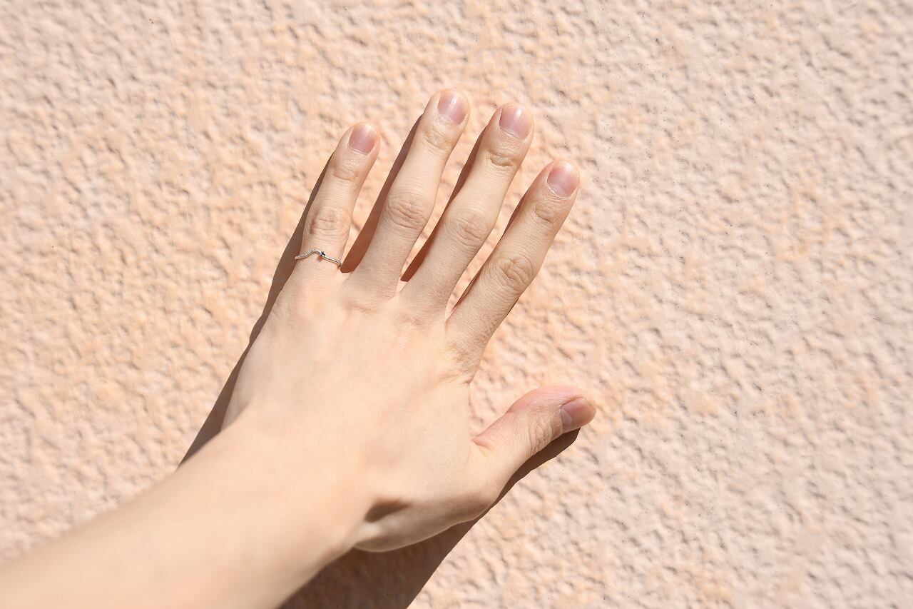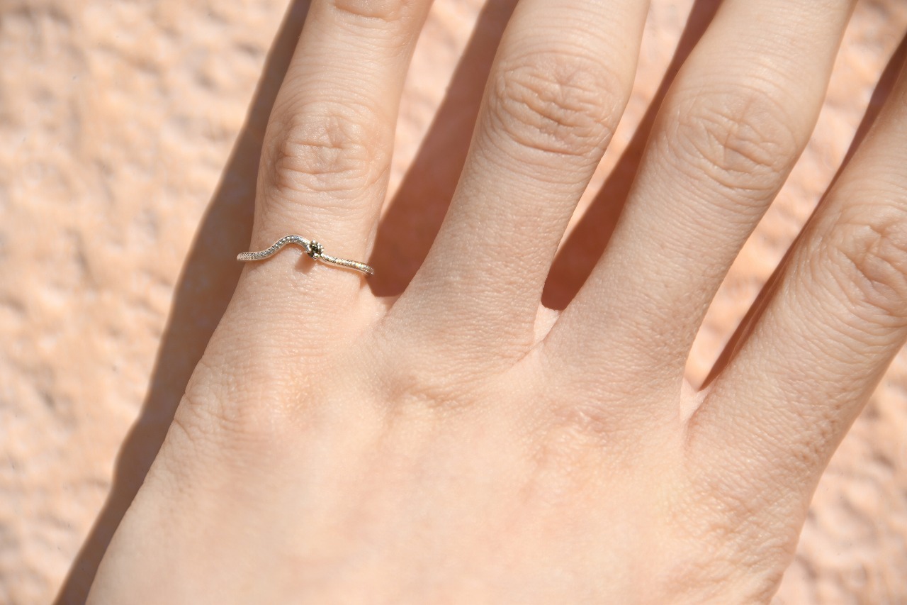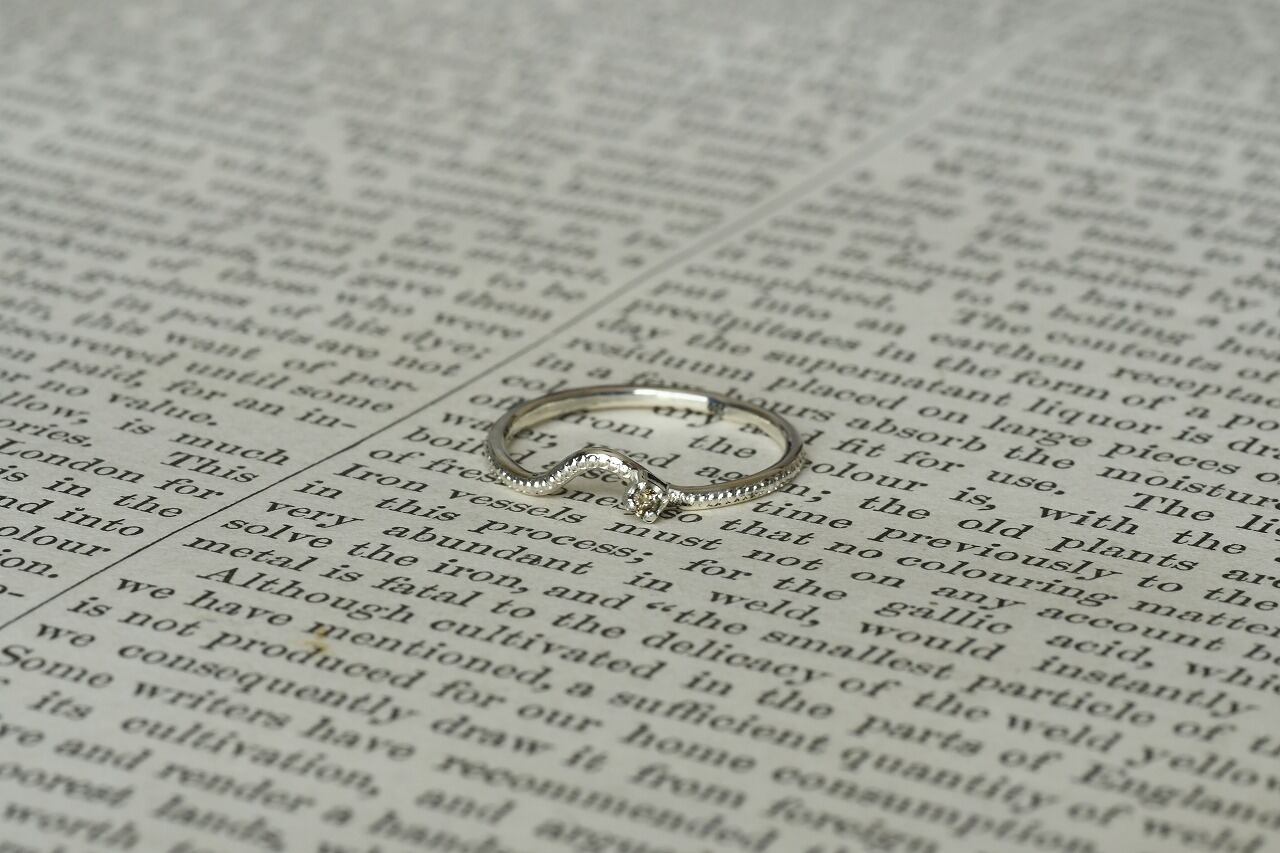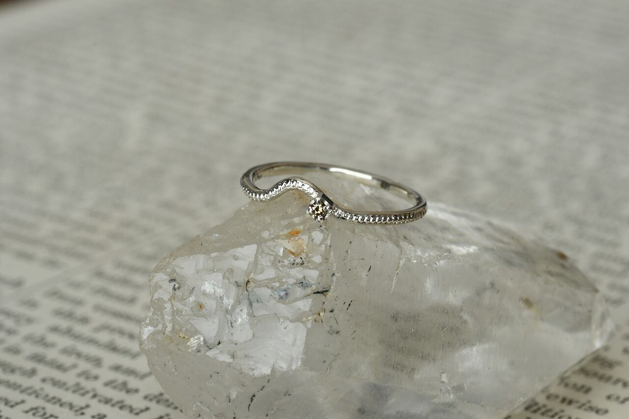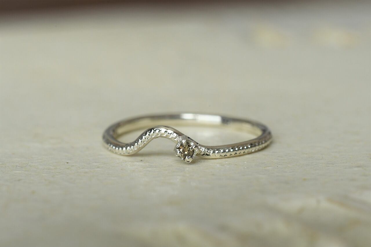 曲げを行ったリングにミルを打ってそこに一粒石を留めた作品になります。