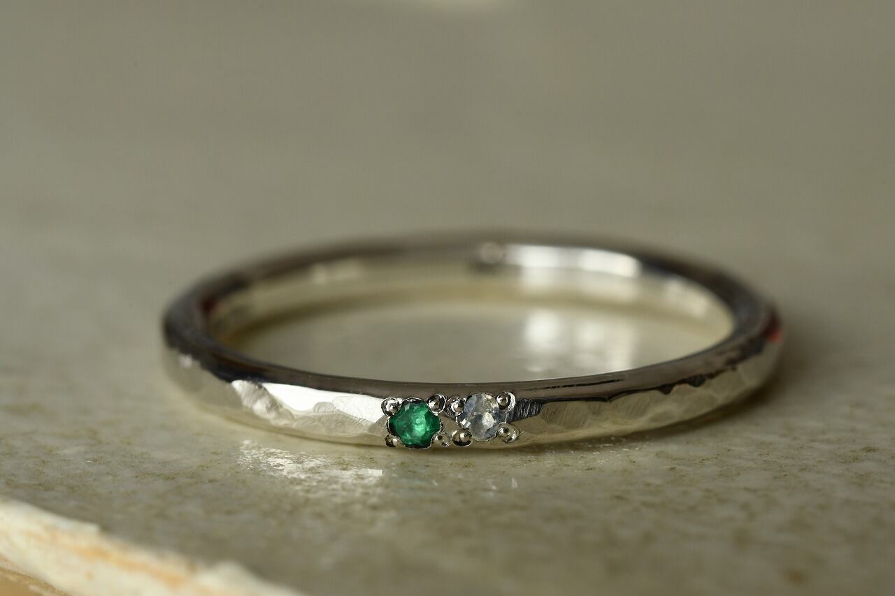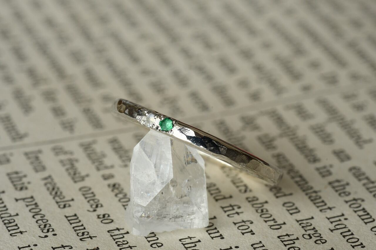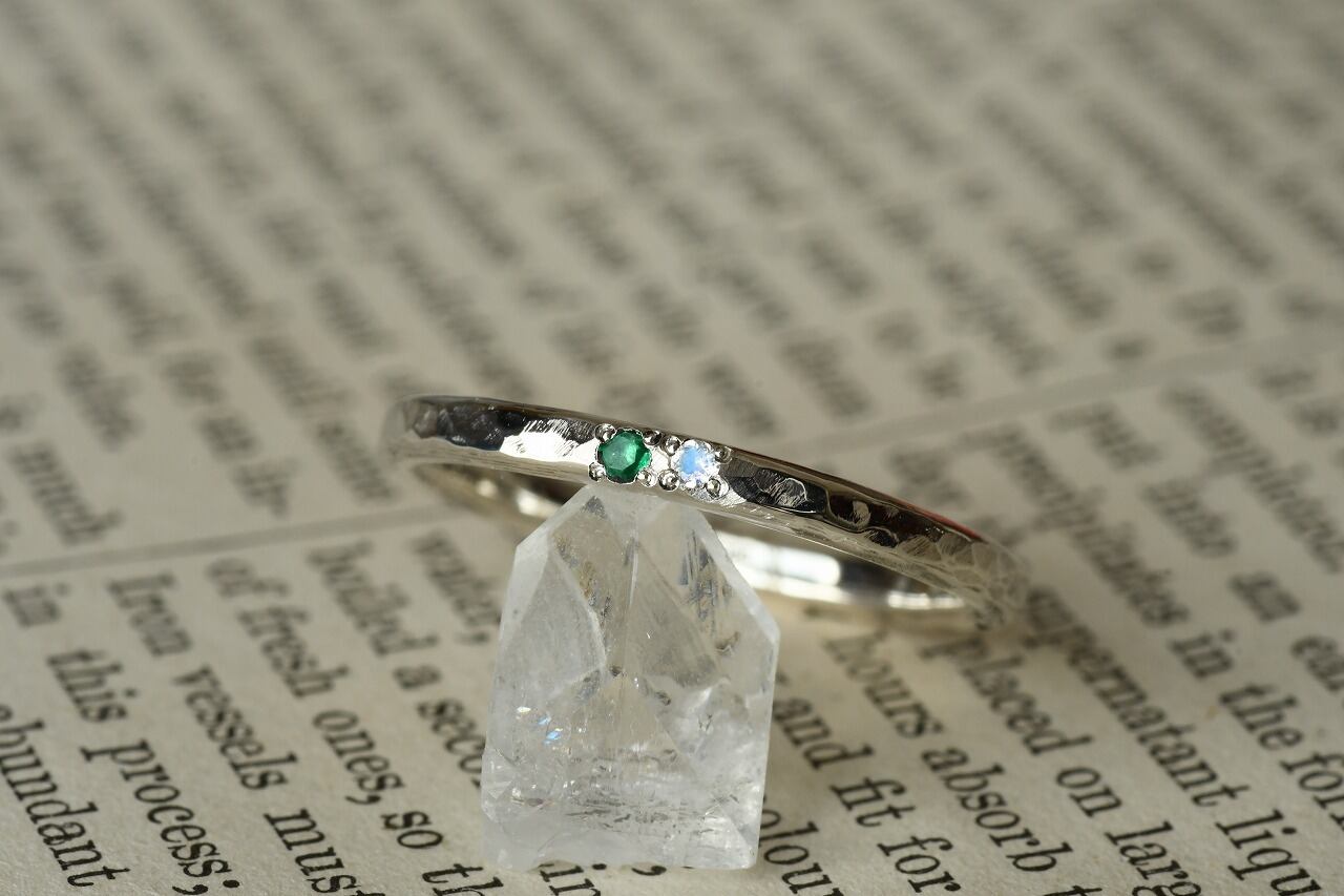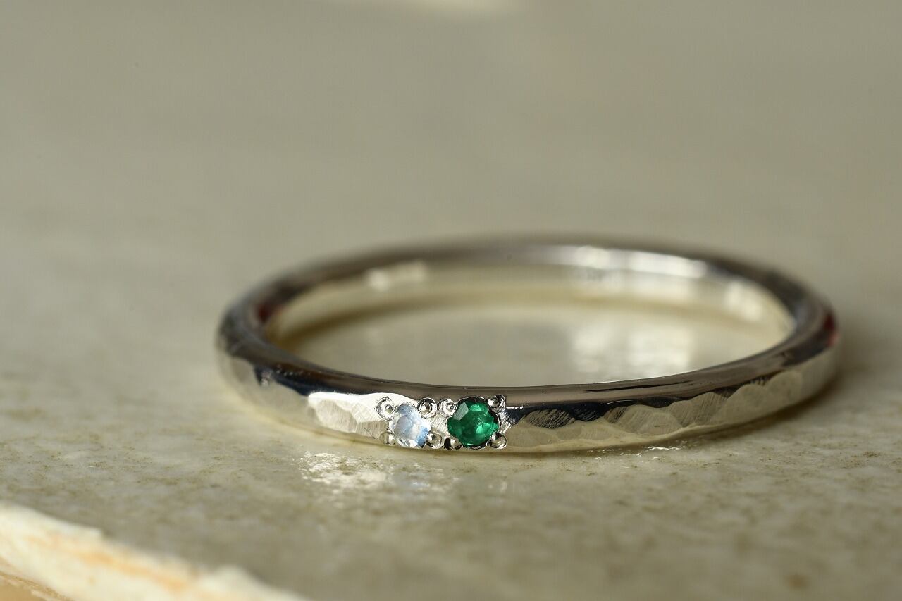今回はシルバーの槌目リングをベースにエメラルドとブルームーンストーンを組み合わせて制作を行いました。はっきりとした色味が特徴のエメラルドとどの石に合わせても身に着けやすいブルームーンストーンの組み合わせ。