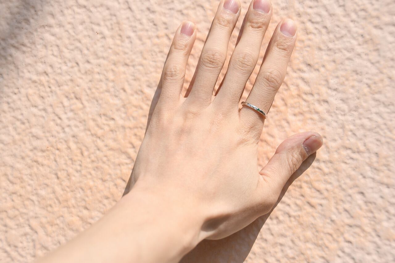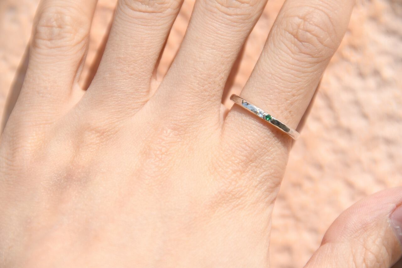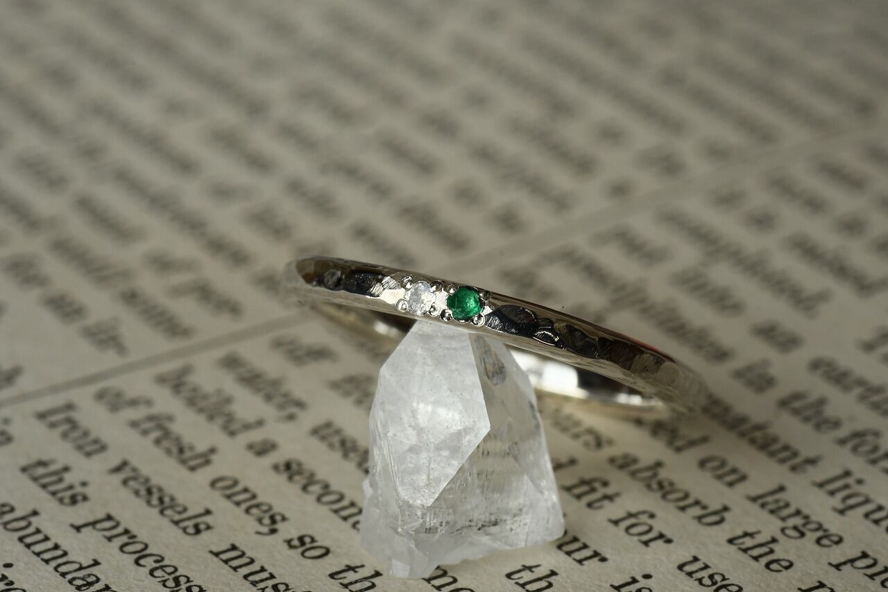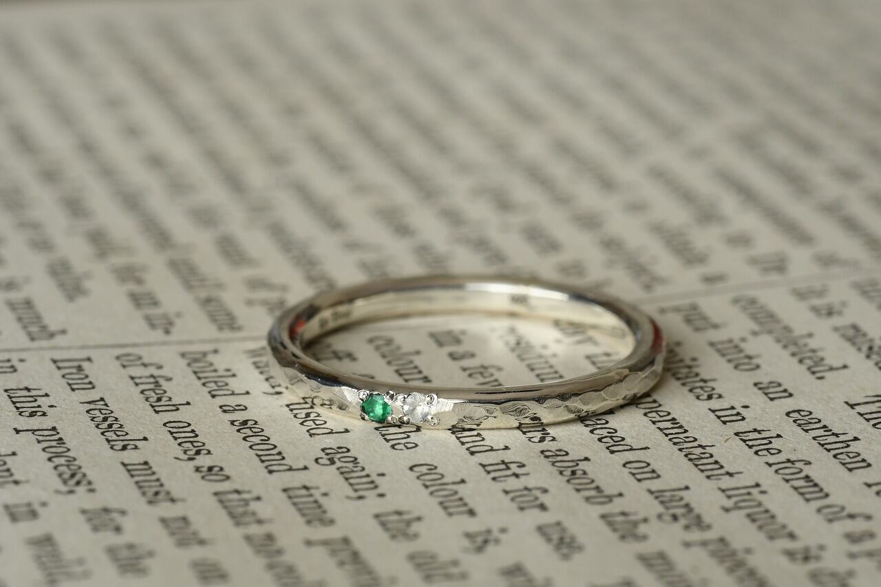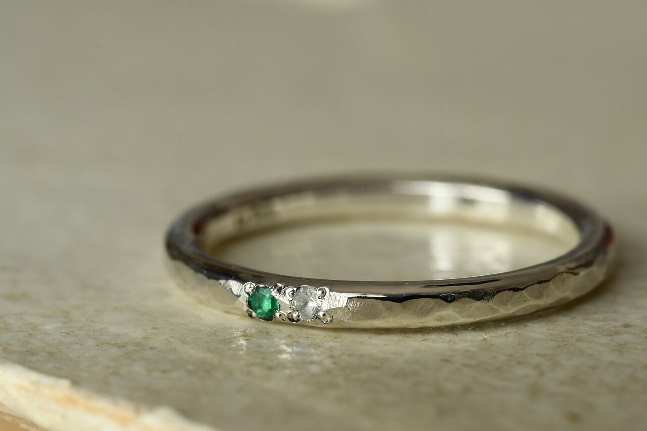 今回はシルバーの槌目リングをベースにエメラルドとブルームーンストーンを組み合わせて制作を行いました。はっきりとした色味が特徴のエメラルドとどの石に合わせても身に着けやすいブルームーンストーンの組み合わせ。