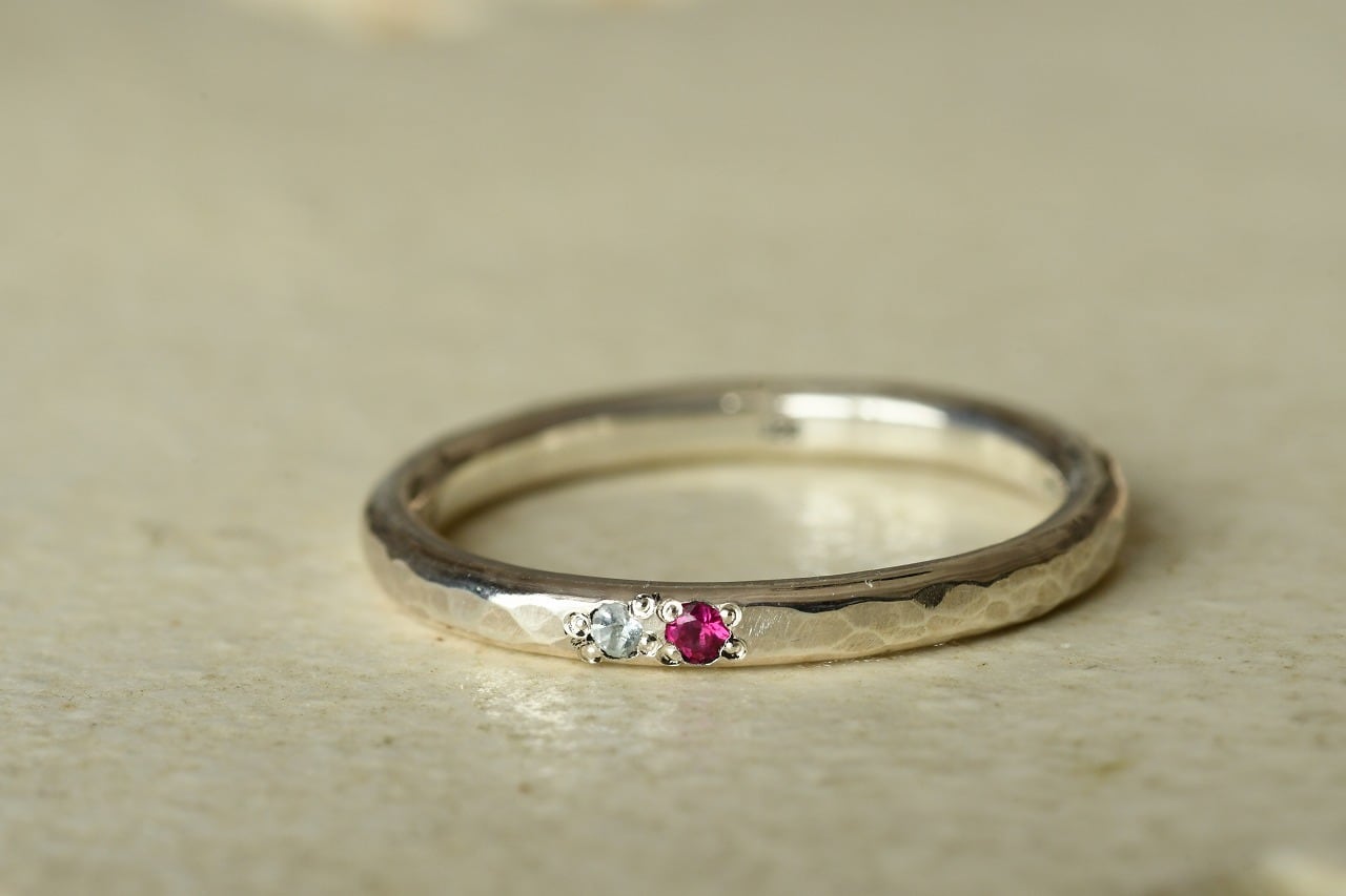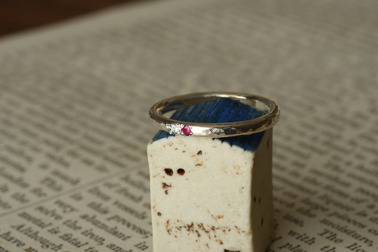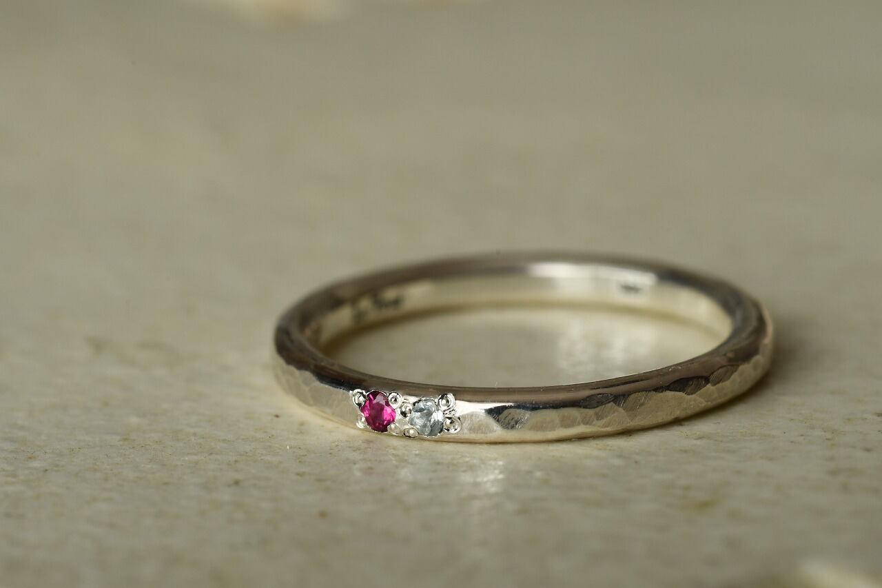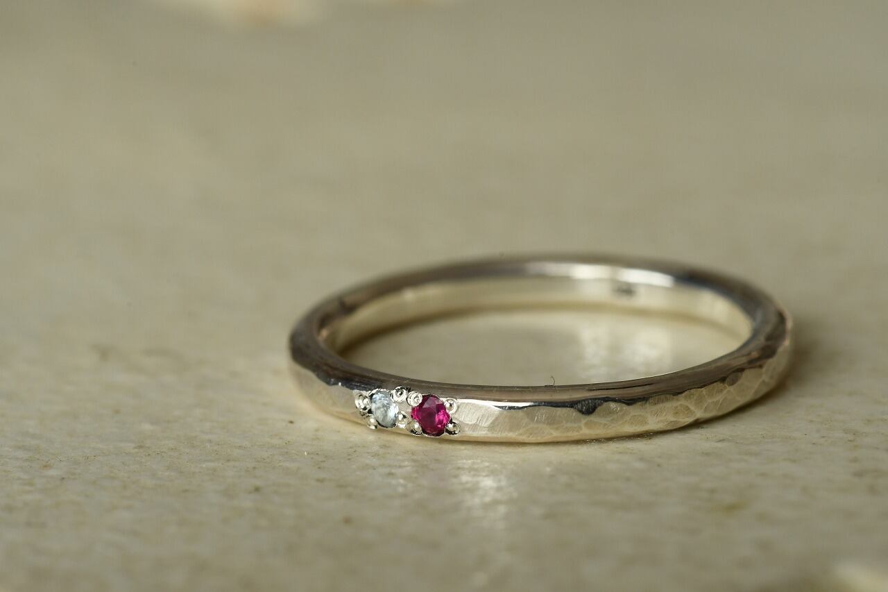 今回はシルバーの槌目リングをベースにルビーとアクアマリンを組み合わせて制作を行いました。美しい宝石質のルビーの輝きとアクアマリンの透明感のある美しくも優しい輝き。