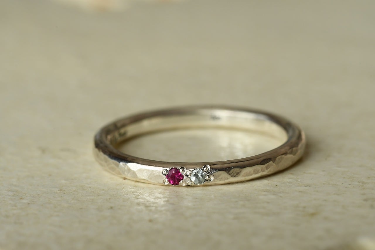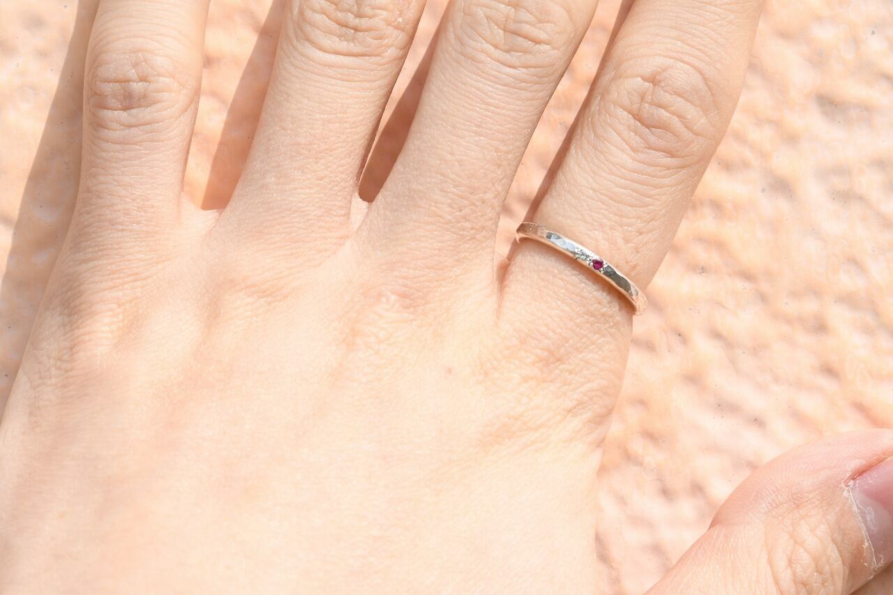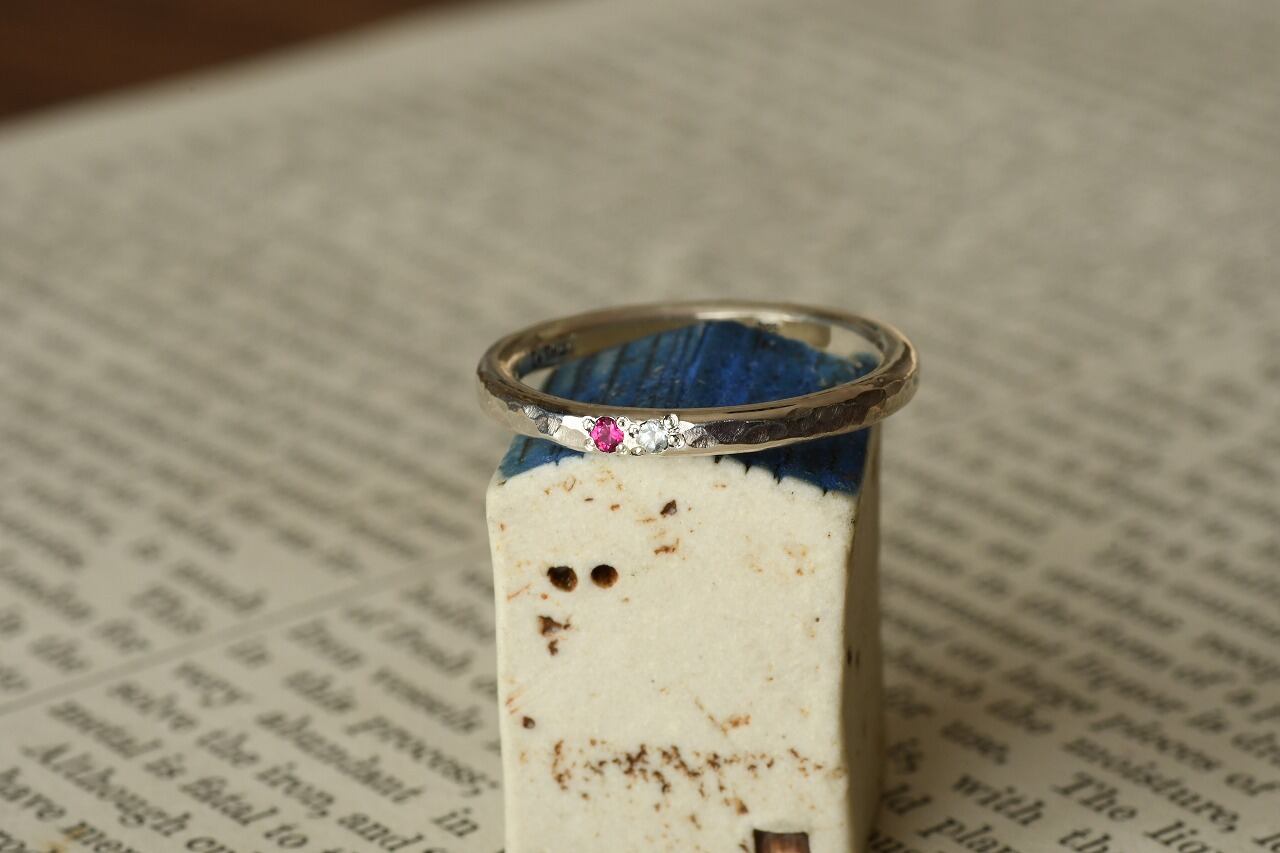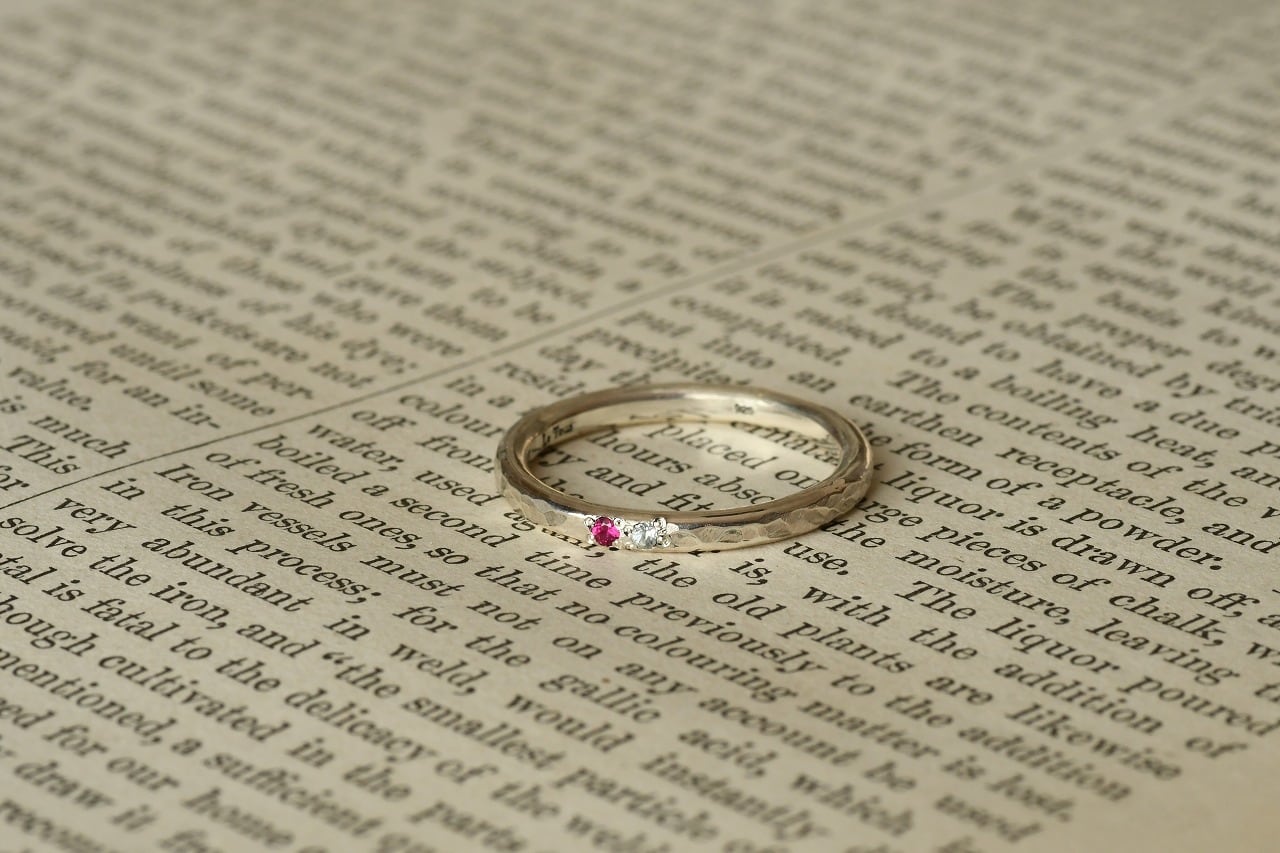 今回はシルバーの槌目リングをベースにルビーとアクアマリンを組み合わせて制作を行いました。美しい宝石質のルビーの輝きとアクアマリンの透明感のある美しくも優しい輝き。