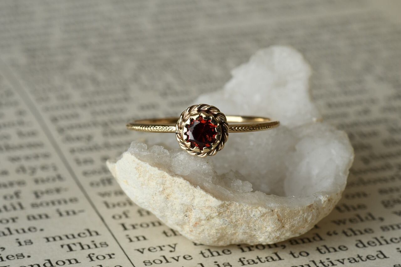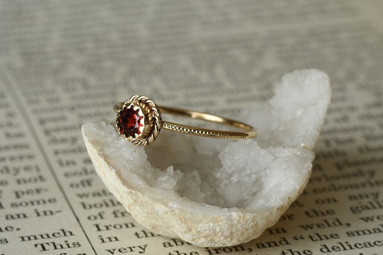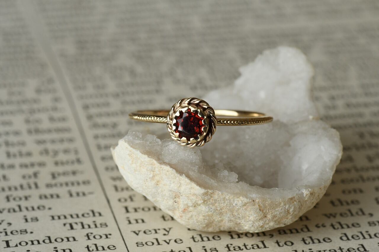 アンティークっぽさを表現したいと考えたときに一番最初に思い浮かんだ石はやっぱり深紅のガーネット。美しさと落ち着きのバランスが絶妙でその輝きに心を惹かれるます。