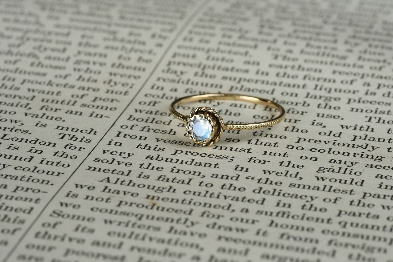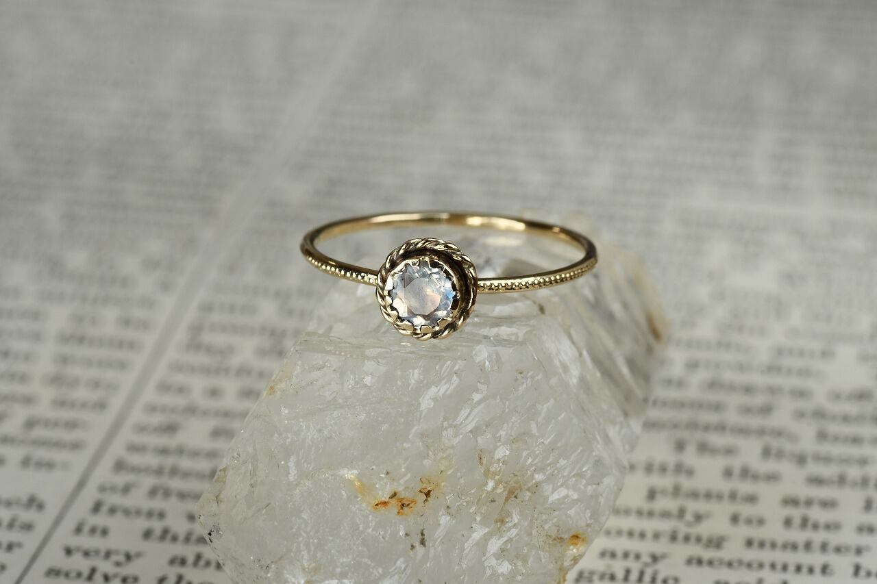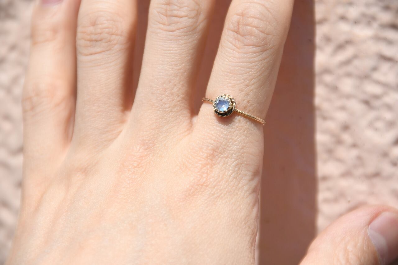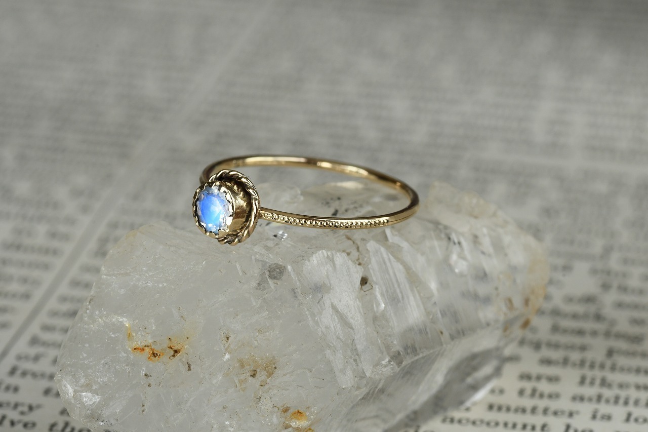 光の当たり方によって美しく輝くブルームーンストーンの輝きとK10の明るい輝き