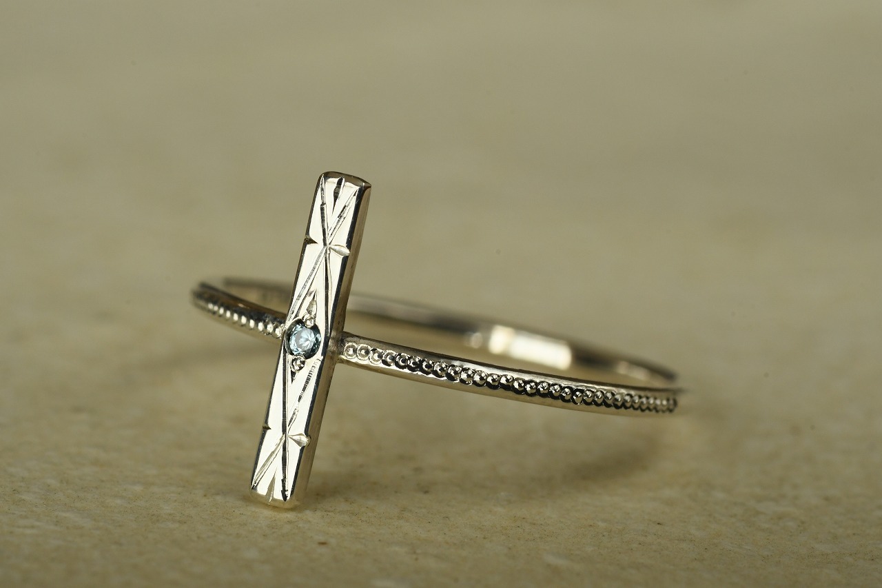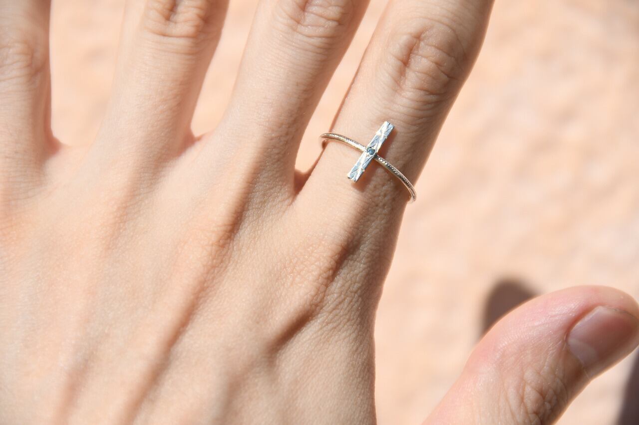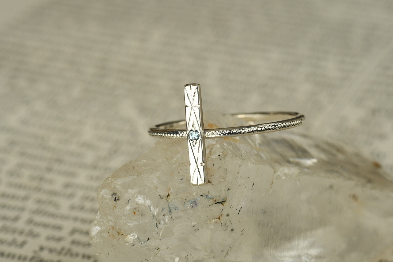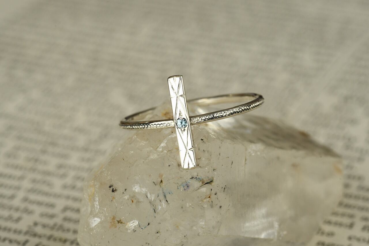 今回はすっきりとた青空色が特徴のブルージルコンとシルバーの組み合わせのリングです。