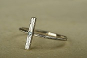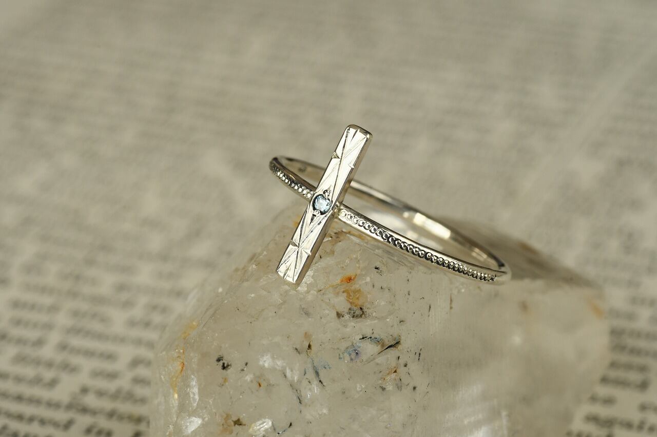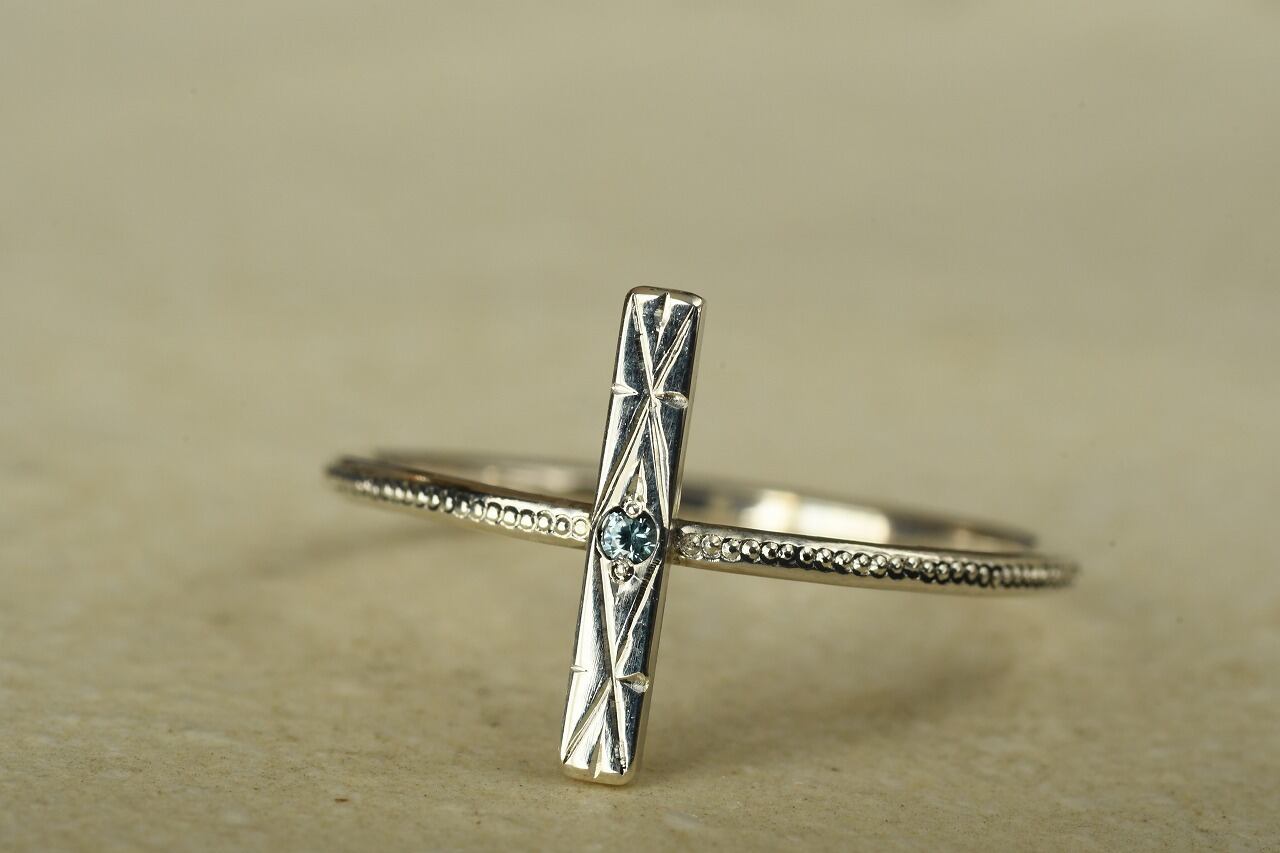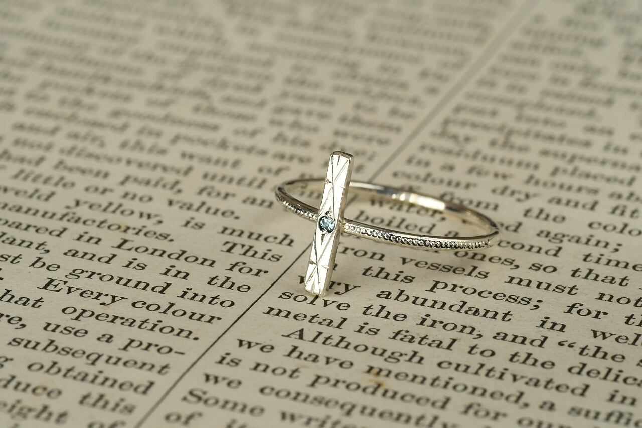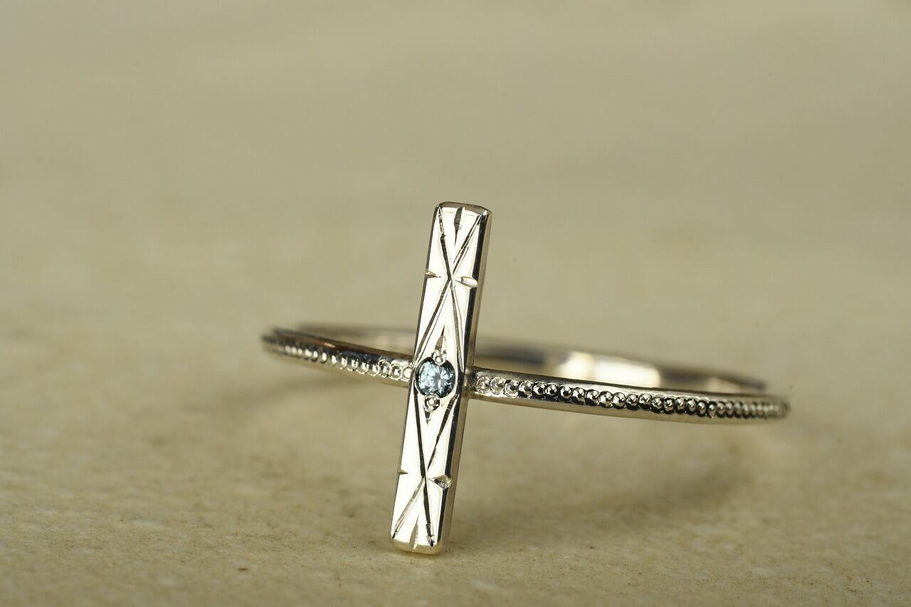 今回はすっきりとた青空色が特徴のブルージルコンとシルバーの組み合わせのリングです。