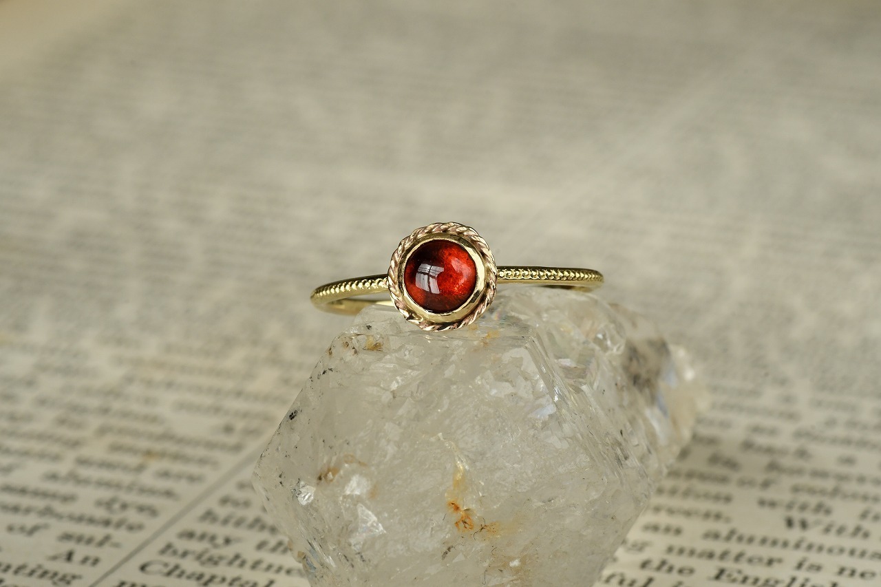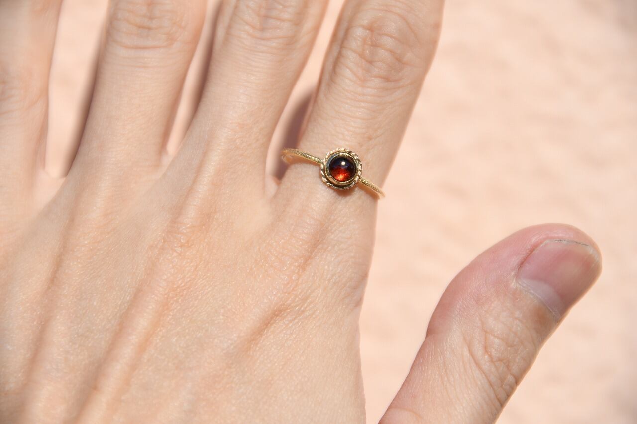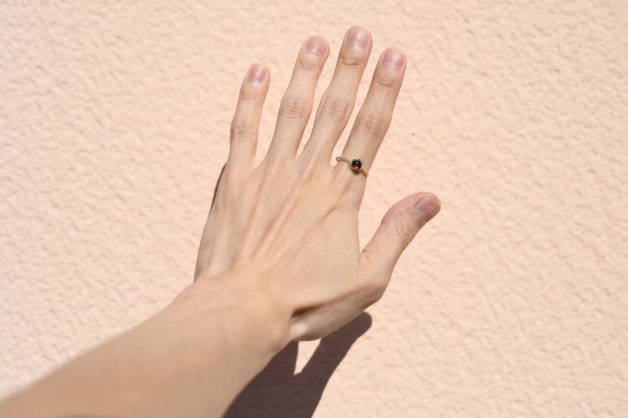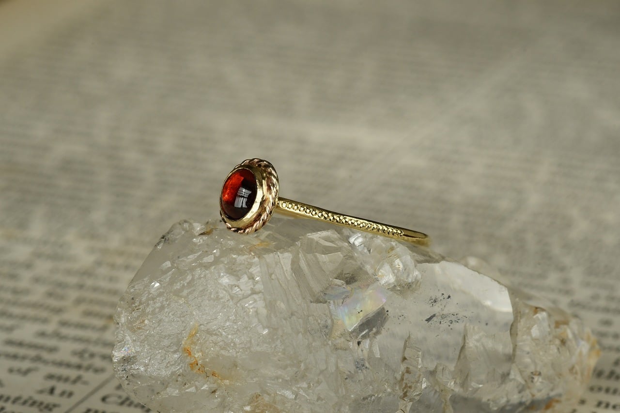 深くも美しいオーソドックスなガーネットの色味とだんだんとアンティークのような雰囲気を纏う真鍮の質感、ミルを打つことでより落ち着いた雰囲気を楽しむことができるリングのデザイン