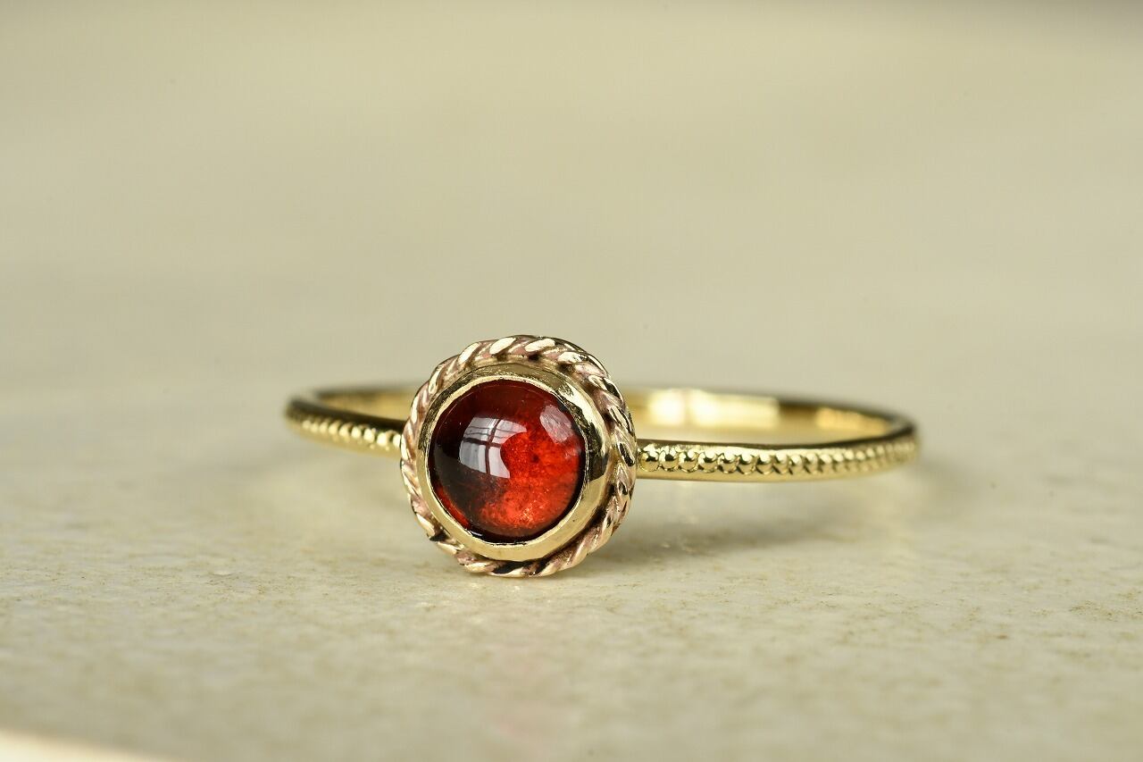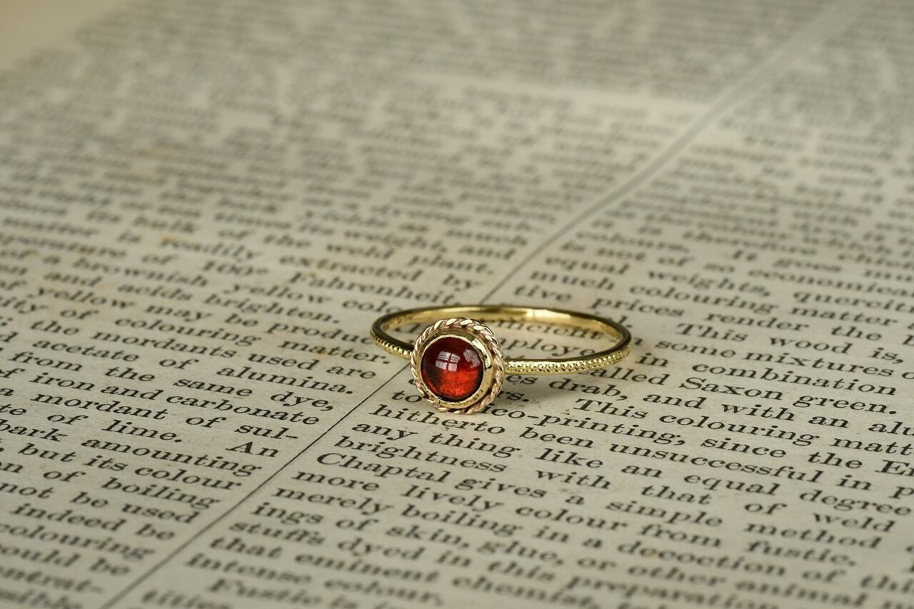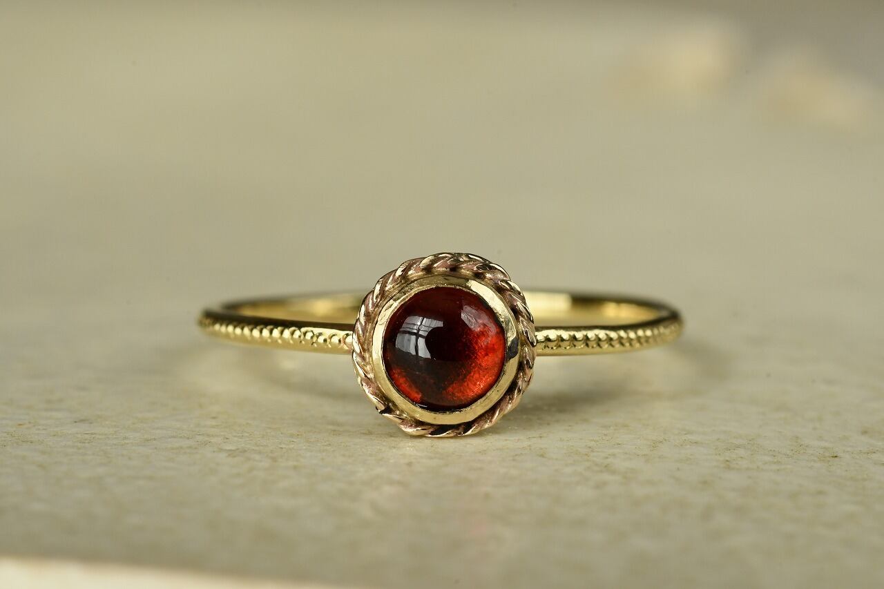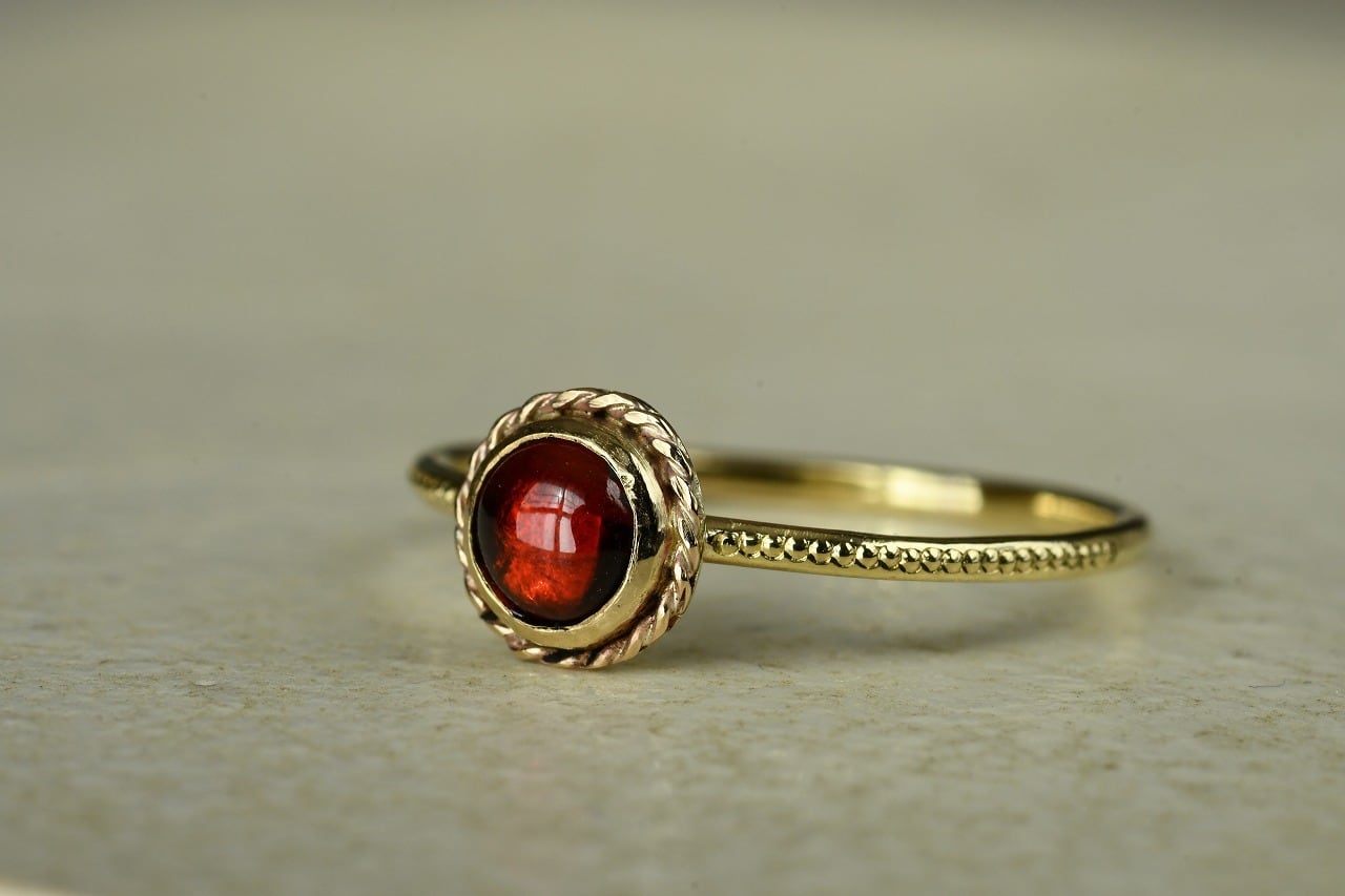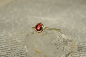 深くも美しいオーソドックスなガーネットの色味とだんだんとアンティークのような雰囲気を纏う真鍮の質感、ミルを打つことでより落ち着いた雰囲気を楽しむことができるリングのデザイン