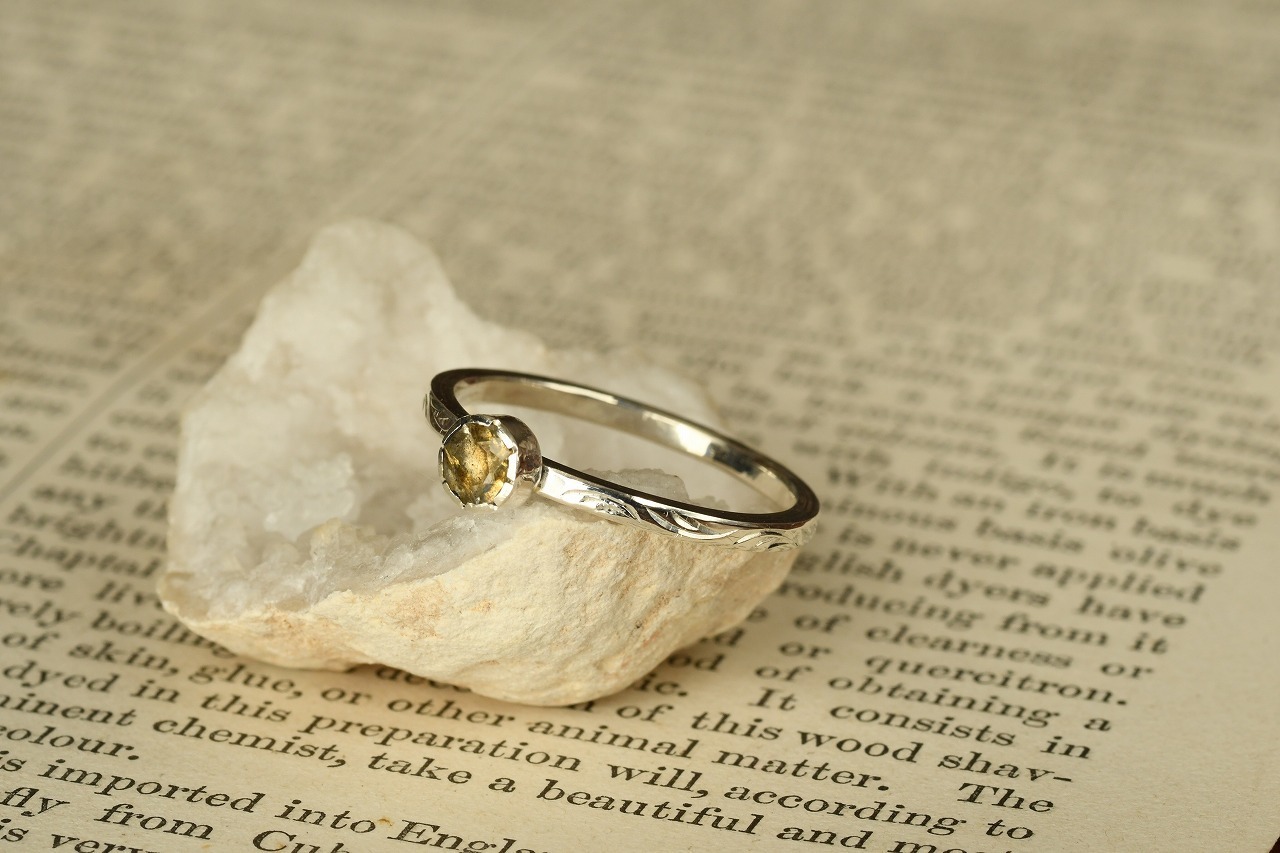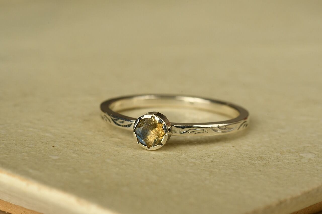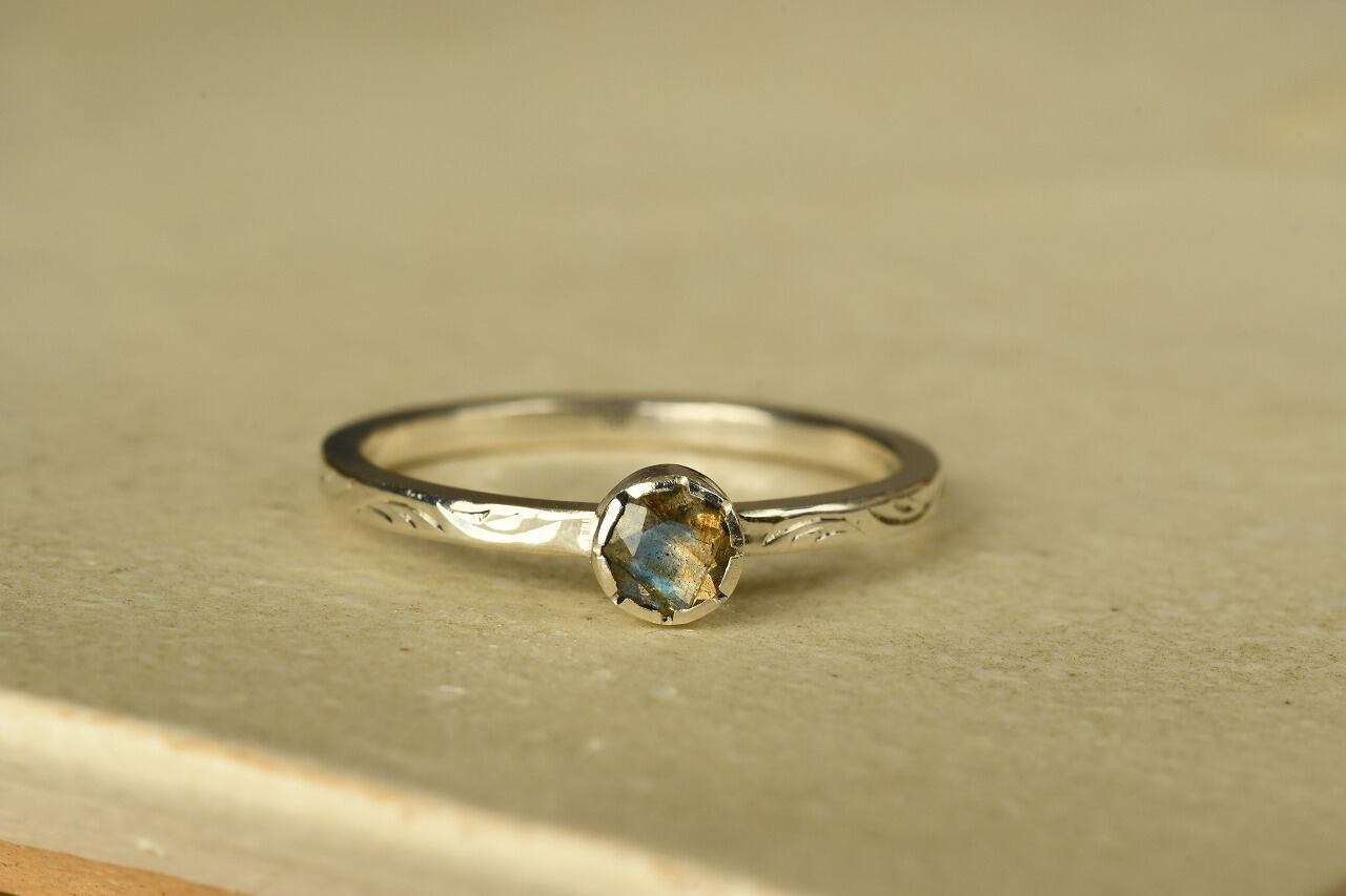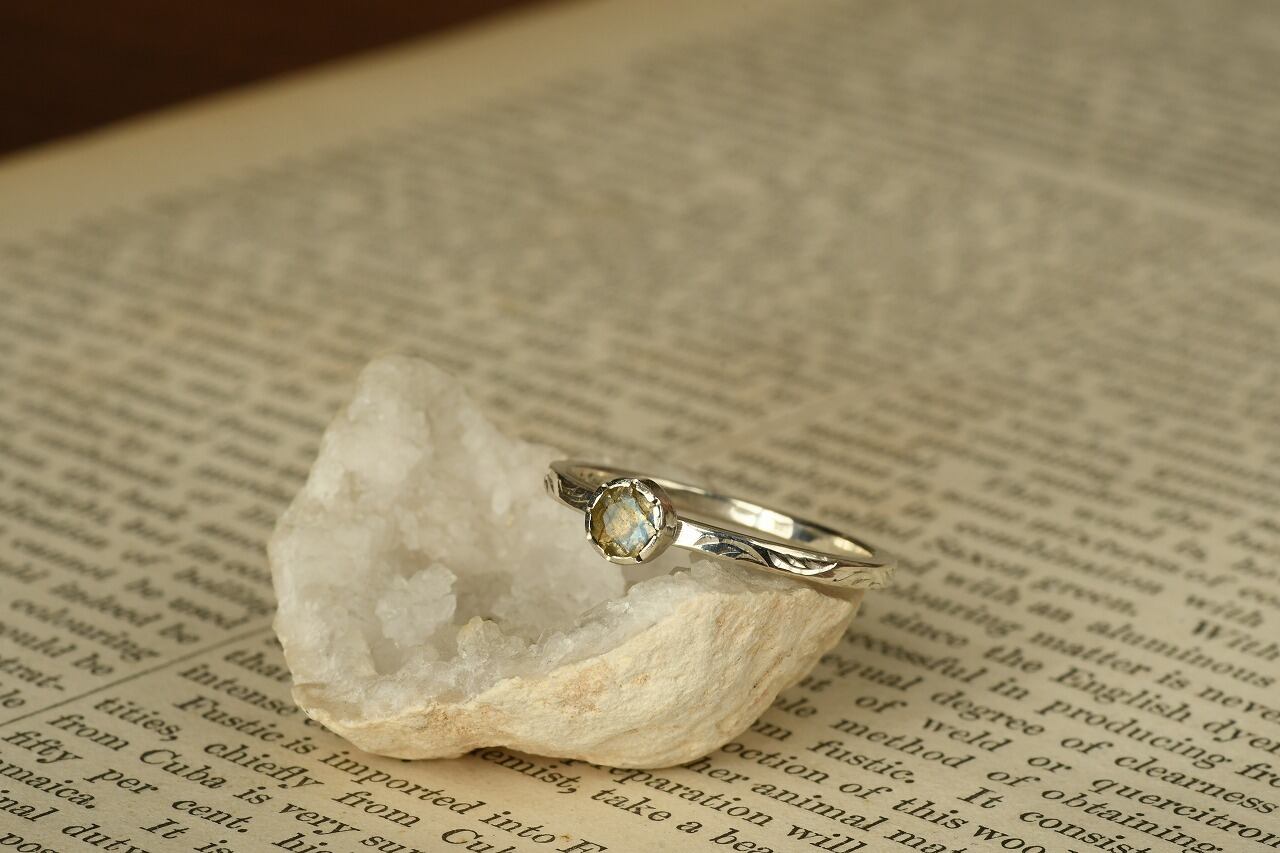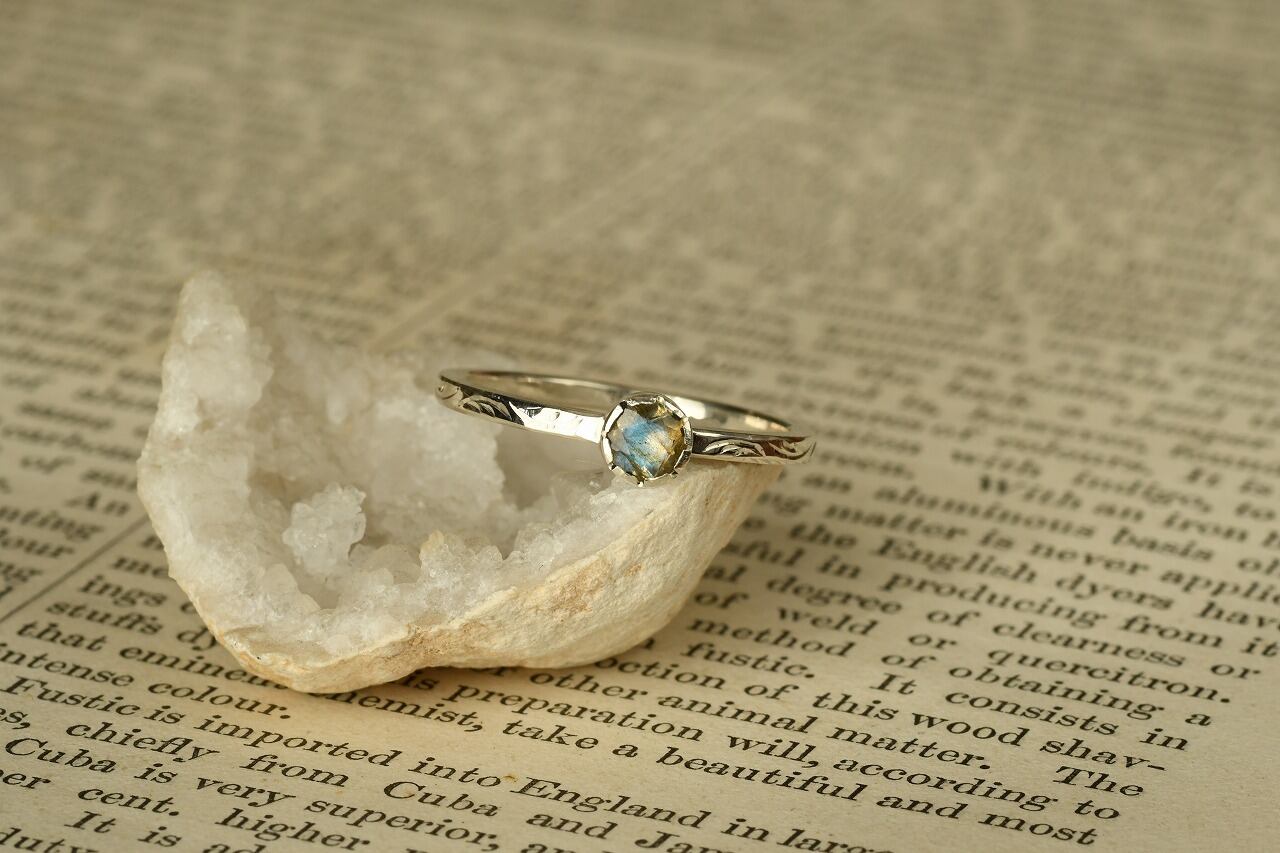 深みのある淡い煌きのラブラドライトと全周に渡って彫りを施してたリング部分のアンティークのような雰囲気を楽しんでもらえたら幸いです。