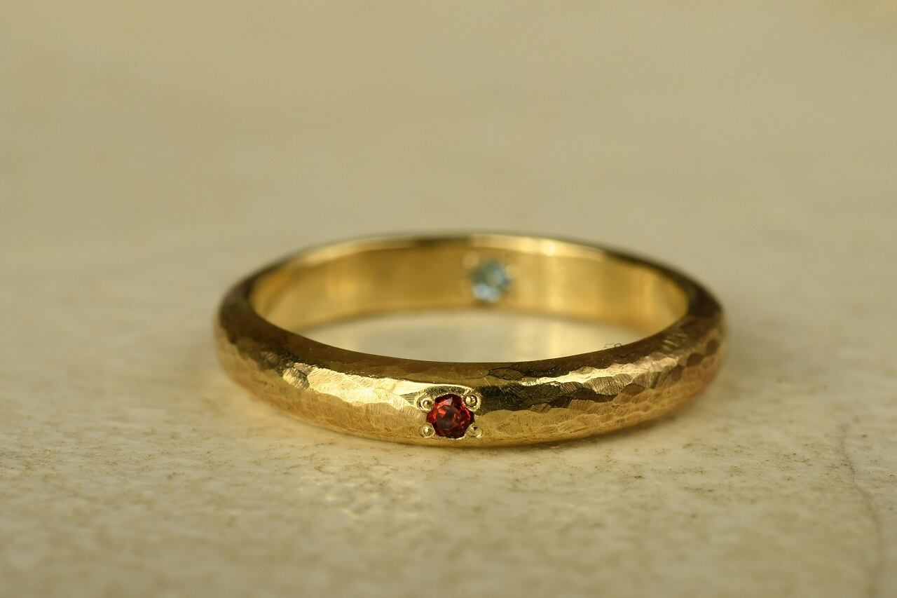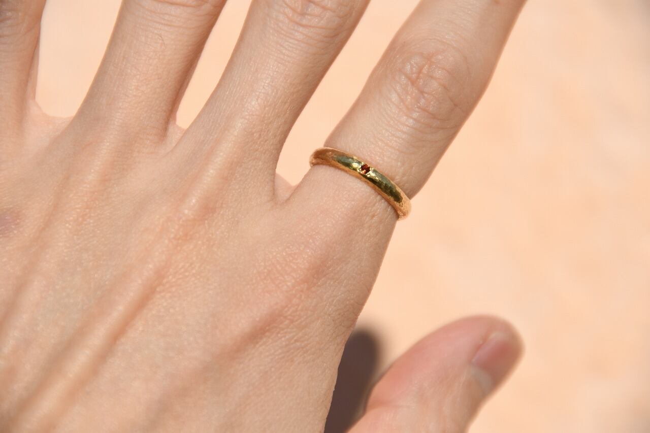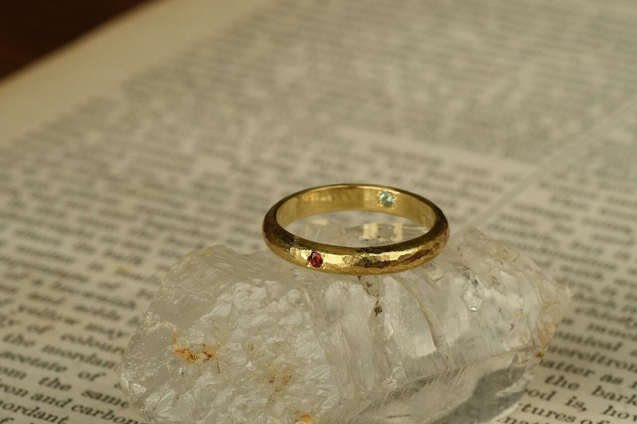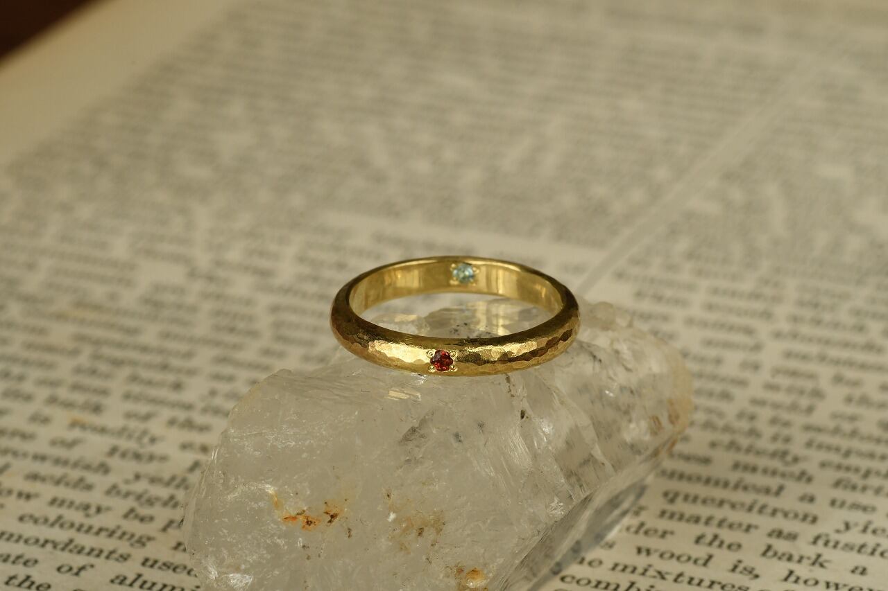 真鍮で制作を行った甲丸リングの外側にガーネットを留めて、内側にブルートパーズを留めて制作を行ったリングになります。