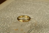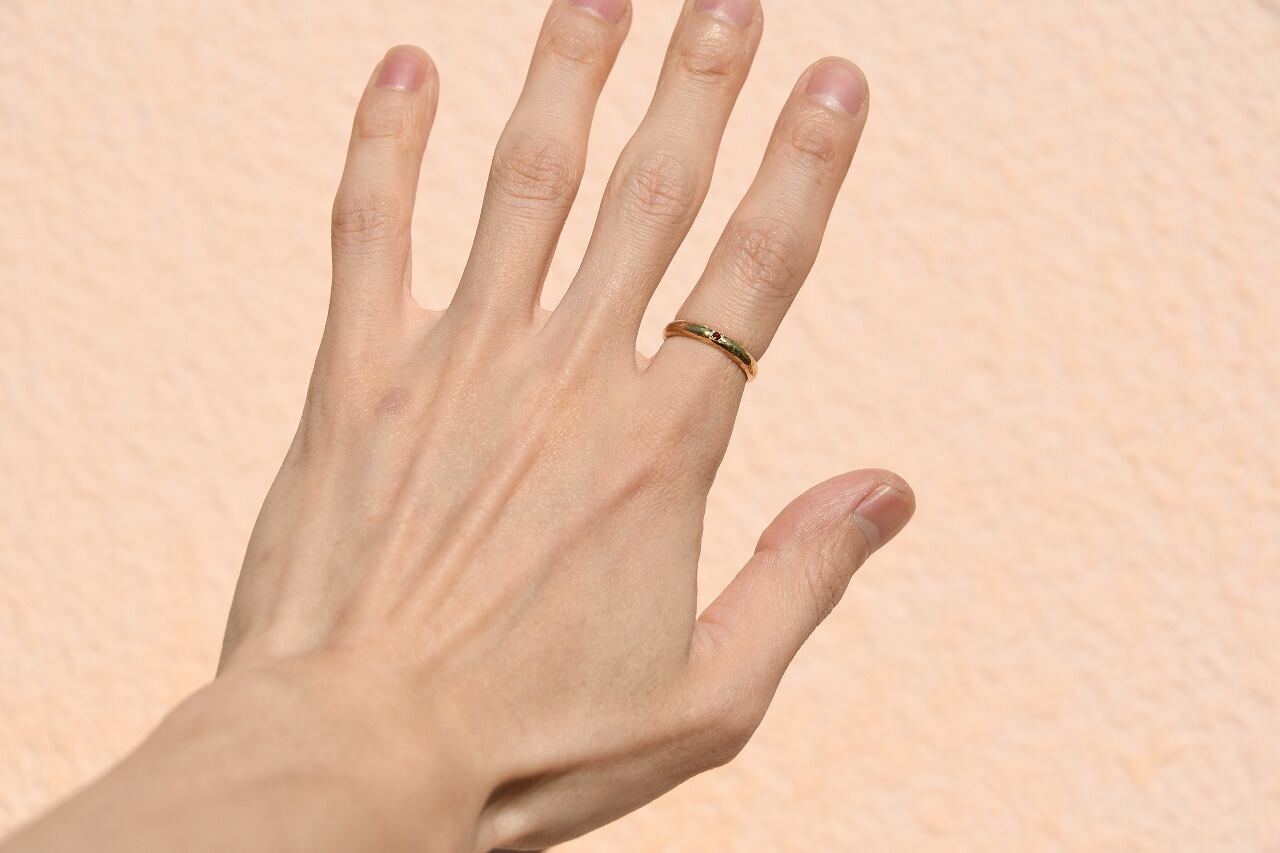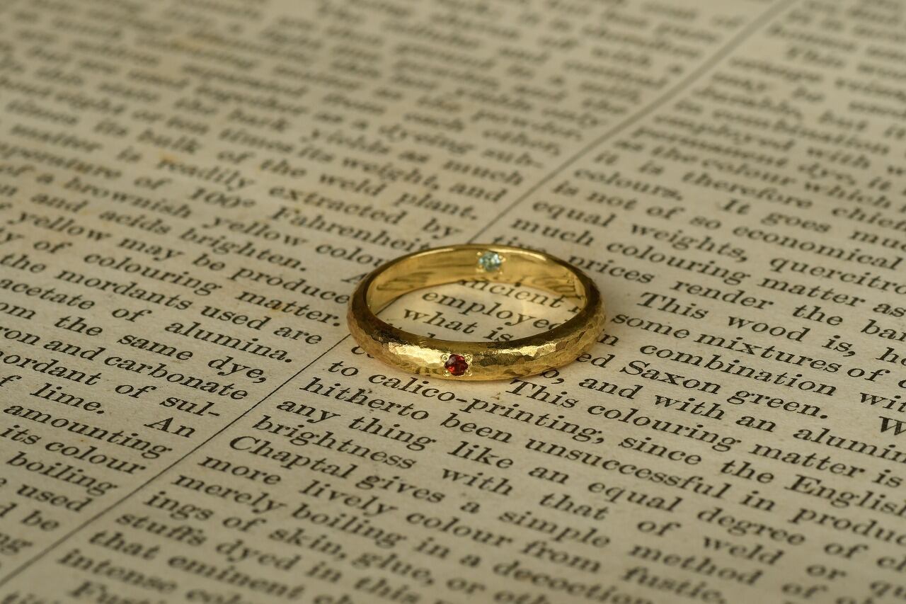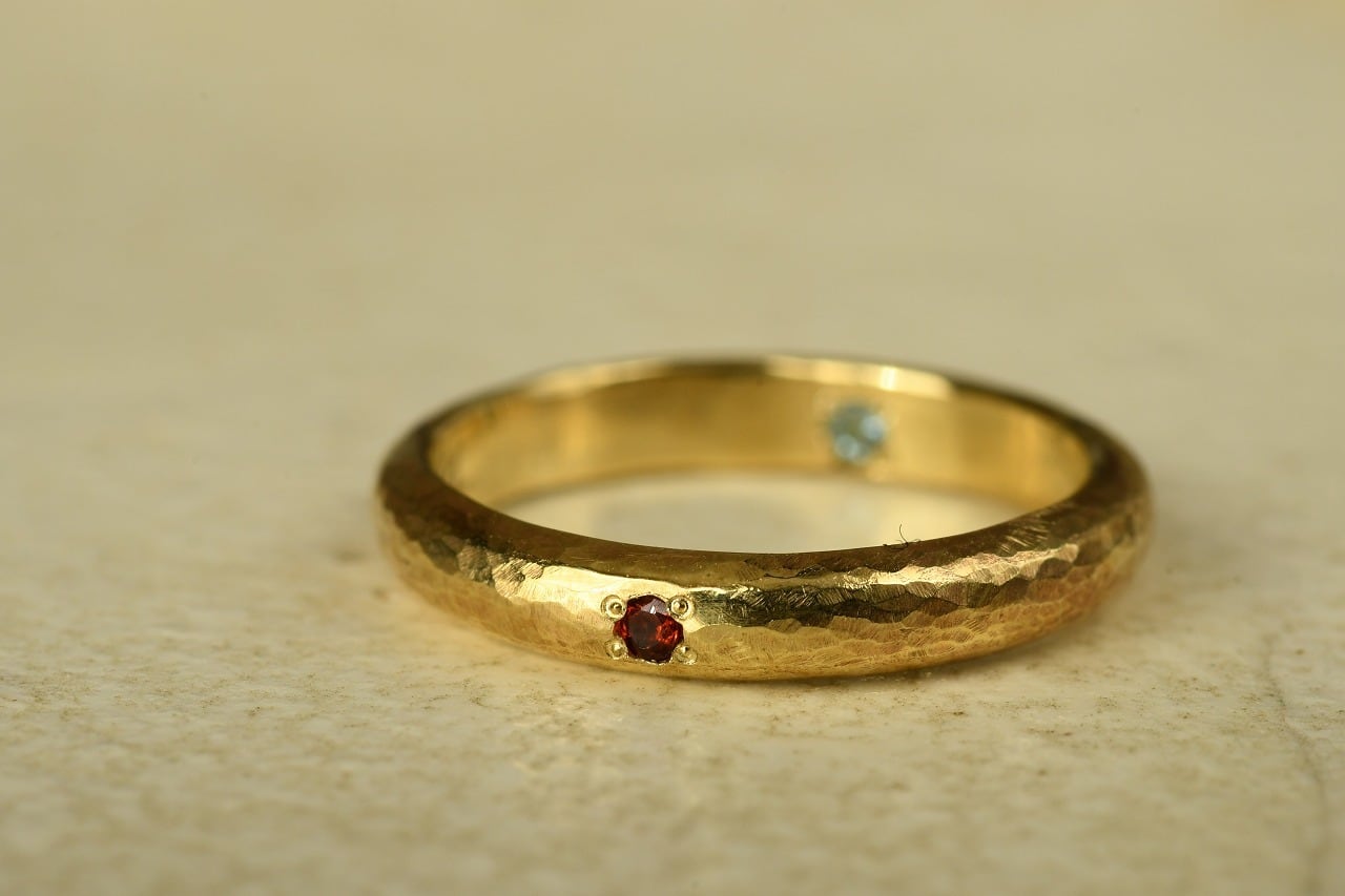 真鍮で制作を行った甲丸リングの外側にガーネットを留めて、内側にブルートパーズを留めて制作を行ったリングになります。