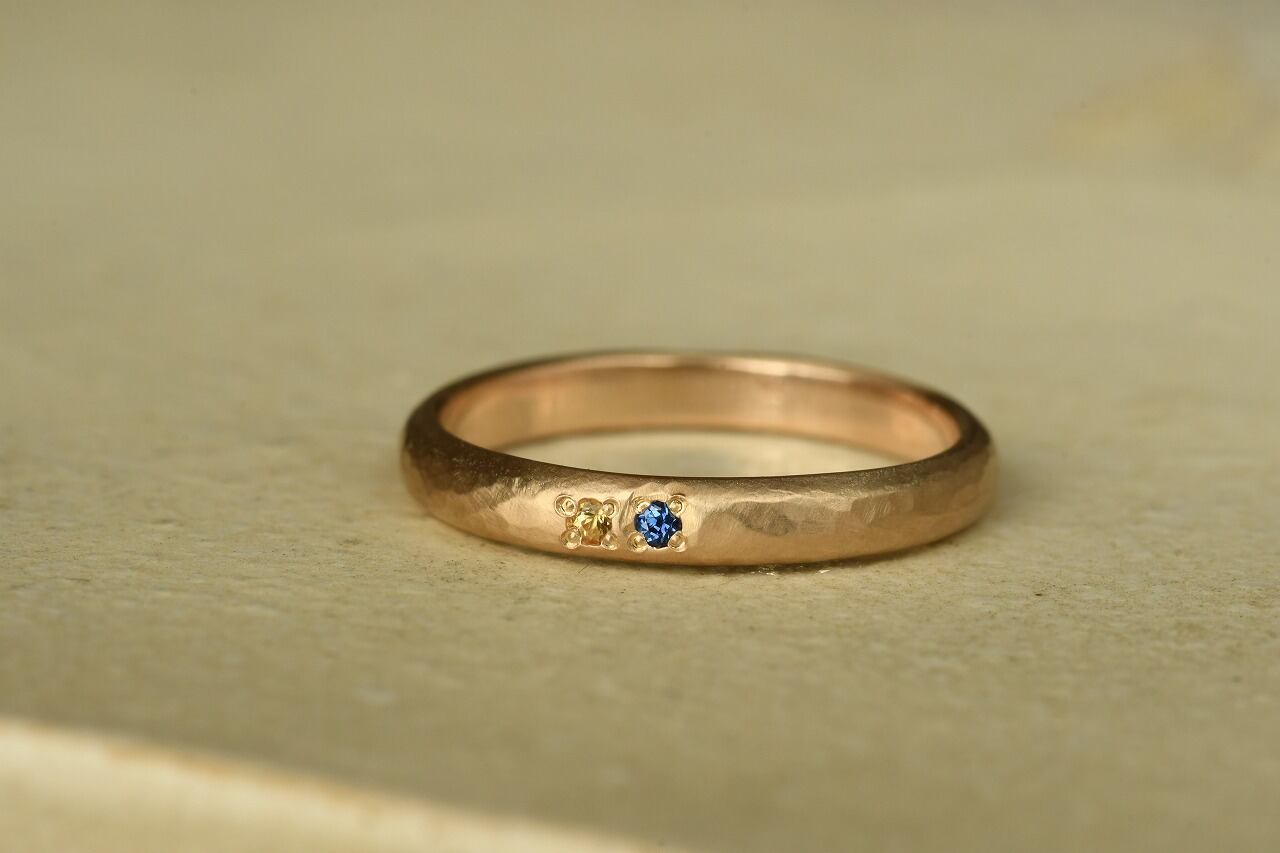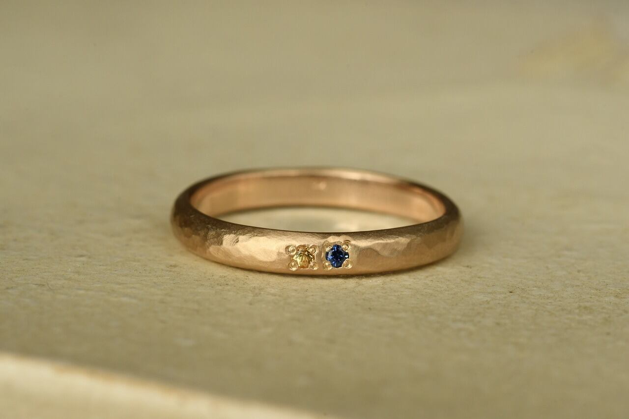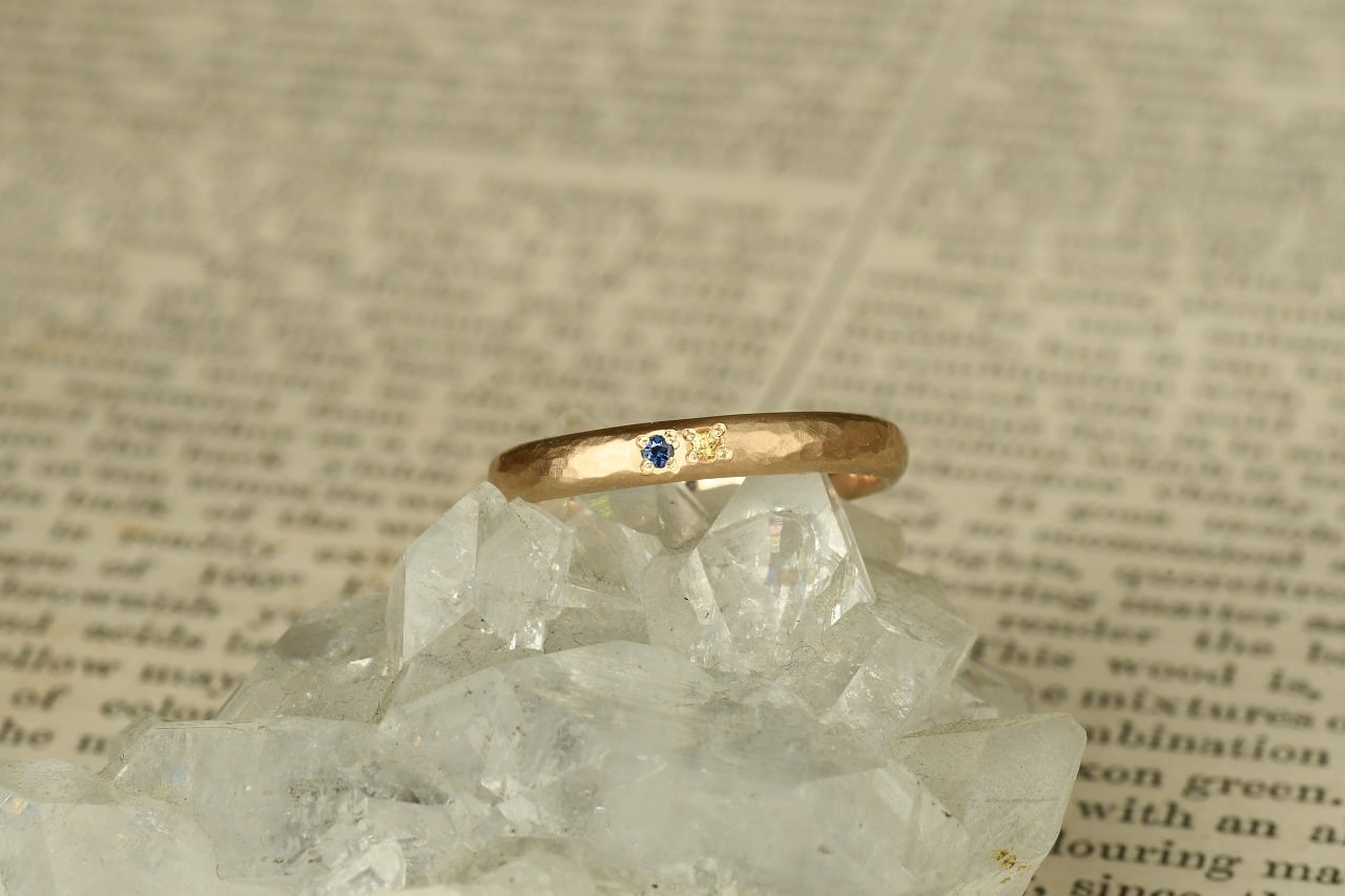 10金に槌目を打って制作を行った甲丸リングに美しい2種類のサファイアを留めて制作を行いました。鮮やかな青が特徴のコーンフラワーブルーサファイアとイエローサファイアの二つの石がシンプルなデザインの中できらりと輝きます。