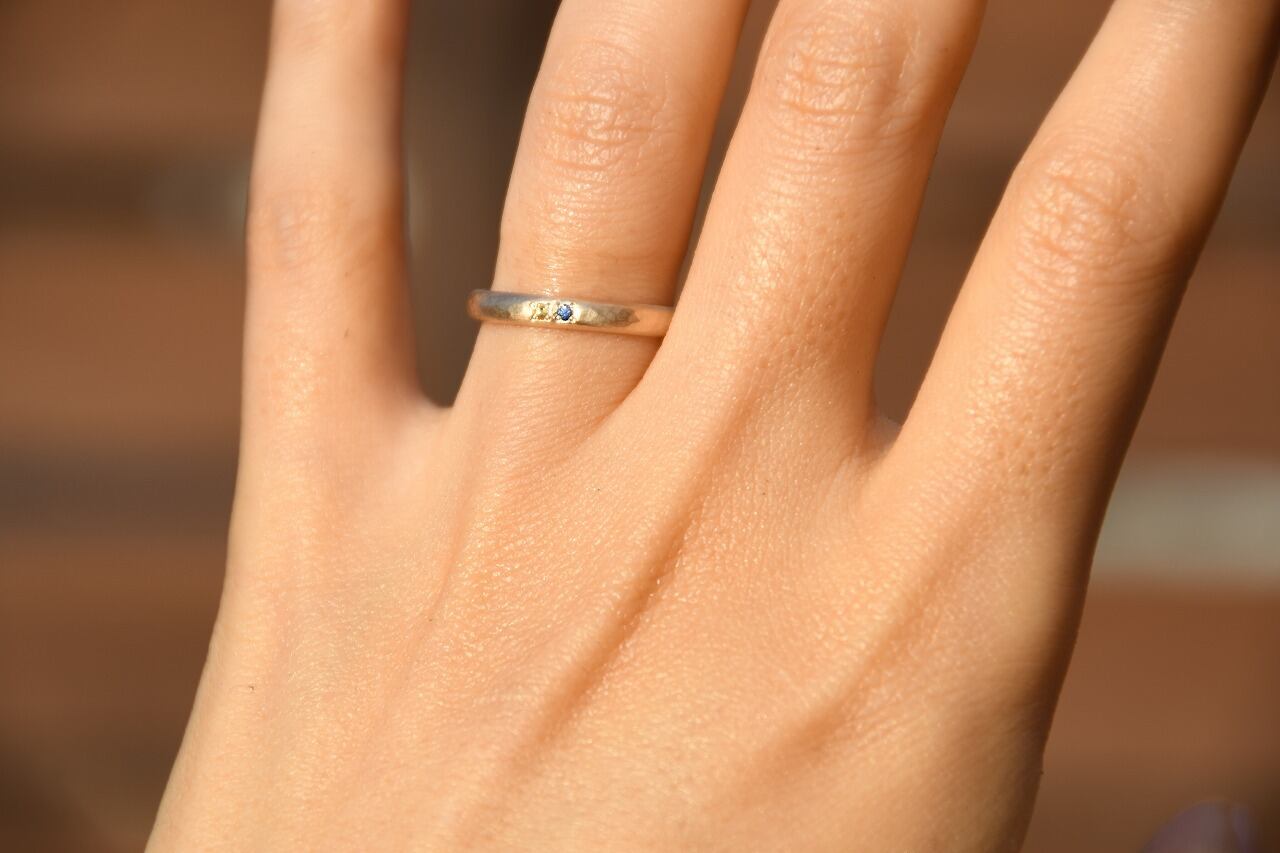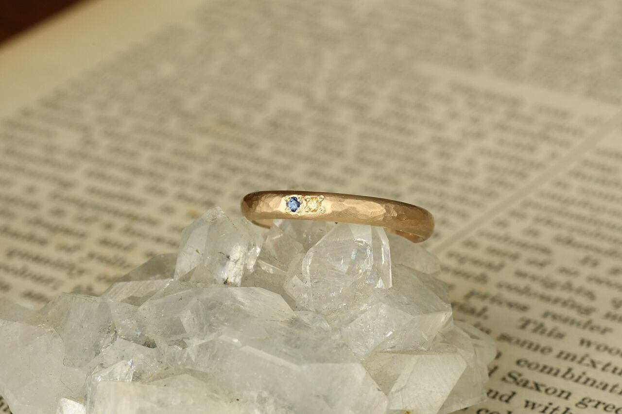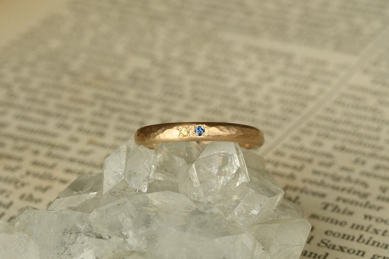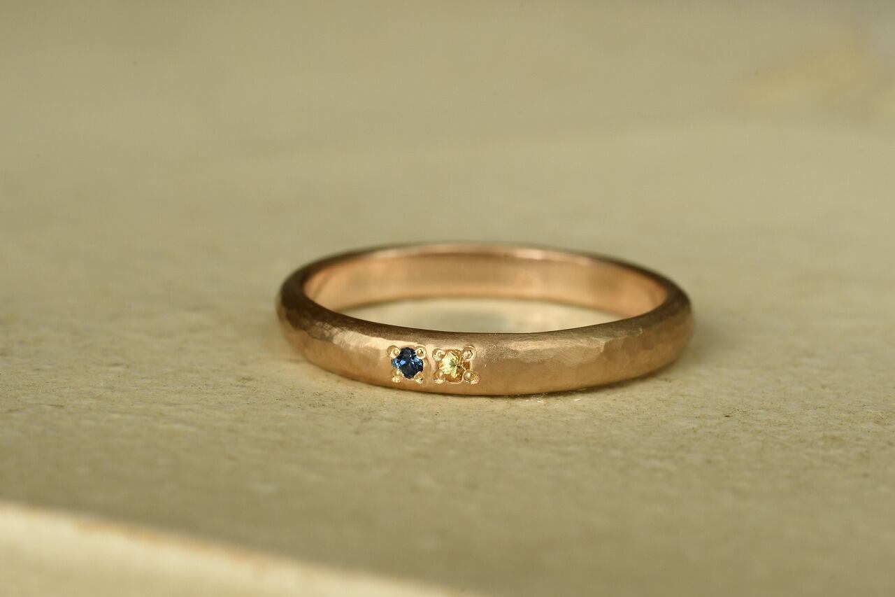 10金に槌目を打って制作を行った甲丸リングに美しい2種類のサファイアを留めて制作を行いました。鮮やかな青が特徴のコーンフラワーブルーサファイアとイエローサファイアの二つの石がシンプルなデザインの中できらりと輝きます。