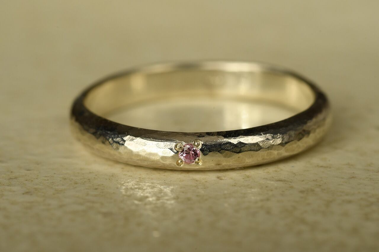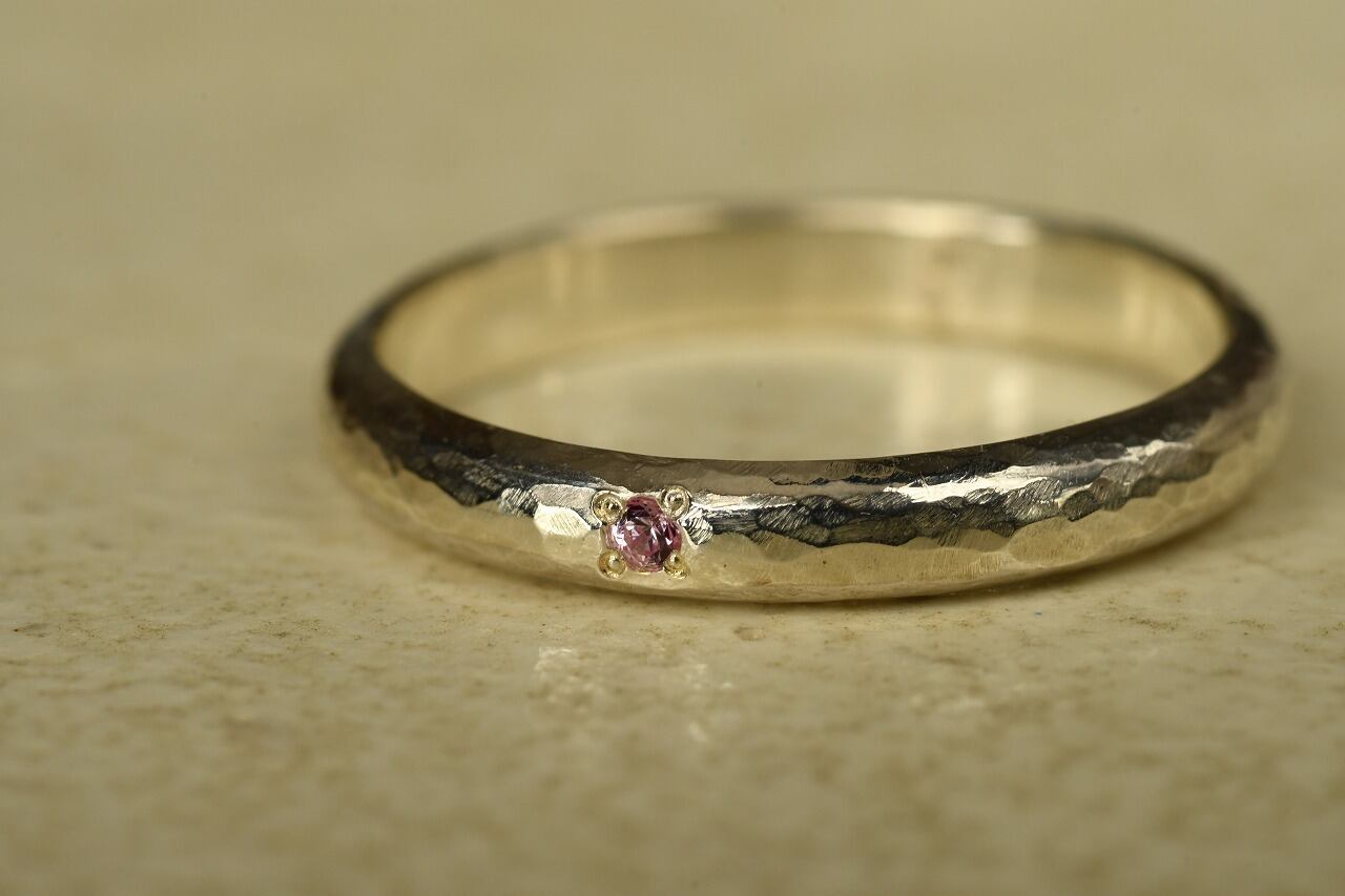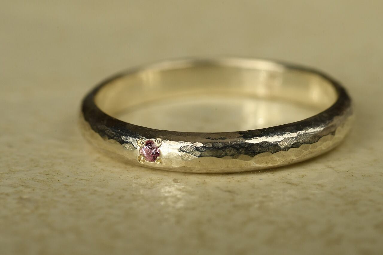 シルバーの槌目を打った甲丸リングをベースに落ち着いた雰囲気が魅力的なピンクサファイアを一粒留めて制作を行いました。