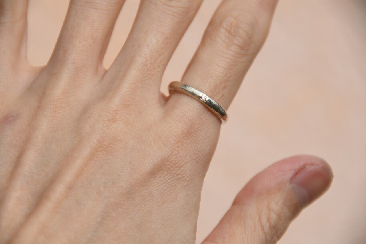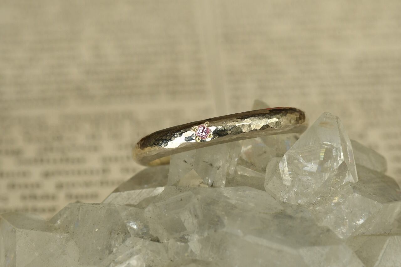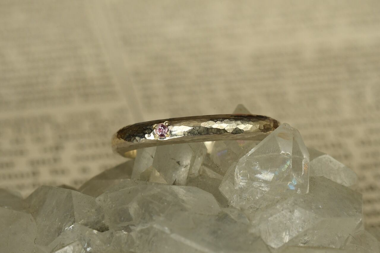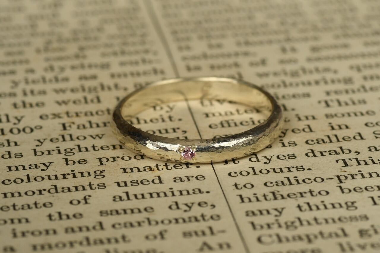 シルバーの槌目を打った甲丸リングをベースに落ち着いた雰囲気が魅力的なピンクサファイアを一粒留めて制作を行いました。