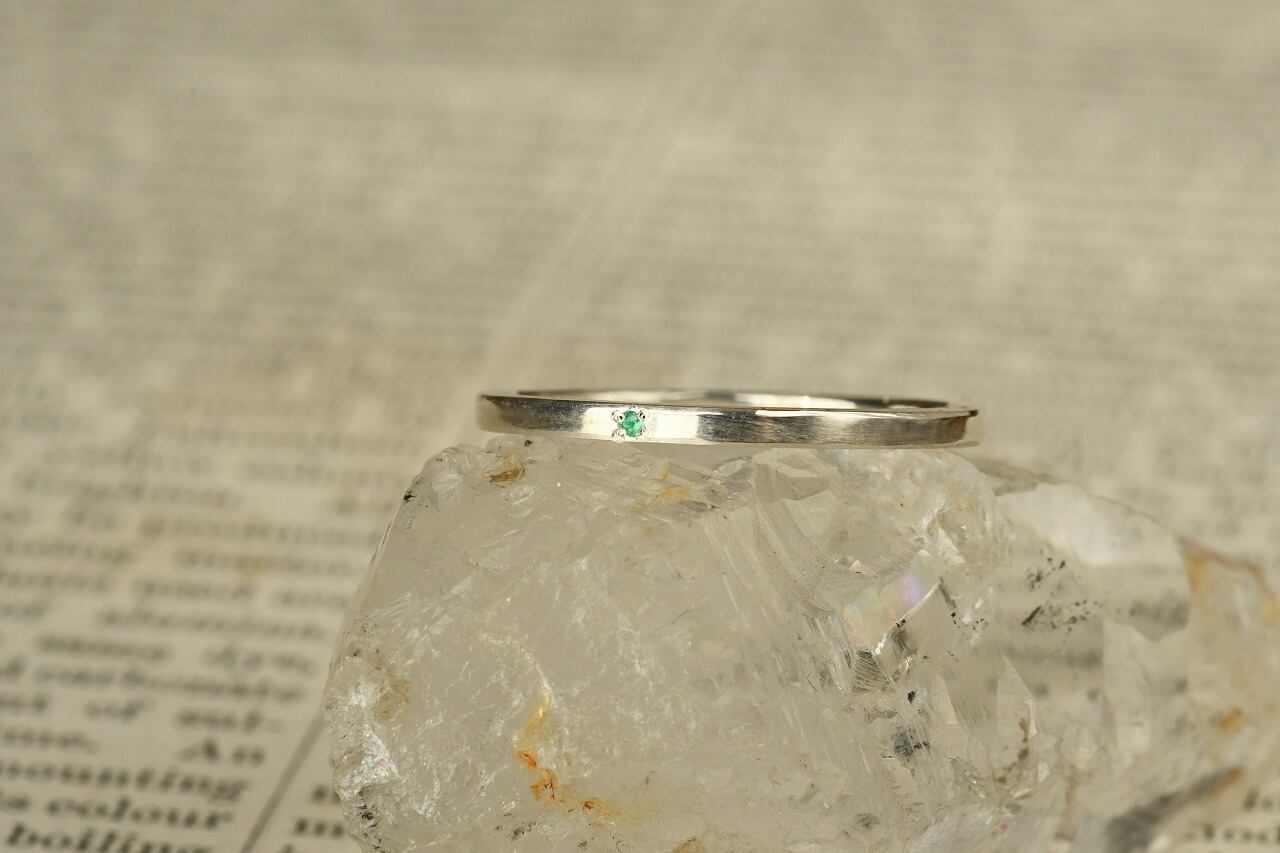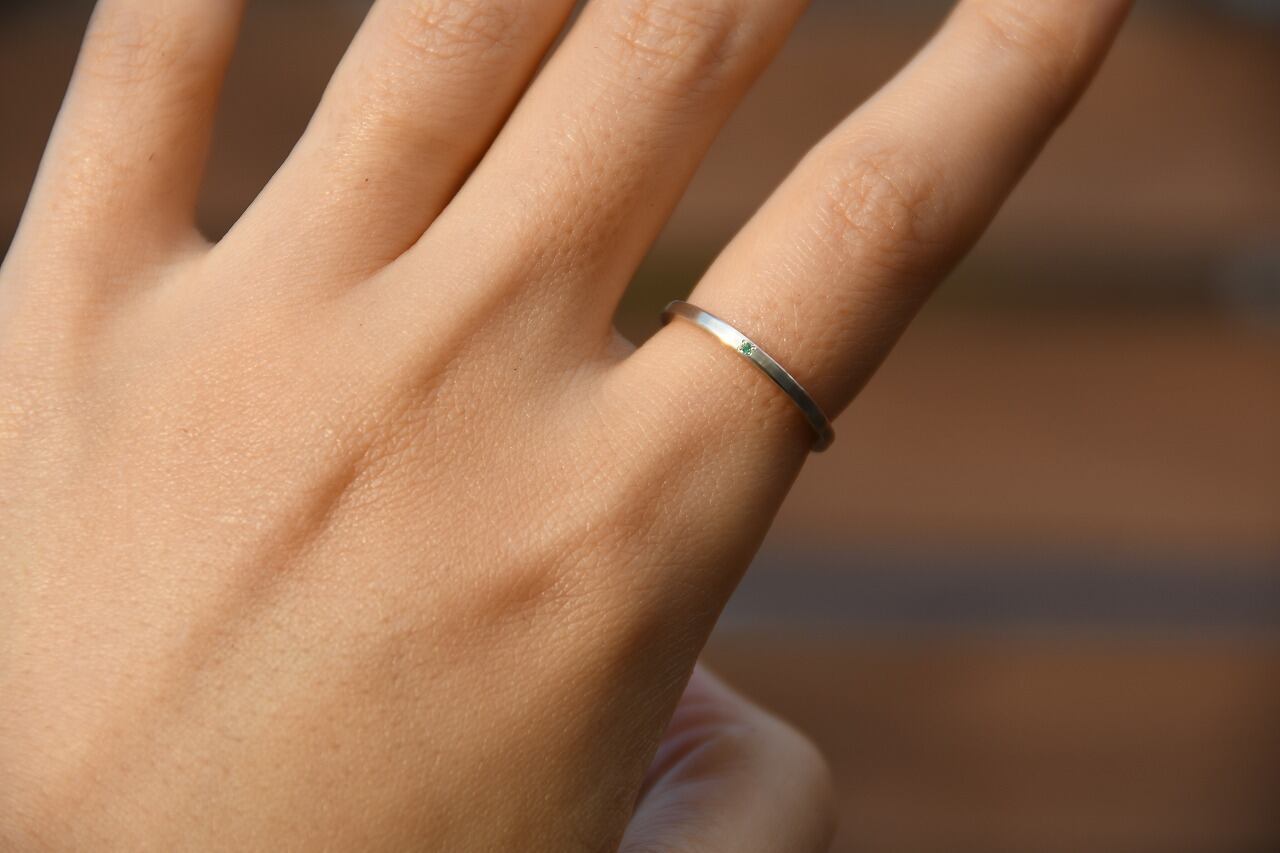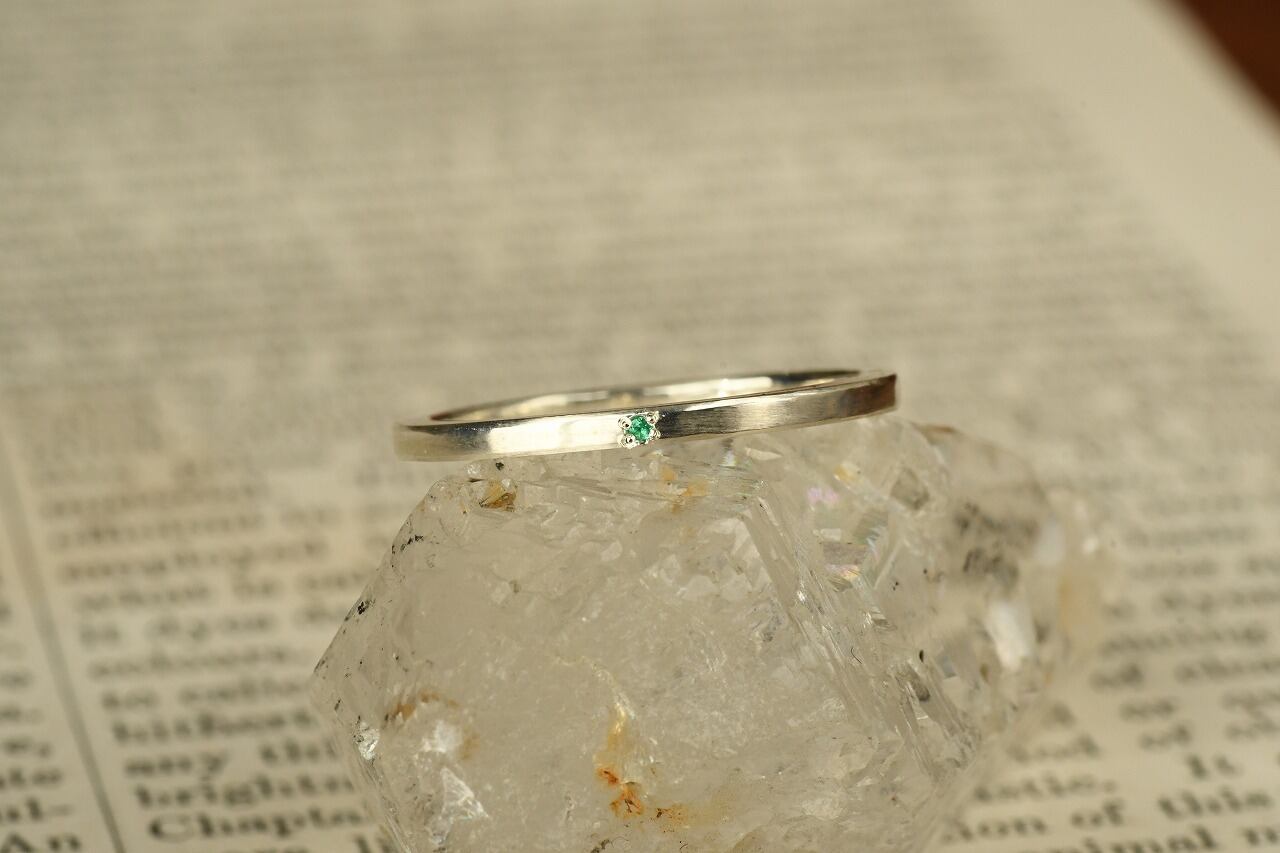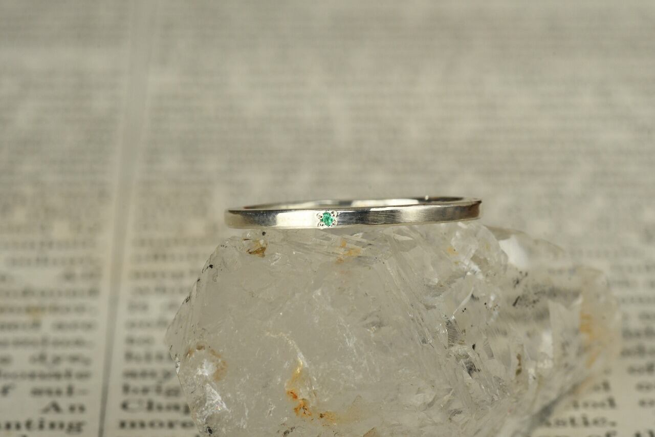 槌目も打っていないとてもシンプルなシルバーのリングに普段使用している石よりも一回り小さい小粒のエメラルドを一粒留めて制作を行いました。