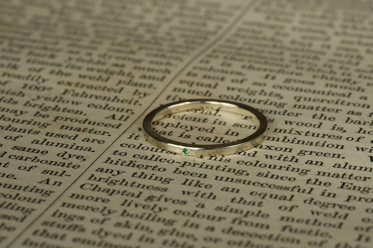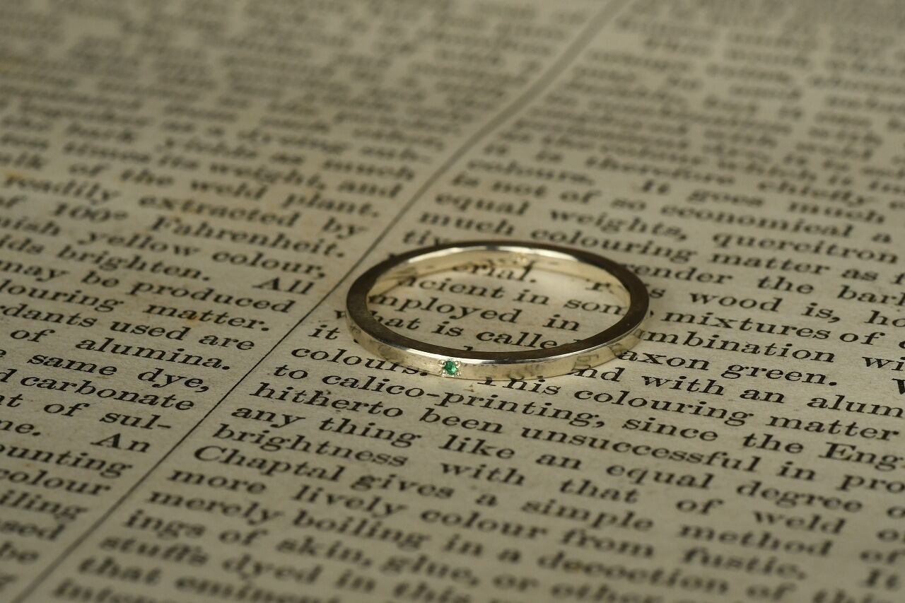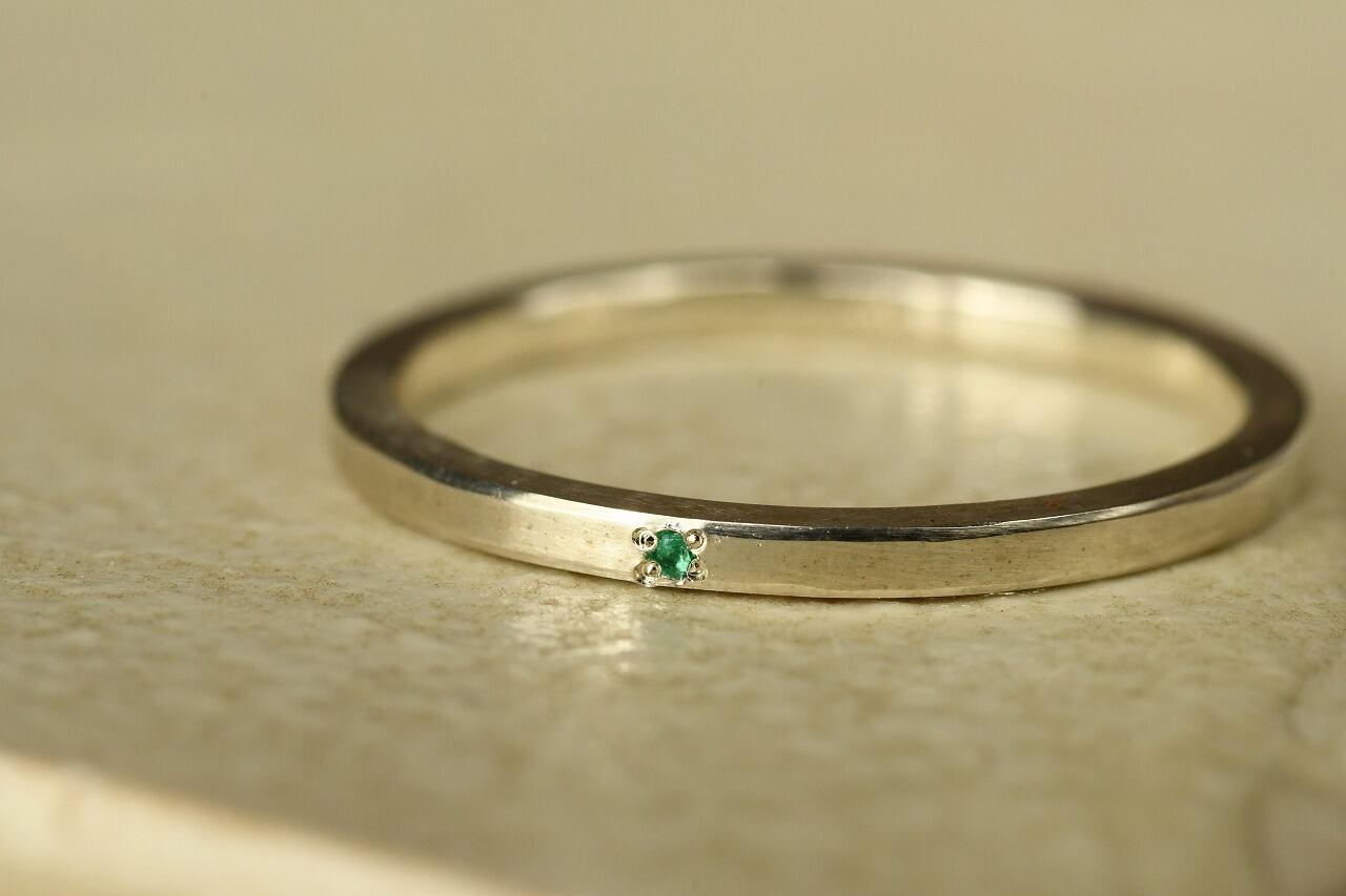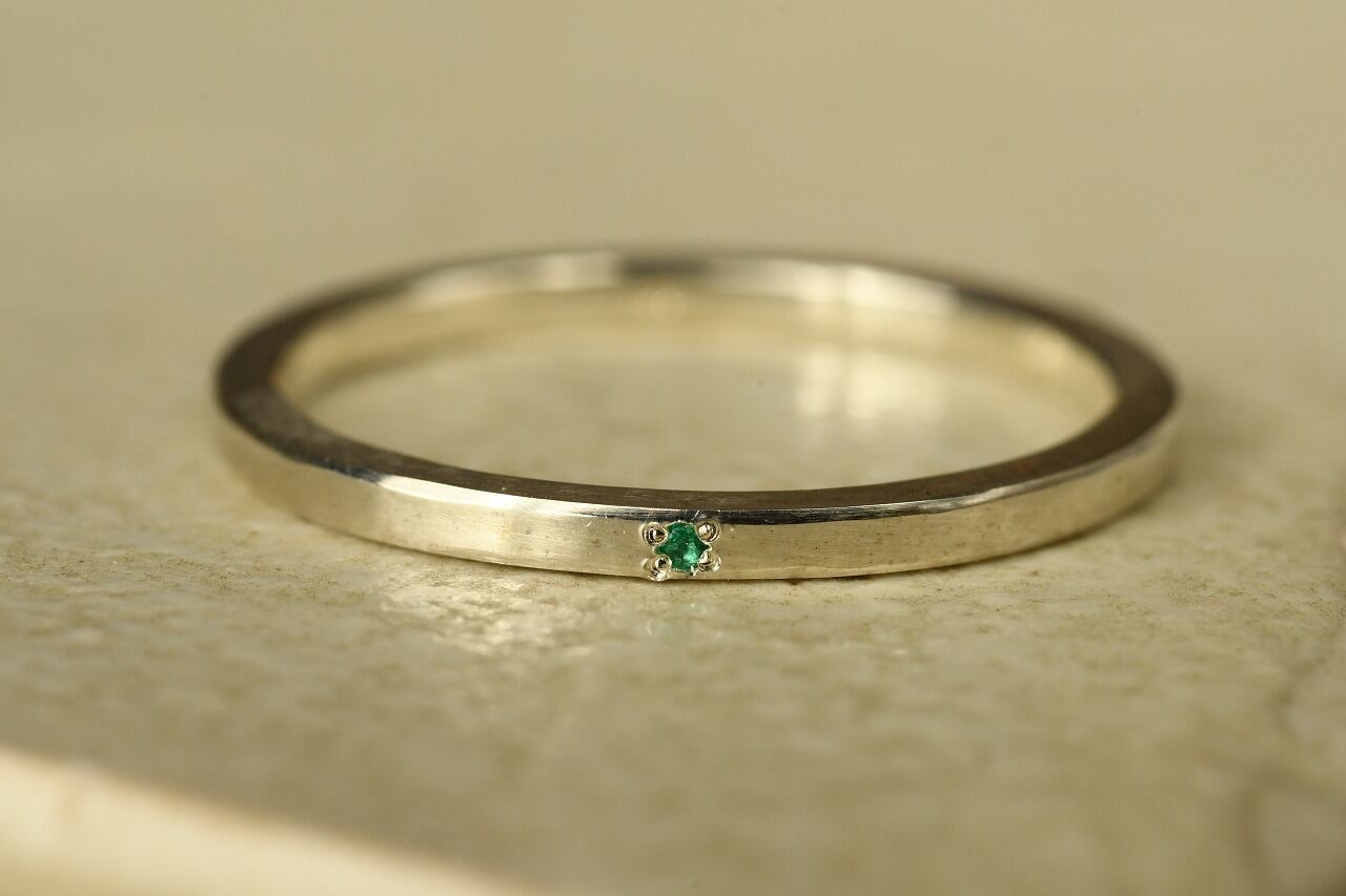 槌目も打っていないとてもシンプルなシルバーのリングに普段使用している石よりも一回り小さい小粒のエメラルドを一粒留めて制作を行いました。