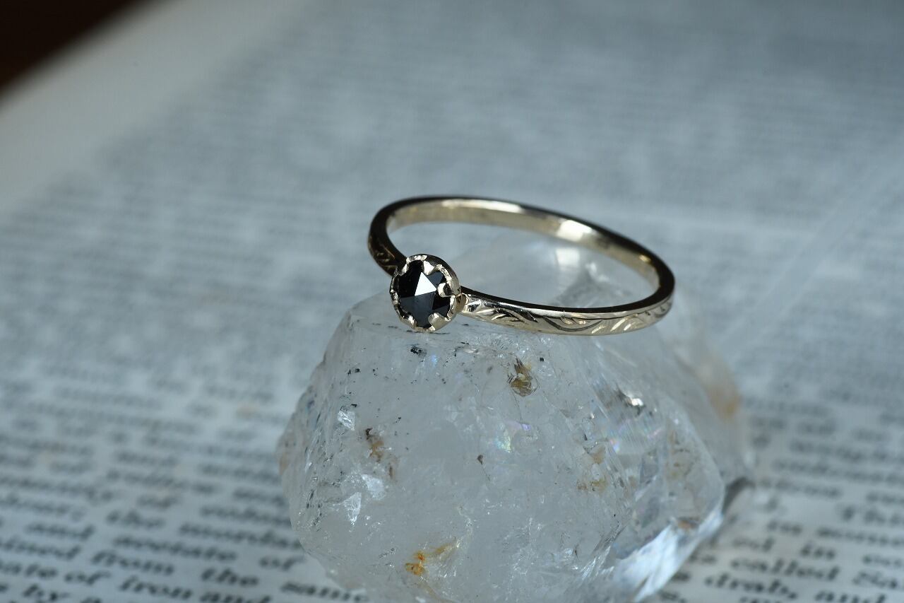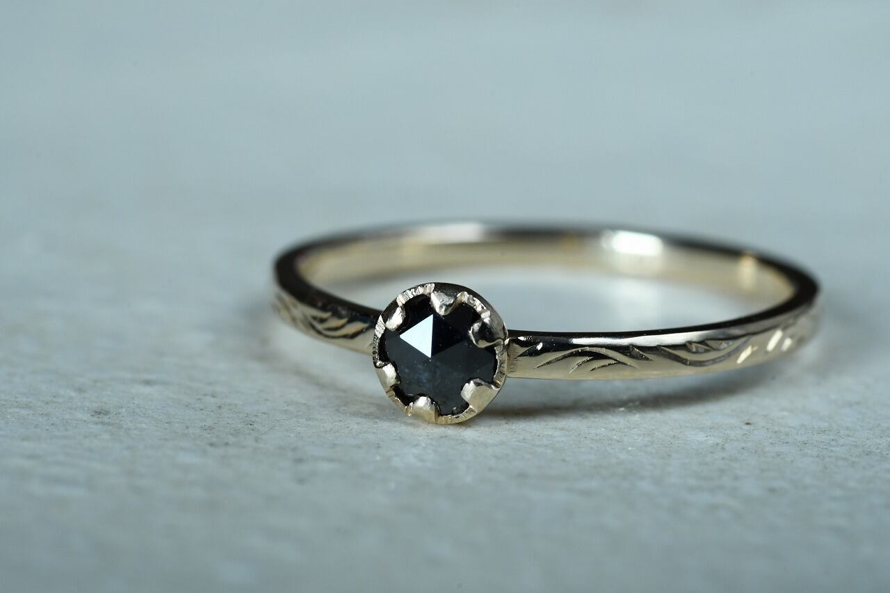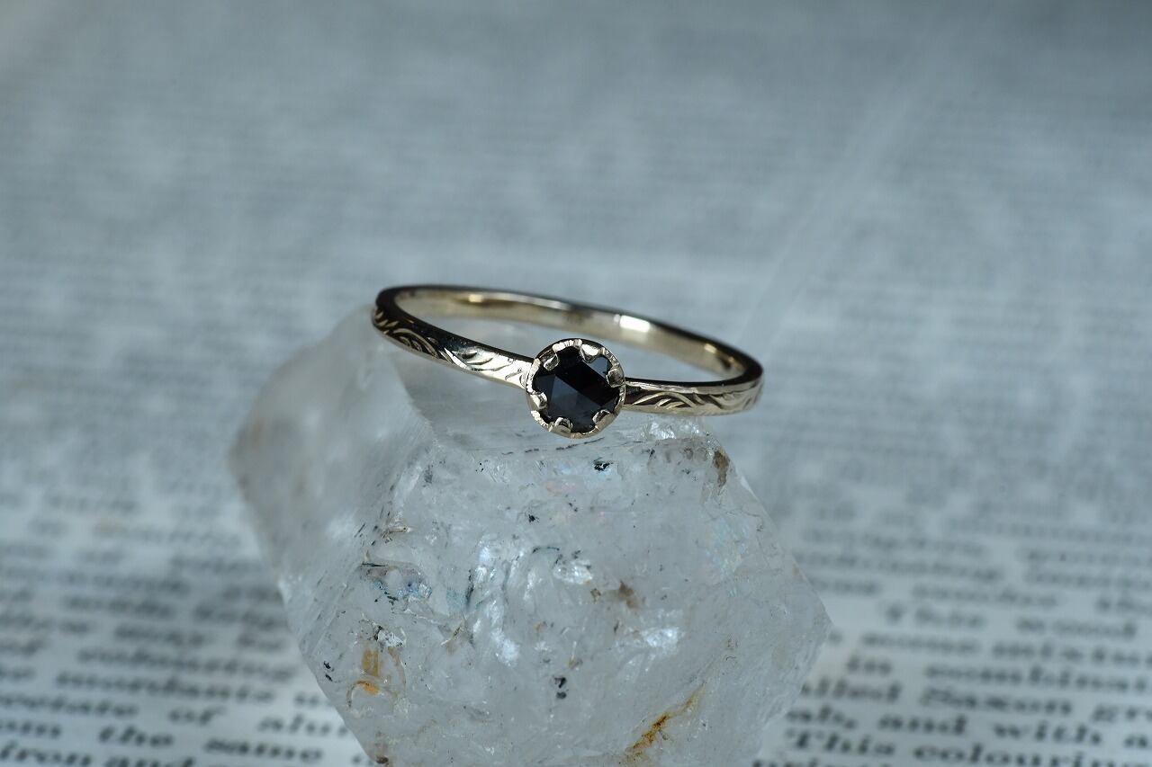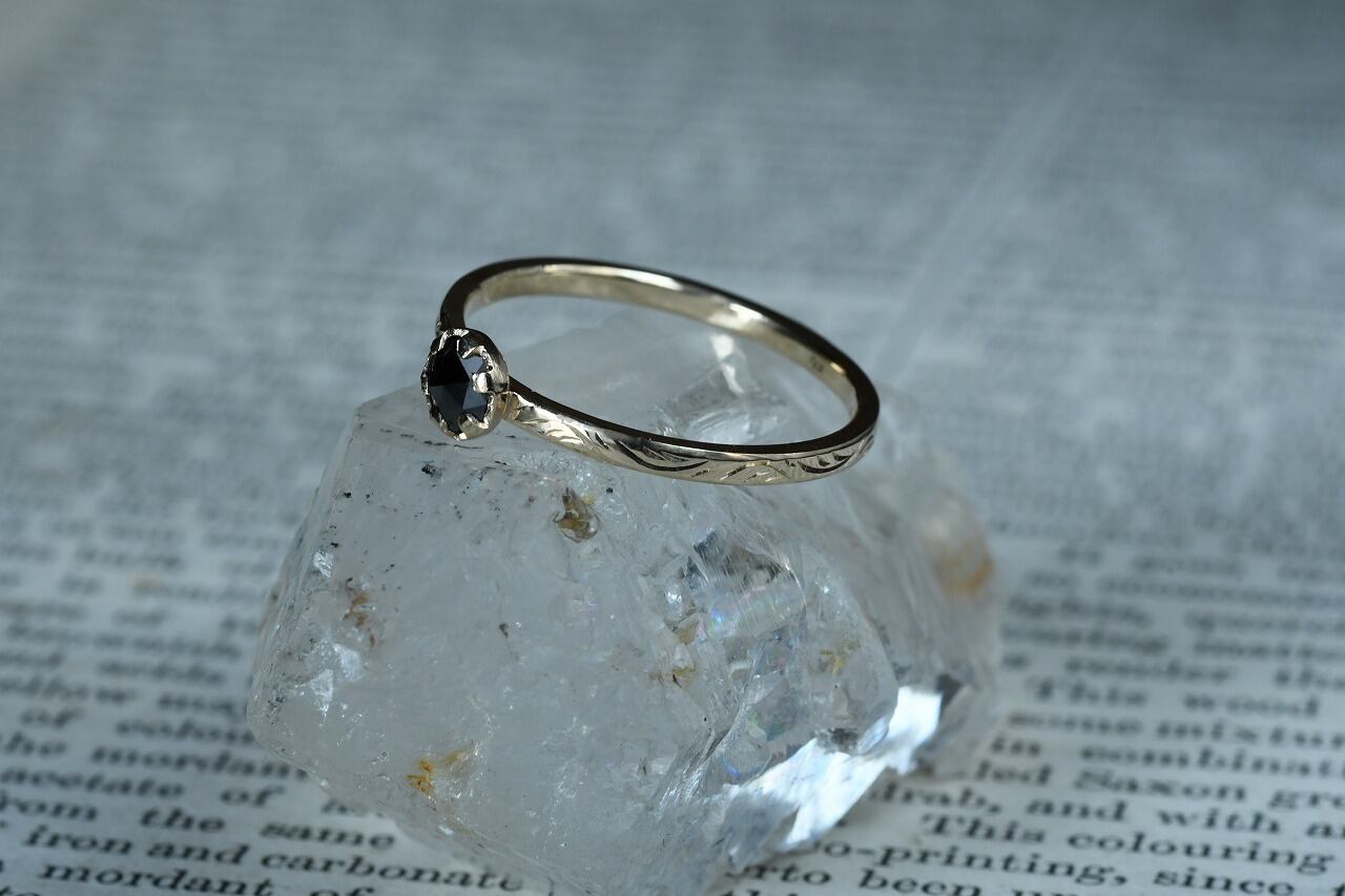 今回は久々のジュエリーシリーズの新作ということでブラックダイアモンドと10金の組み合わせのリングの制作になりました。アンティーク感を感じるローズカットの石の魅力を感じながらも一本一本手彫りで模様を彫っているリング部分の輝きの両方を楽しめる作品に仕上げることができました。