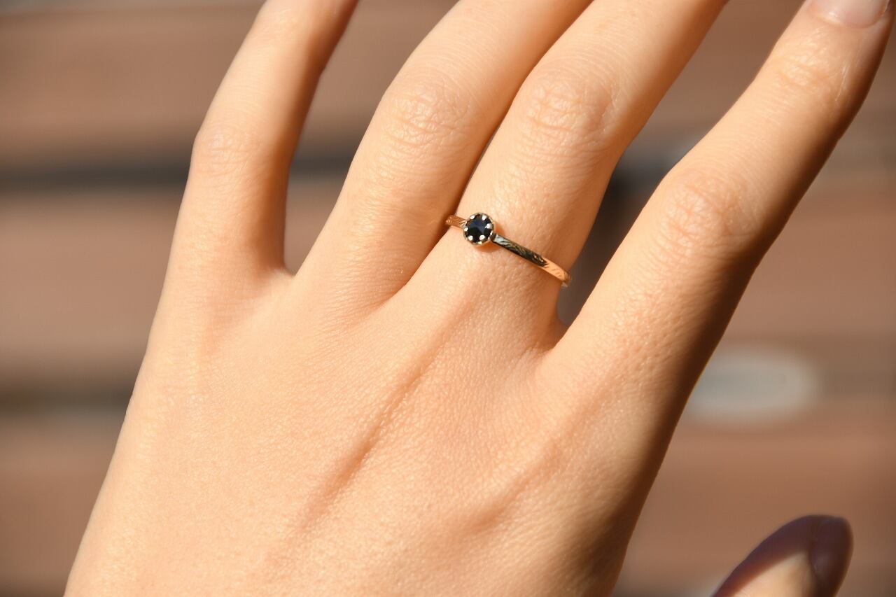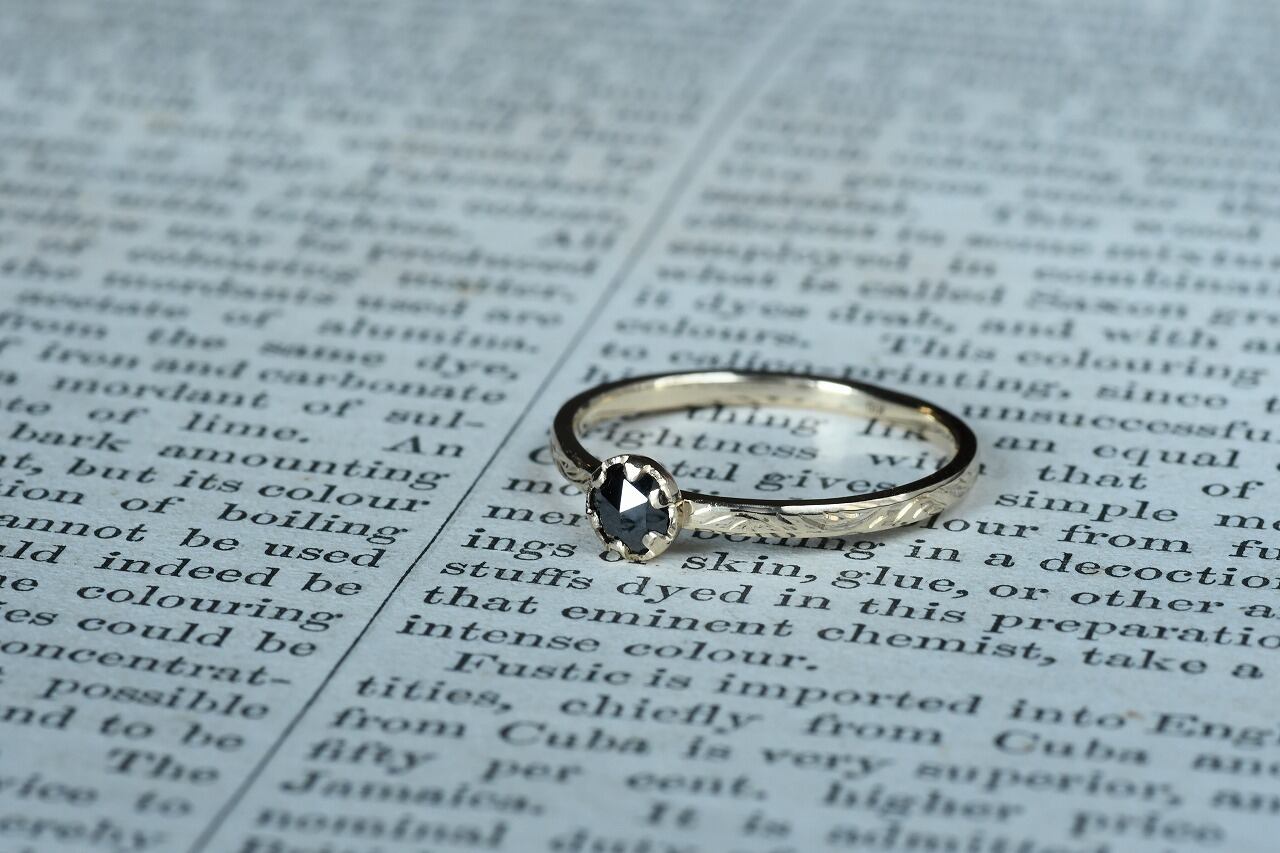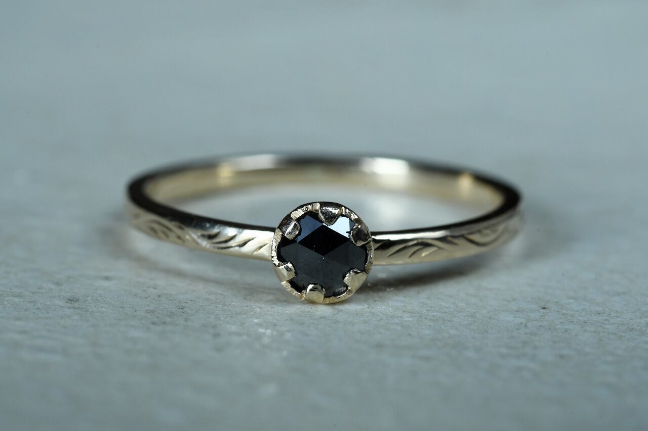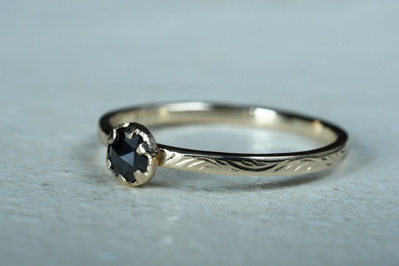 今回は久々のジュエリーシリーズの新作ということでブラックダイアモンドと10金の組み合わせのリングの制作になりました。アンティーク感を感じるローズカットの石の魅力を感じながらも一本一本手彫りで模様を彫っているリング部分の輝きの両方を楽しめる作品に仕上げることができました。