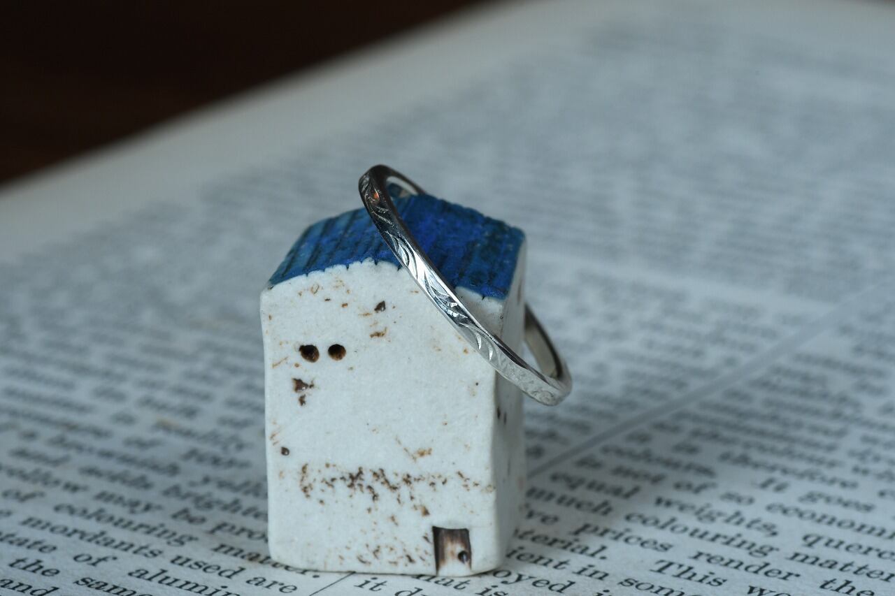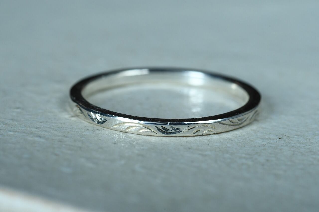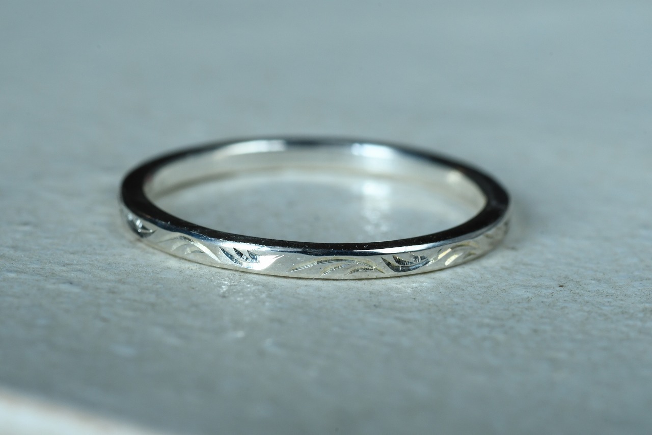 曲線の彫りを施すのに最適なリング幅に風に流れるような彫りを施して制作を行いました。