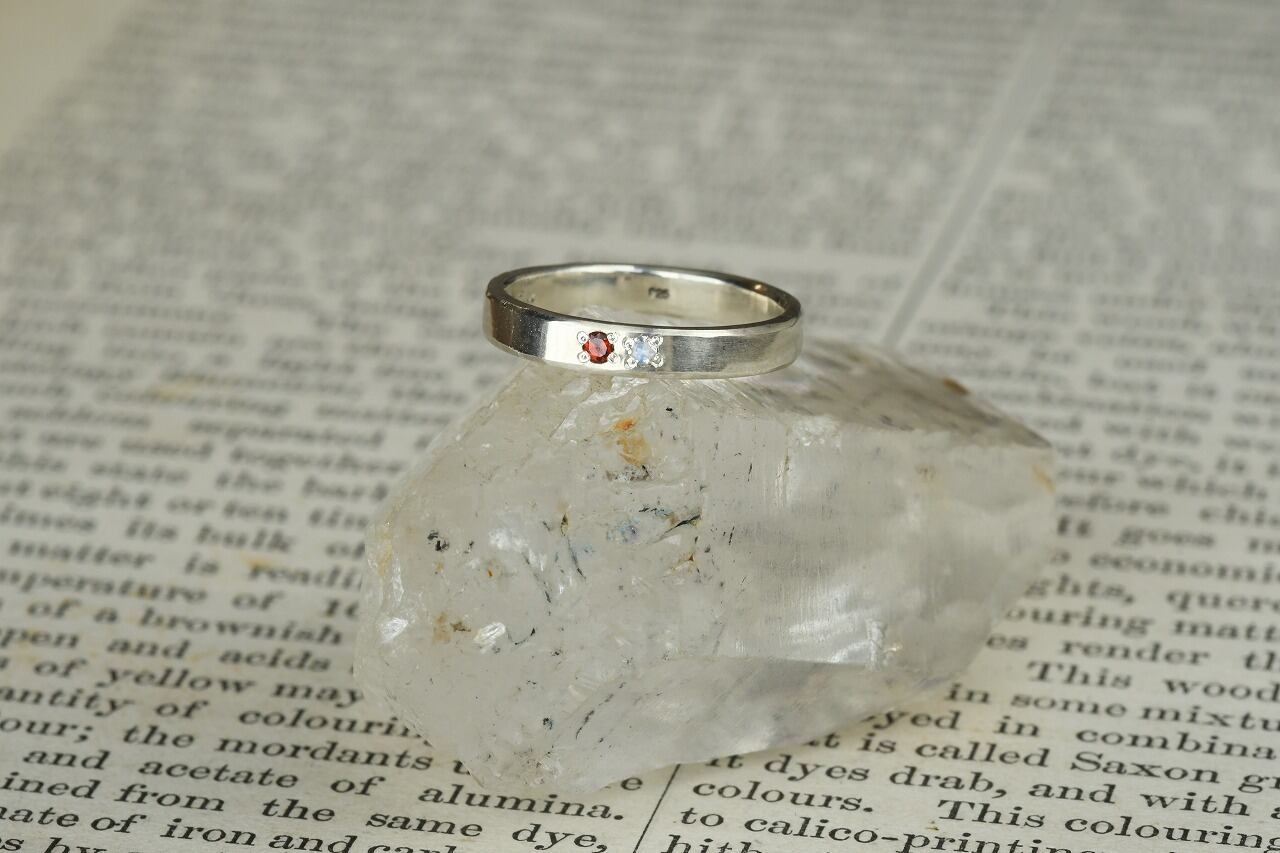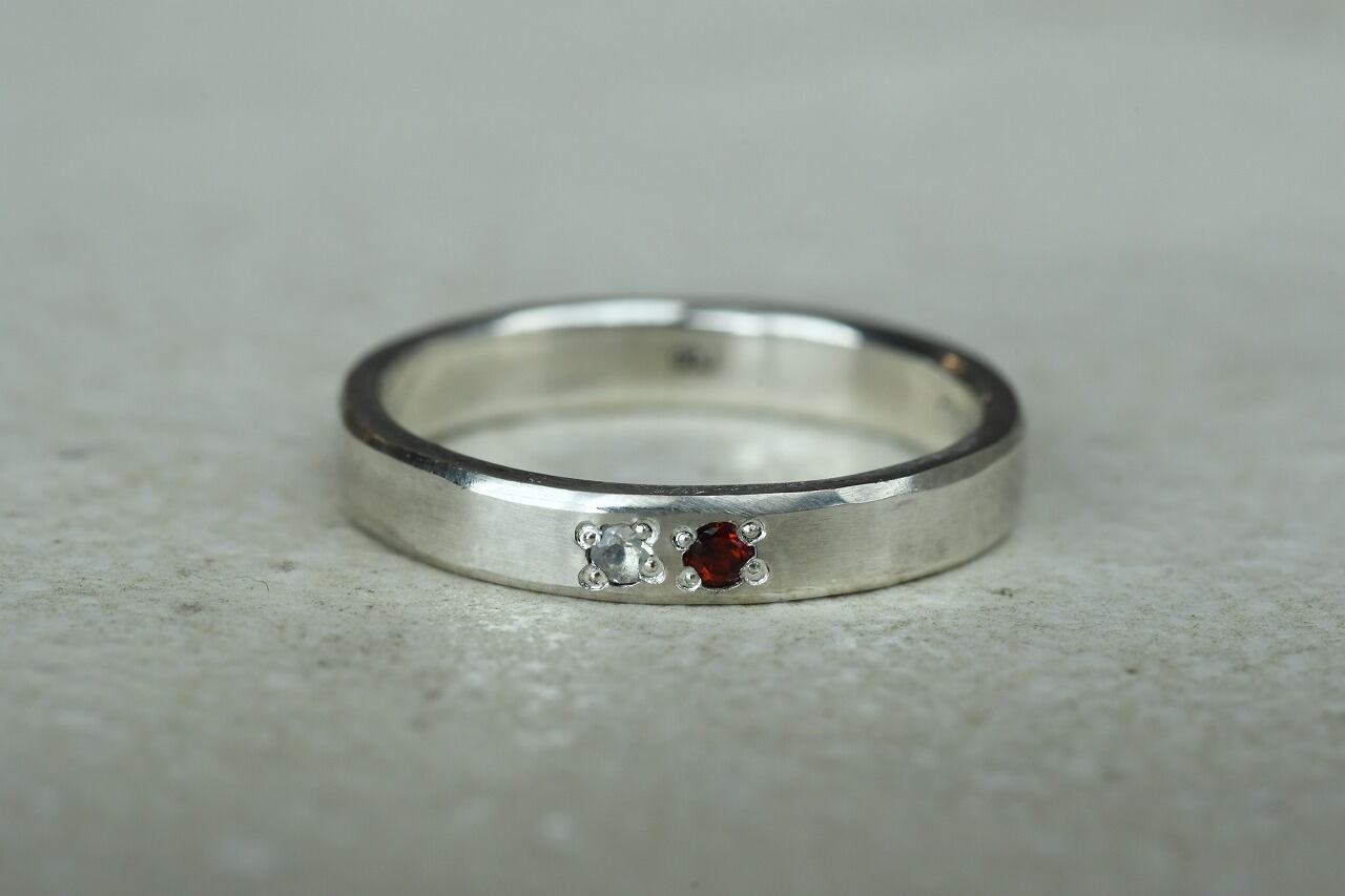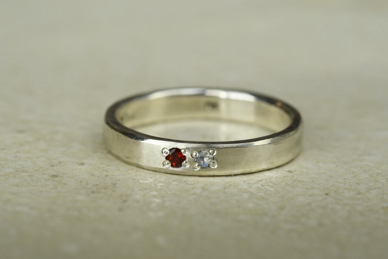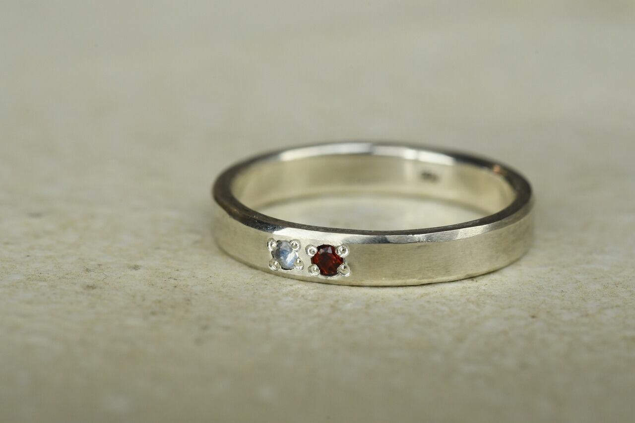シルバーのシンプルな平打ちリングにガーネットとブルームーンストーンを留めて制作を行いました。