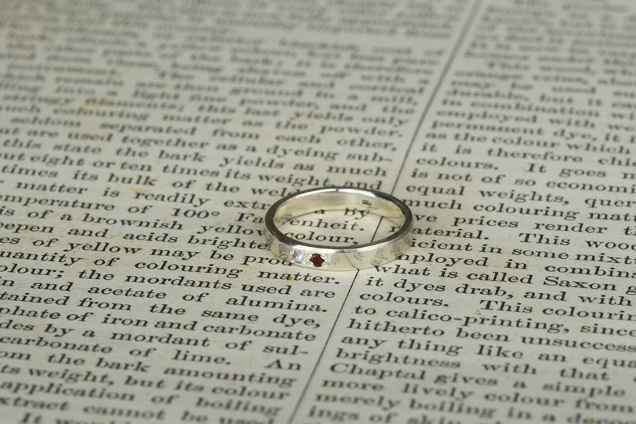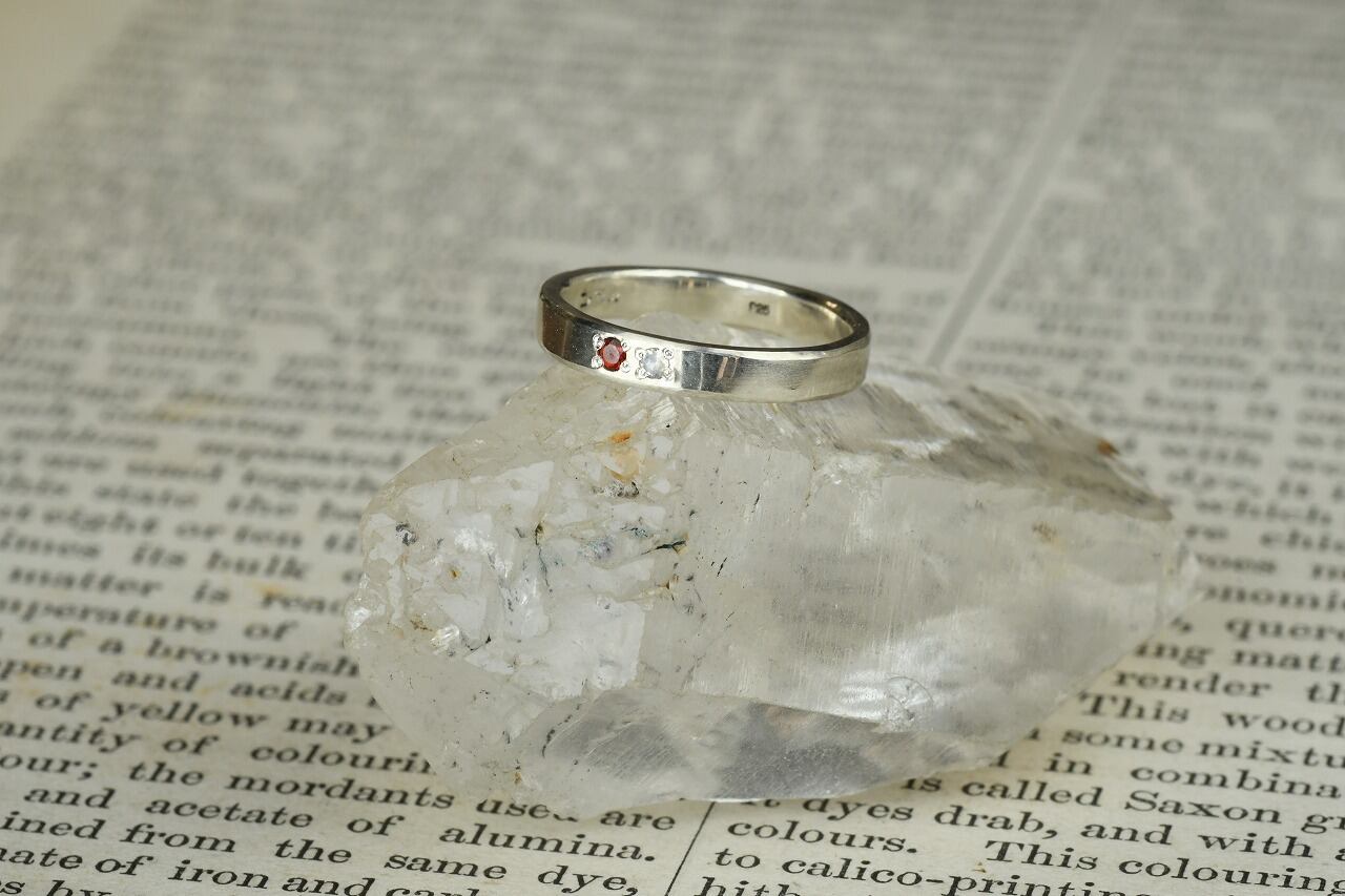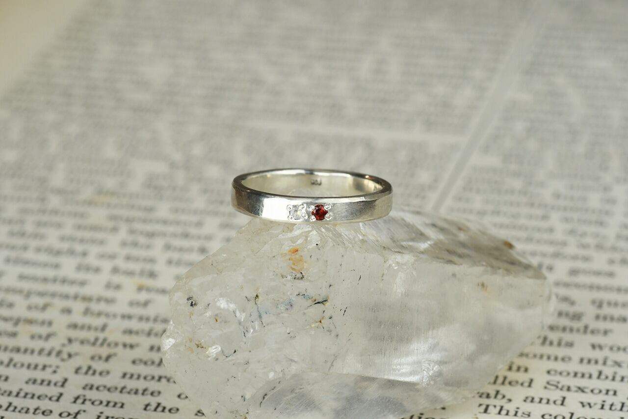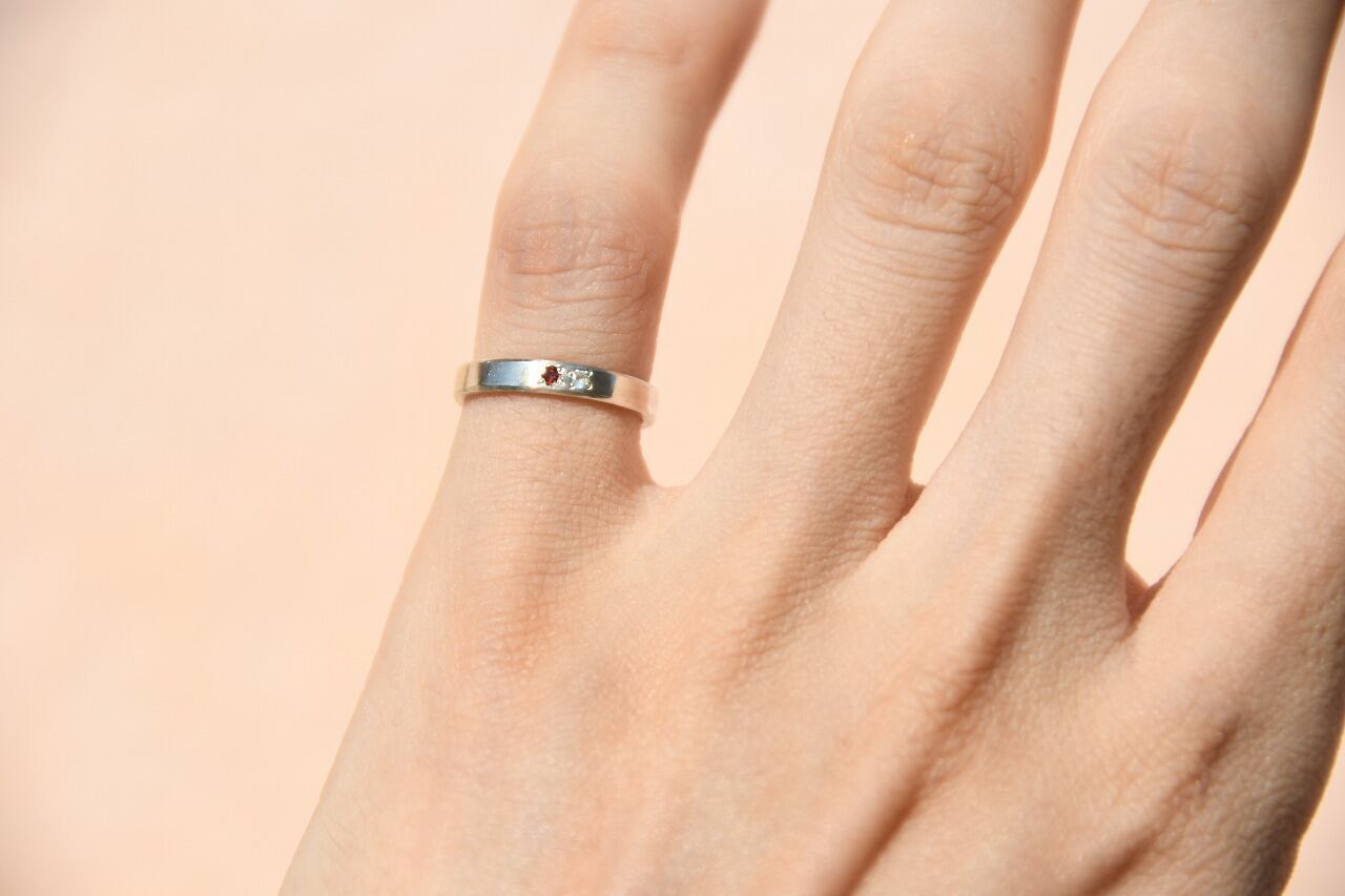 シルバーのシンプルな平打ちリングにガーネットとブルームーンストーンを留めて制作を行いました。