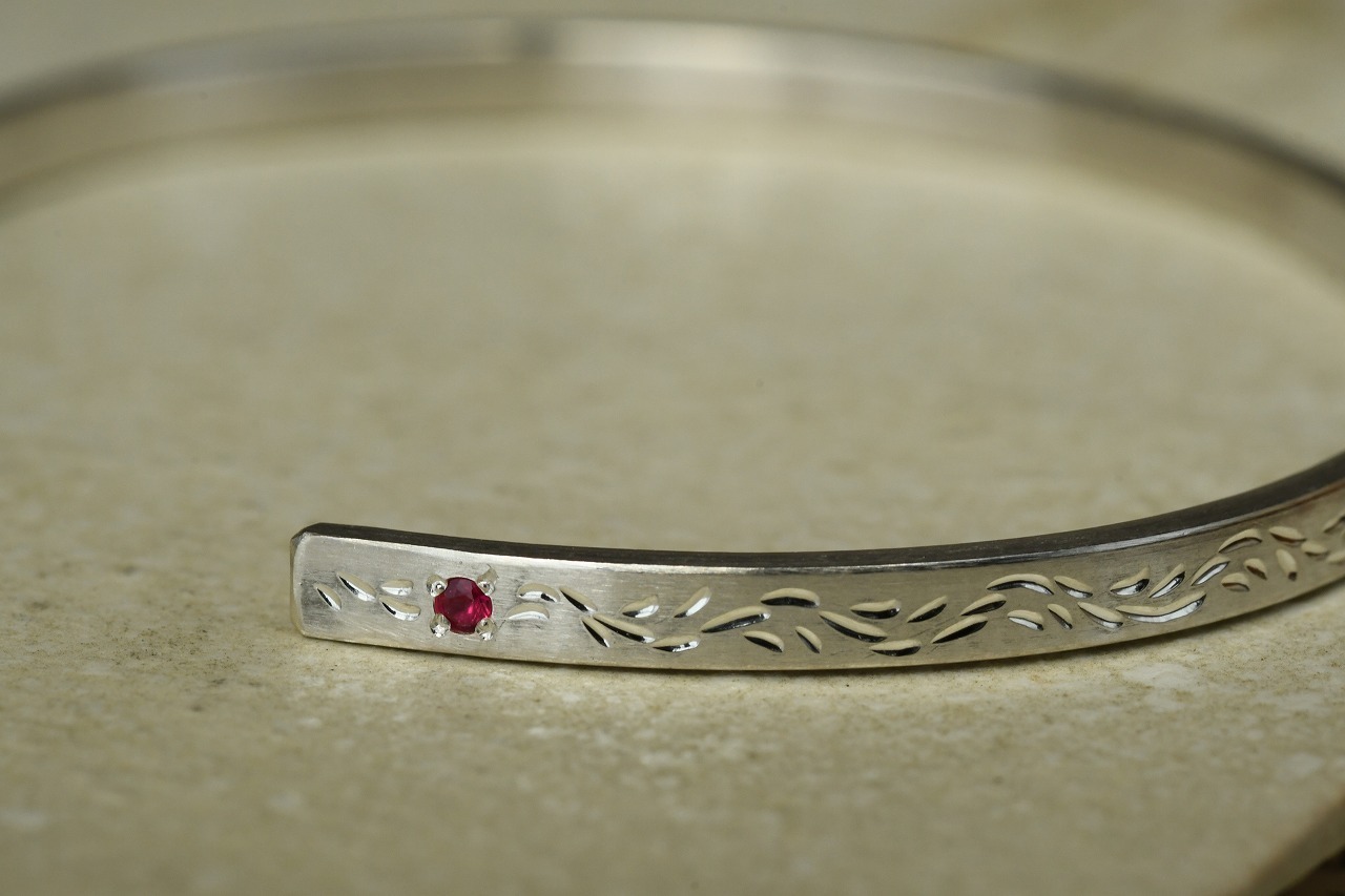 彫り部分は丸い切っ先の鏨を使って彫っているので通常の唐草などより丸みを帯びた優しい雰囲気に仕上がっているバングルで一粒添えた美しいルビーの輝きと一緒に楽しんでもらえたらとてもうれしいです。
