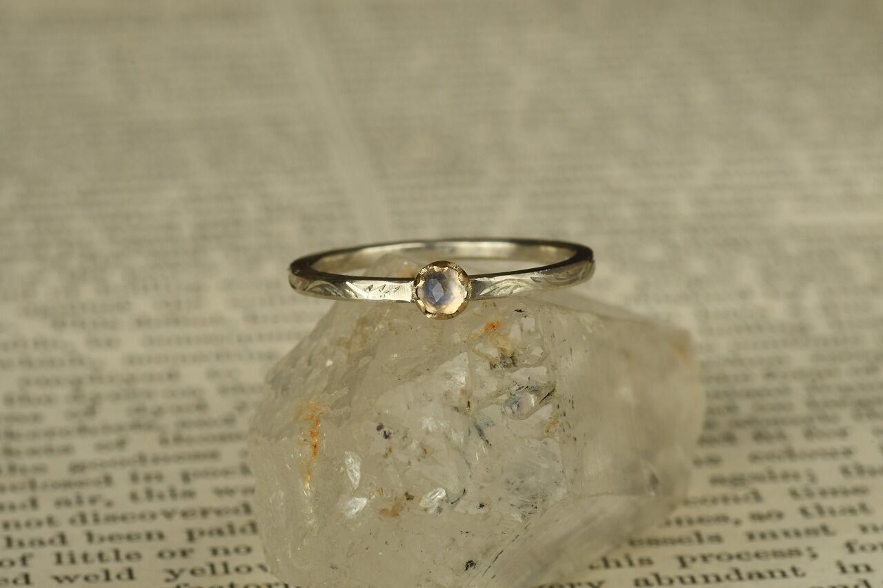 リング部分には風になびく草木をイメージした彫りをいれて、美しくも少し切ない光を放つローズカットのブルームーンストーンを10金で包んでみました。